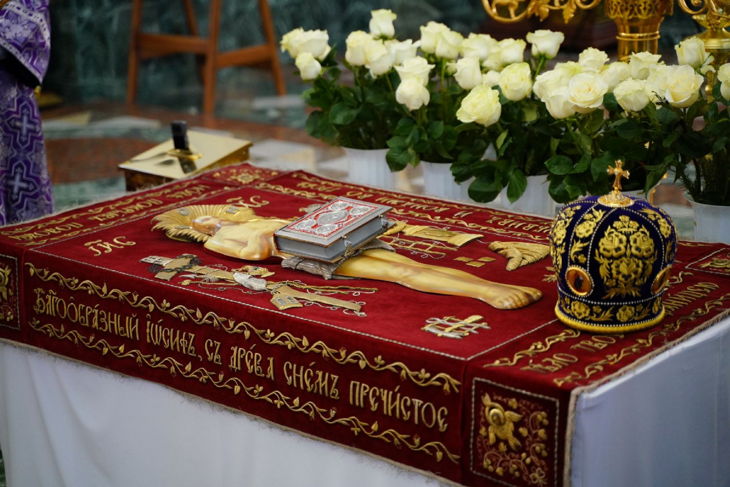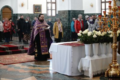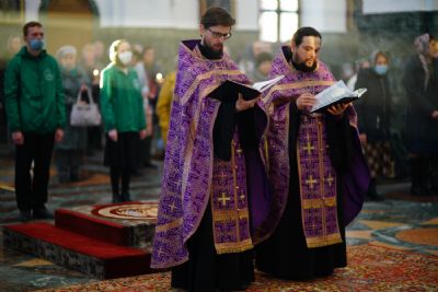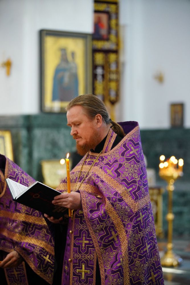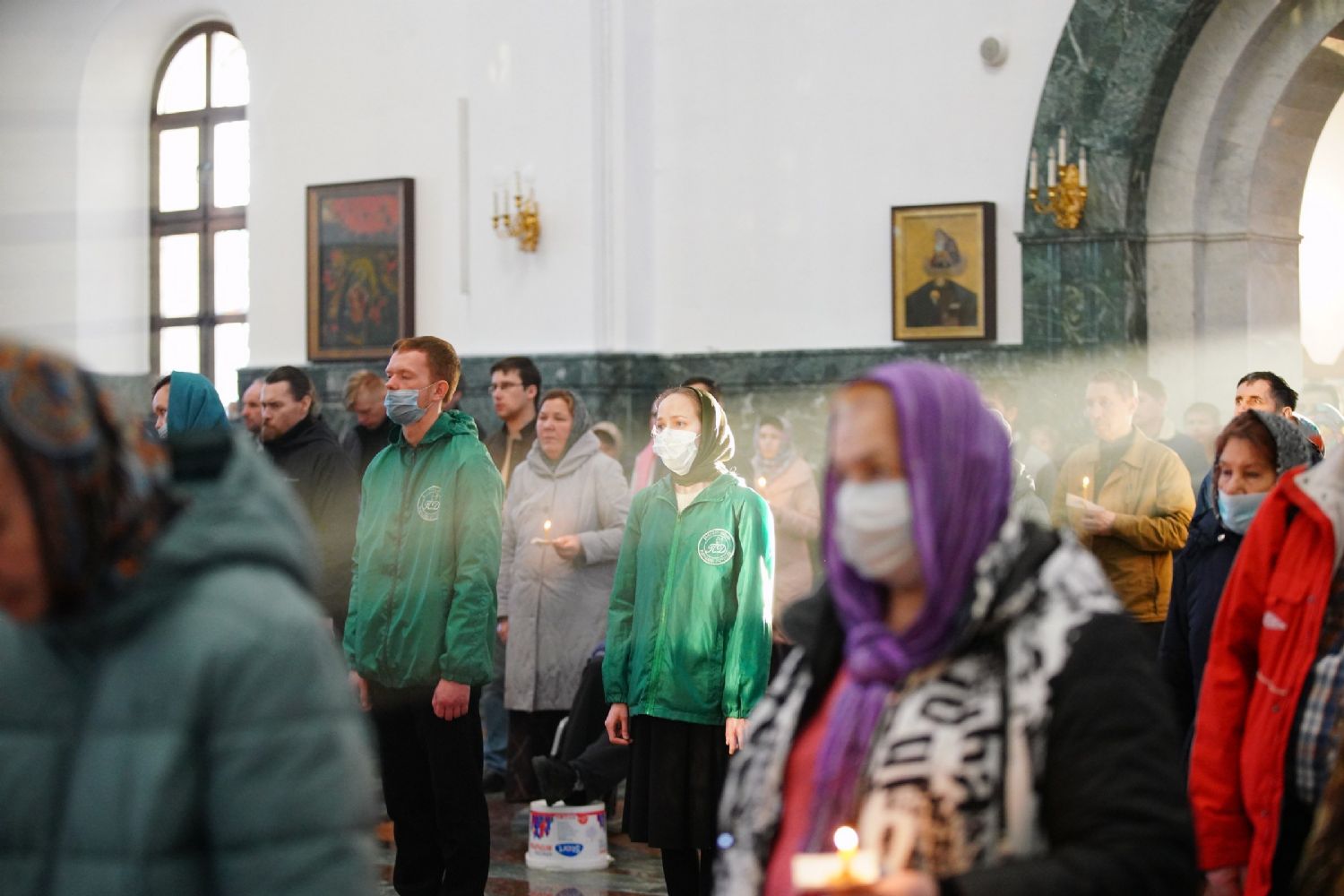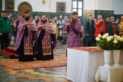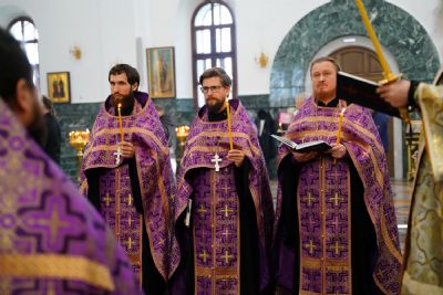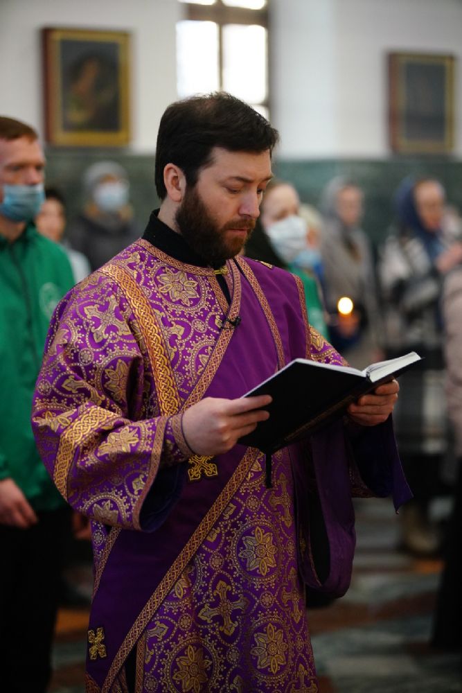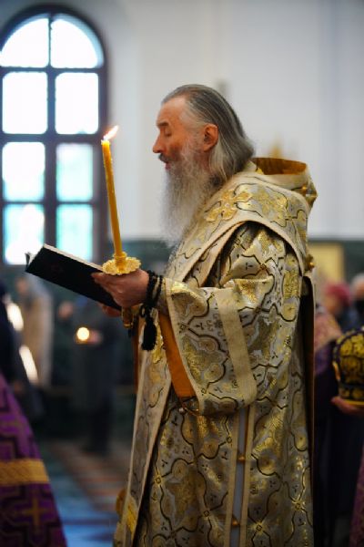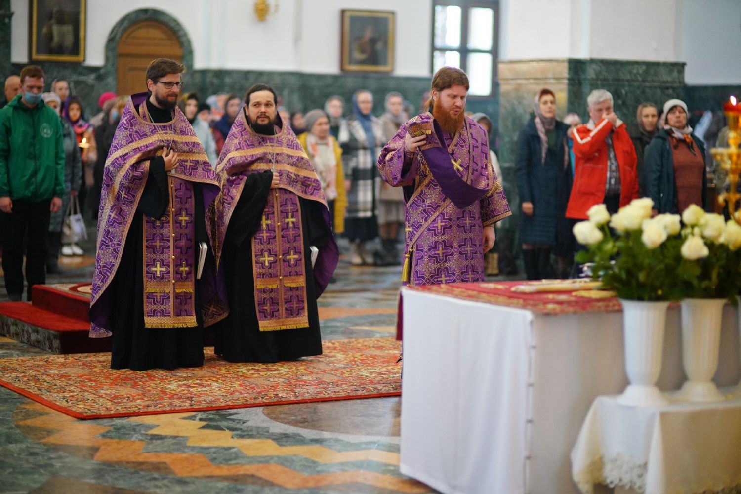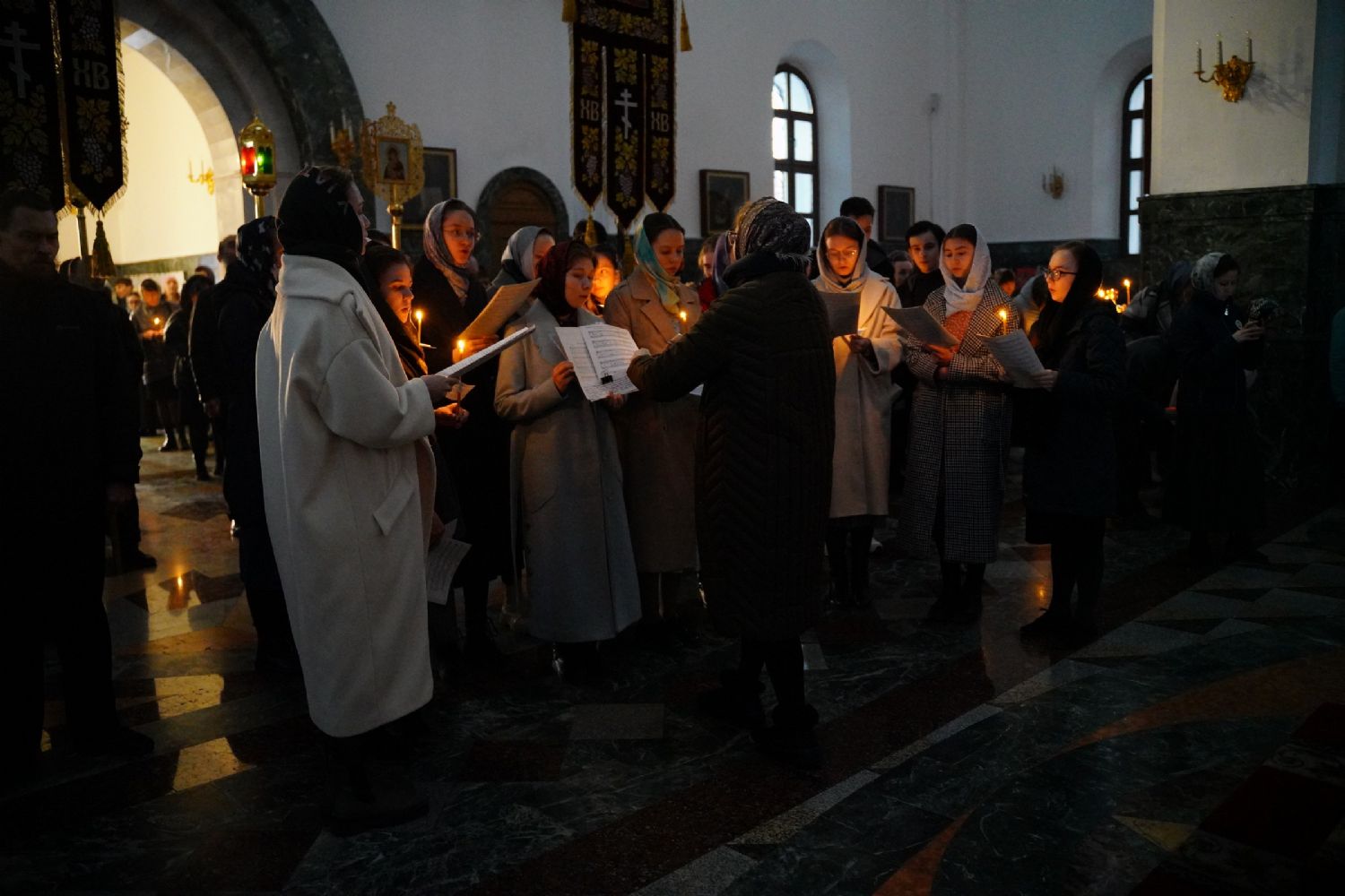 Его Высокопреосвященству сослужили ключарь кафедрального собора протоиерей Сергий Поглазов, протодиакон Михаил Козловский и клирики собора. Песнопения исполнял хор «Благовест» под руководством регента Татьяны Черновой.