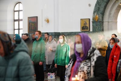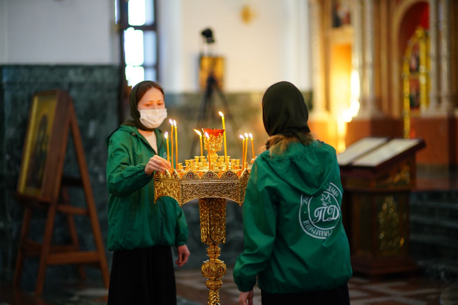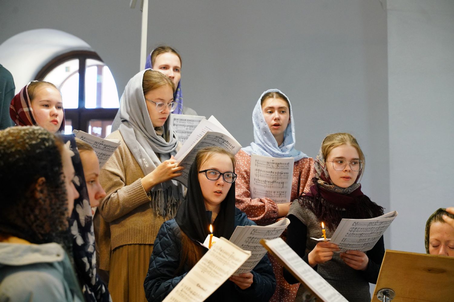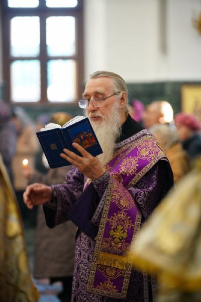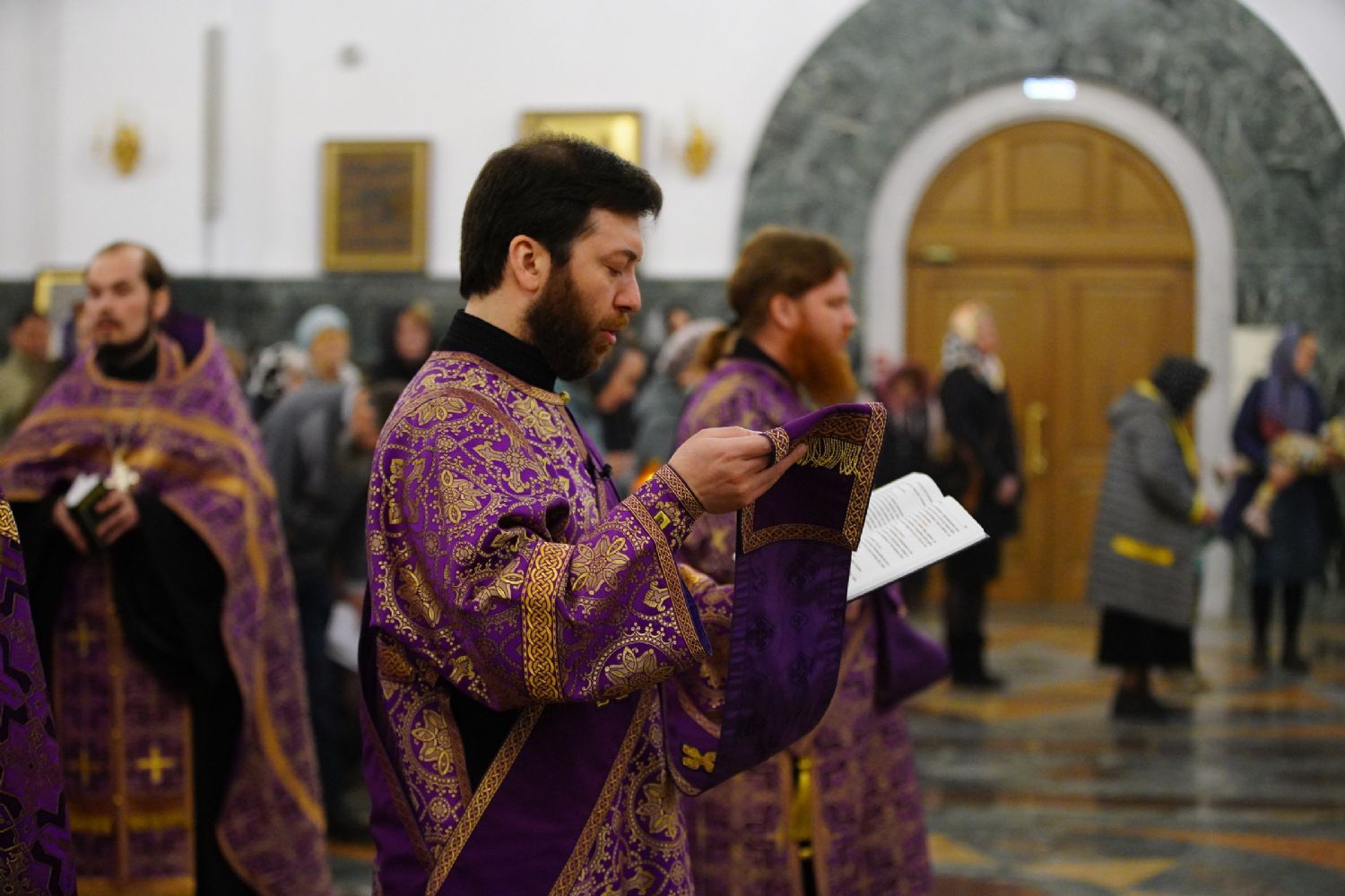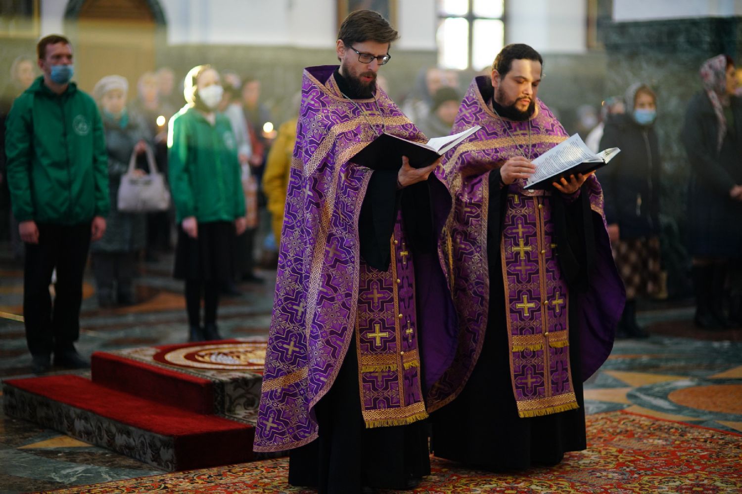 Его Высокопреосвященству сослужили ключарь кафедрального собора протоиерей Сергий Поглазов, протодиакон Михаил Козловский и клирики собора. Песнопения исполнял хор «Благовест» под руководством регента Татьяны Черновой.