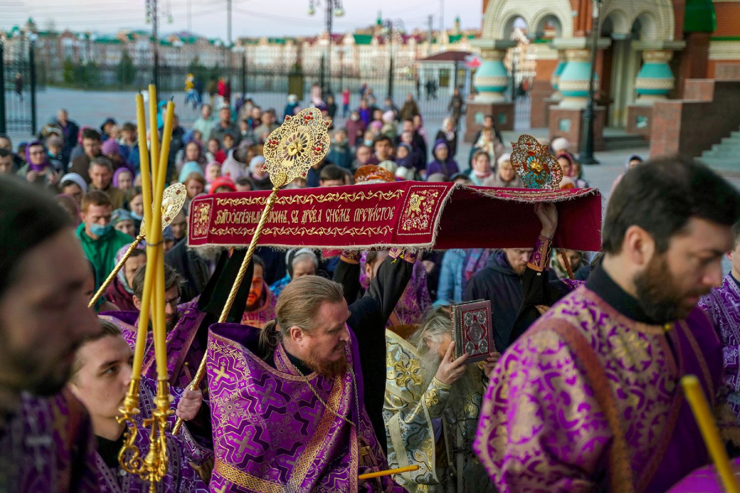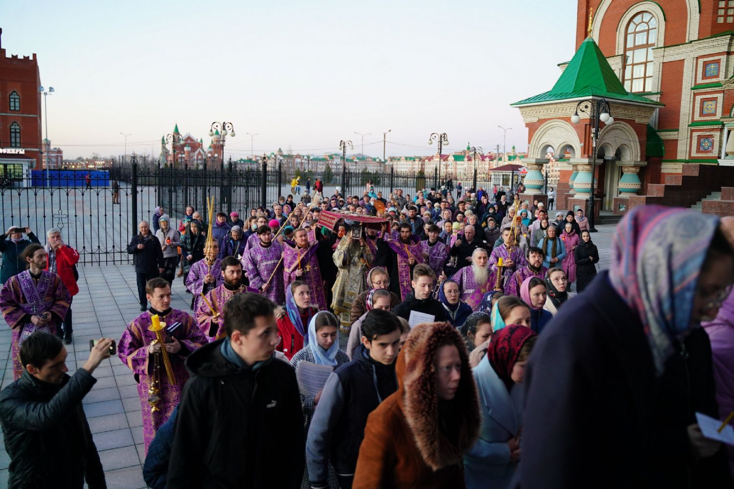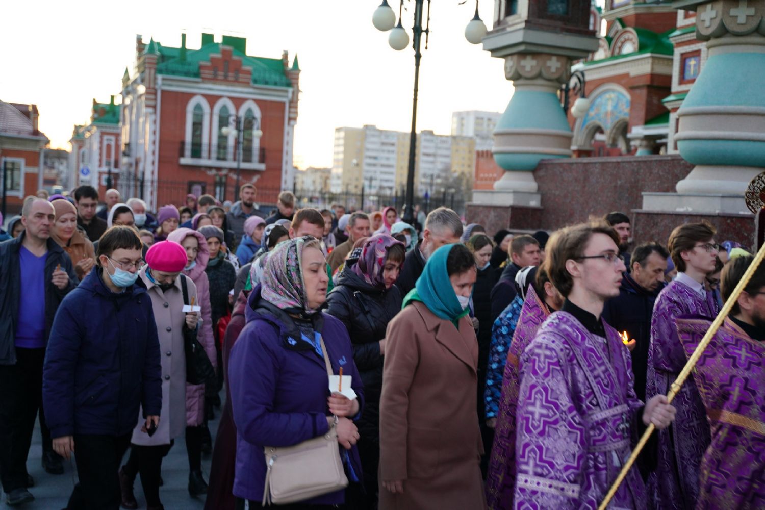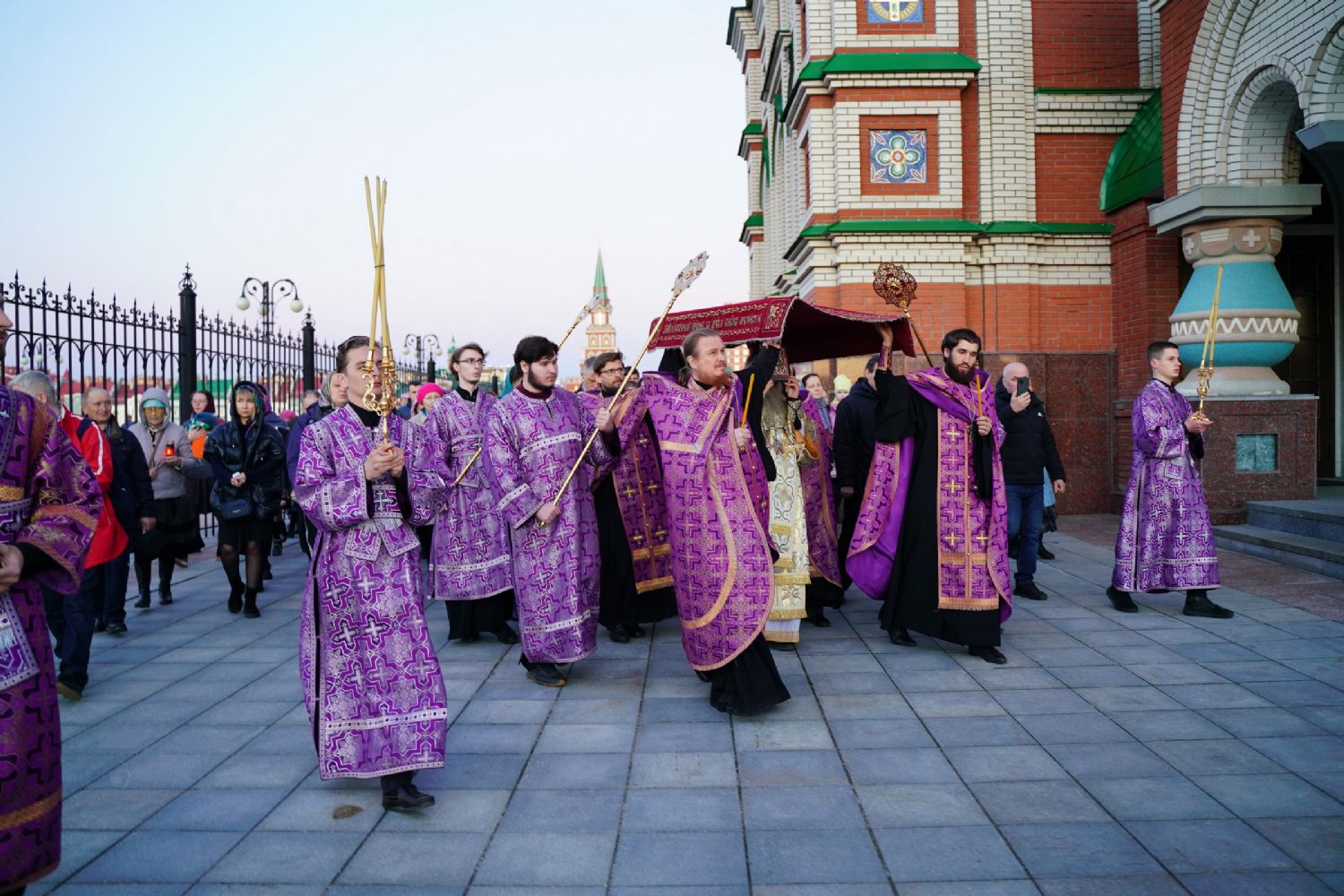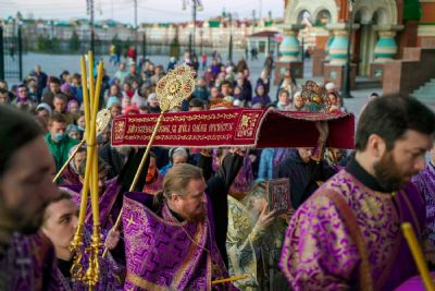 После канона и великого славословия при пении «Святый Боже» и погребальном перезвоне колоколов Плащаница крестным ходом была обнесена вокруг храма в воспоминание погребения Христова, сошествия Его во ад и победы над смертью.