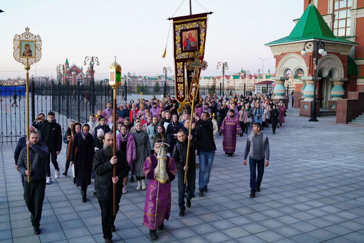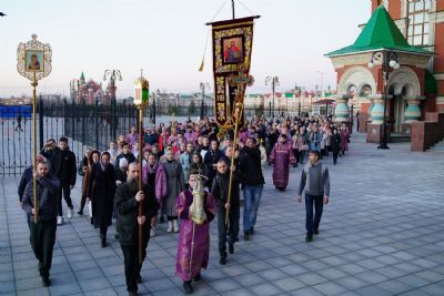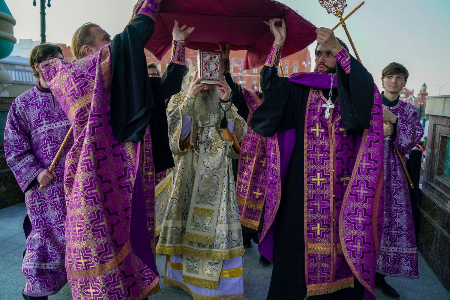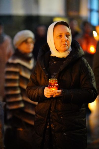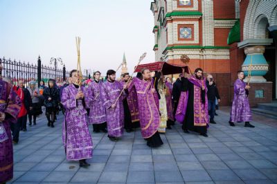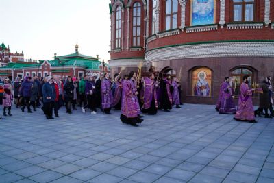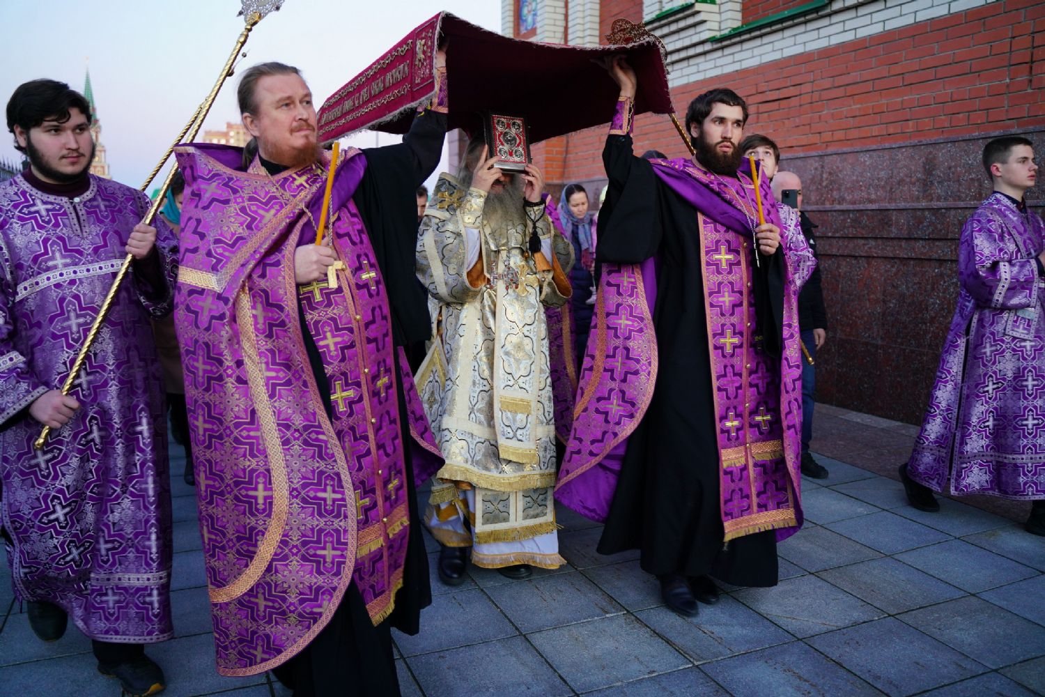 После канона и великого славословия при пении «Святый Боже» и погребальном перезвоне колоколов Плащаница крестным ходом была обнесена вокруг храма в воспоминание погребения Христова, сошествия Его во ад и победы над смертью.