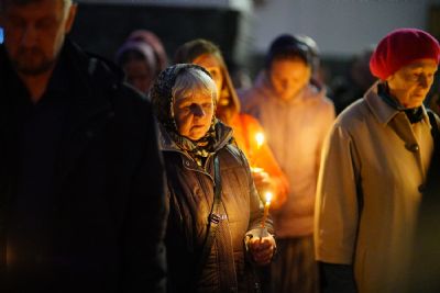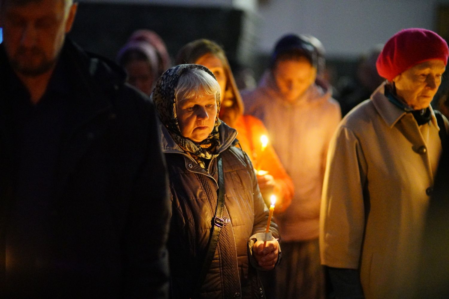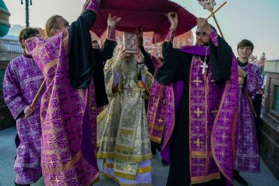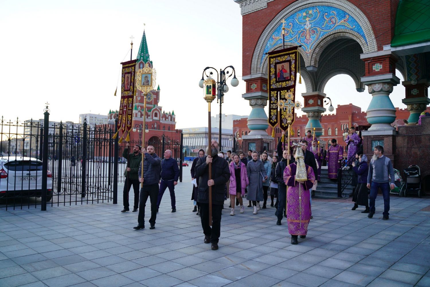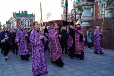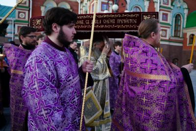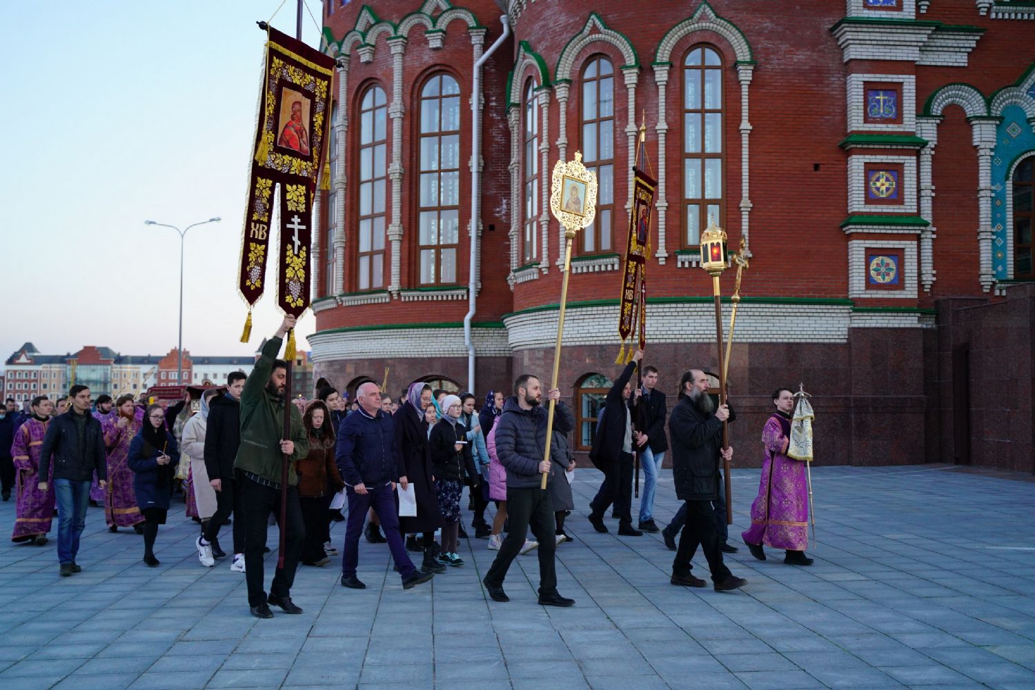 После канона и великого славословия при пении «Святый Боже» и погребальном перезвоне колоколов Плащаница крестным ходом была обнесена вокруг храма в воспоминание погребения Христова, сошествия Его во ад и победы над смертью.
