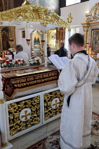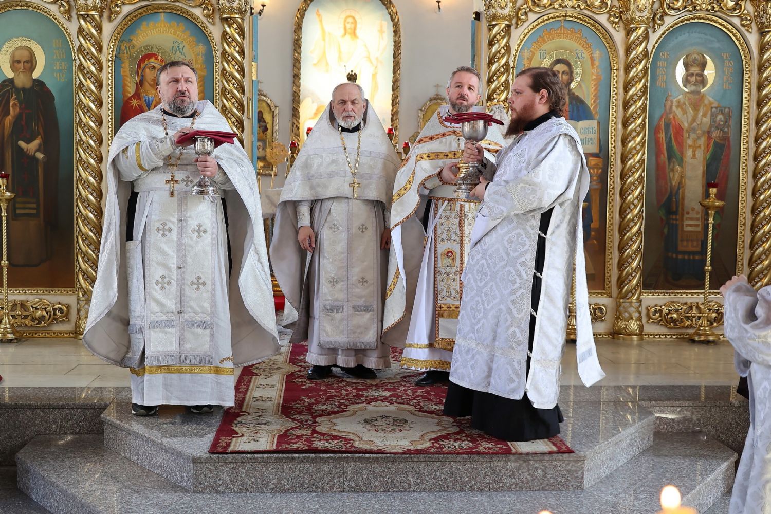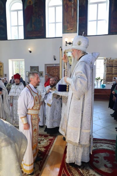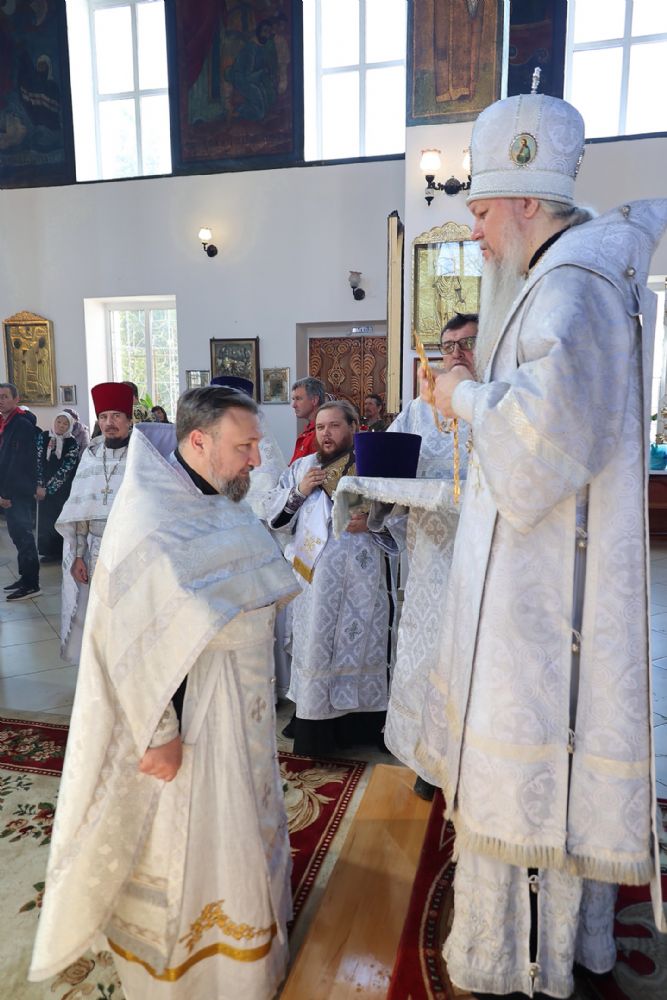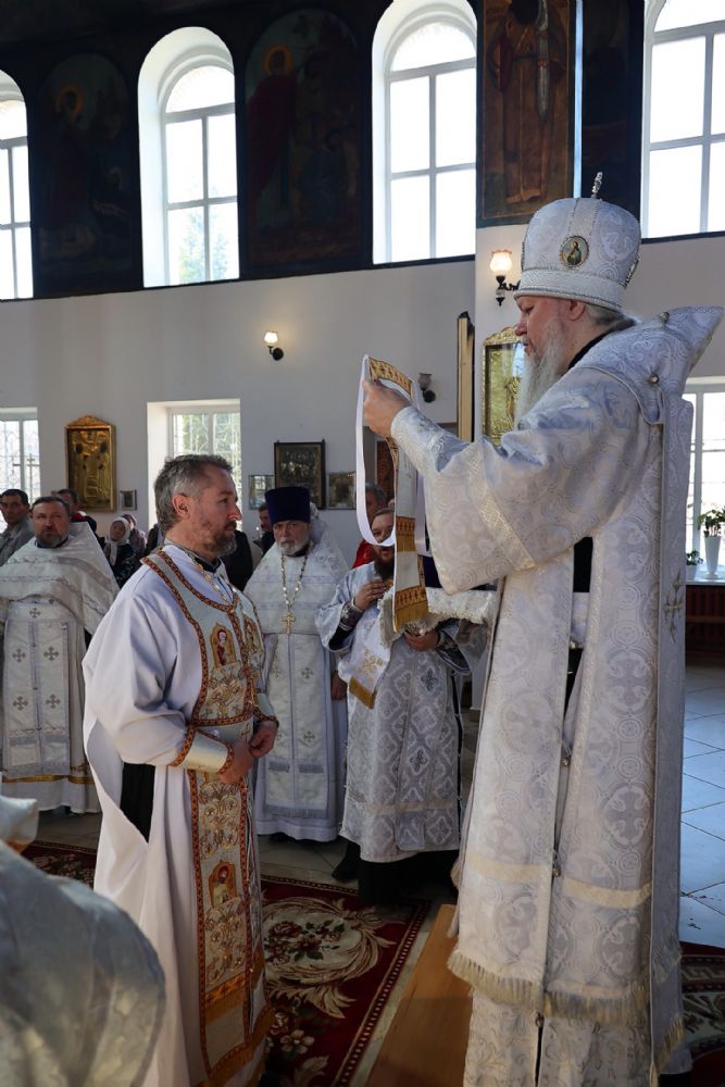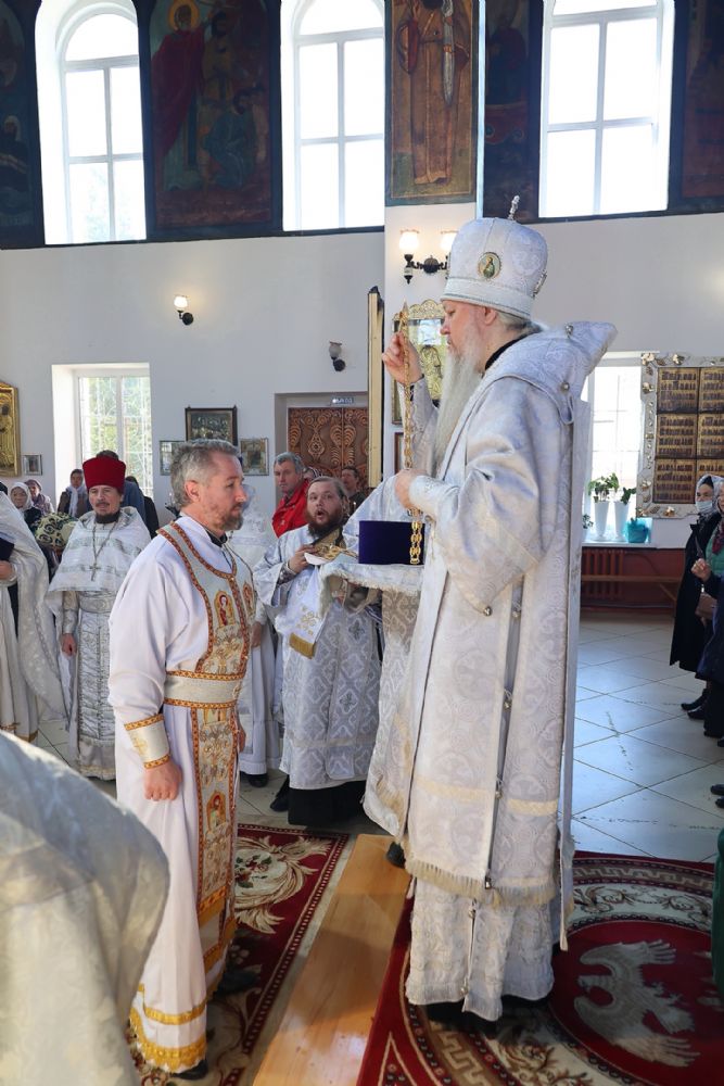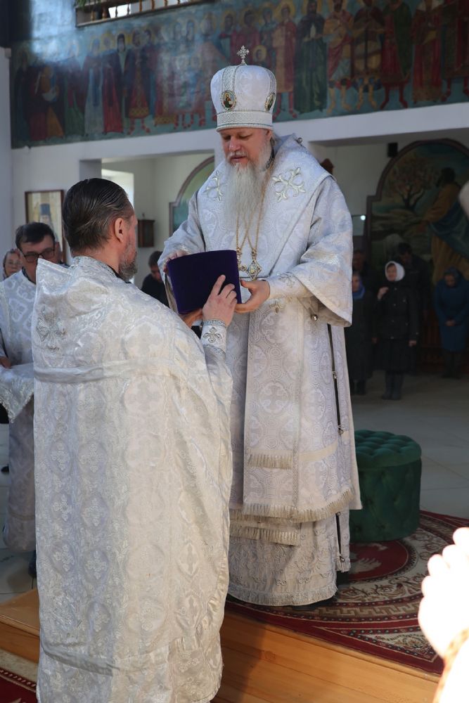 За малым входом епископ Феофан наградил протоиерея Иоанна Лапшинского правом ношения ношения наперсного креста золотого цвета, иеромонаха Авеля (Крашенинникова) правом ношения набедренника и наперсного креста золотого цвета, иерея Сергия Першакова правом ношения камилавки.