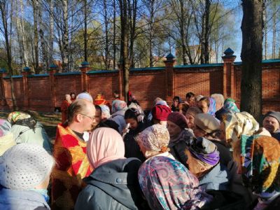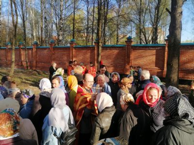 После акафиста верующие прошли крестным ходом вокруг храма. Владыка еще раз поздравил всех с продолжающимся праздником Пасхи и щедро окропил собравшихся святой водой.