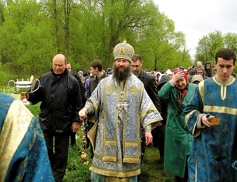 После Литургии, по обычаю, был совершен крестный ход на источник. Пасмурное небо и моросящий дождик не помешали Владыке обильно кропить молящихся святой водой, исцеляющей душевные и телесные недуги.
