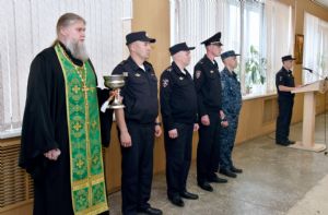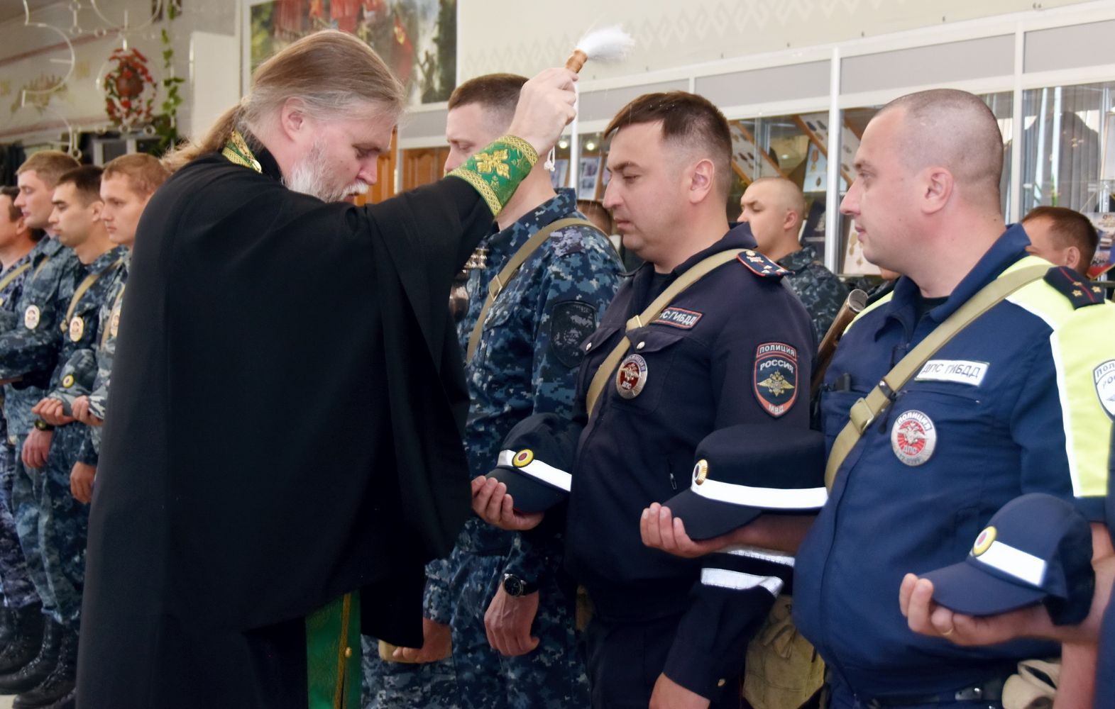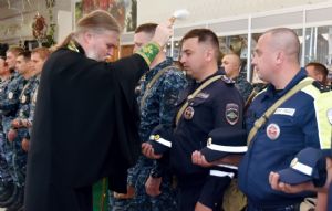 Представитель Общественного совета при МВД, руководитель епархиального отдела по взаимодействию с правоохранительными органами и вооруженными силами протоиерей Александр Бачурин пожелал полицейским душевного мира, светлых помыслов и мужества при выполнении задач на благо Отечества. После этого священник окропил каждого сотрудника святой водой и вручил им в благословение иконы святого Георгия Победоносца.