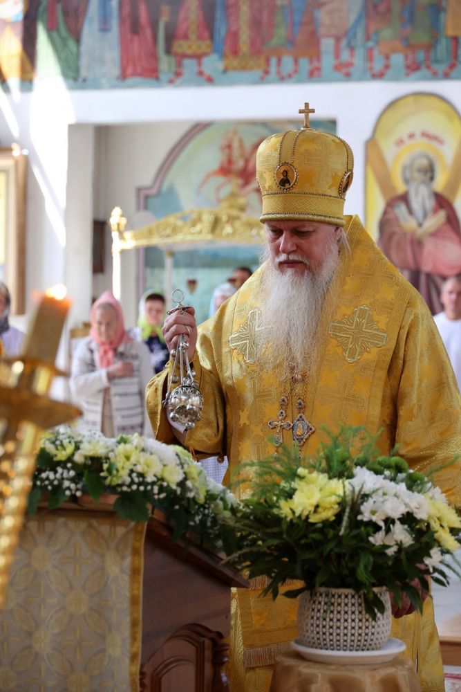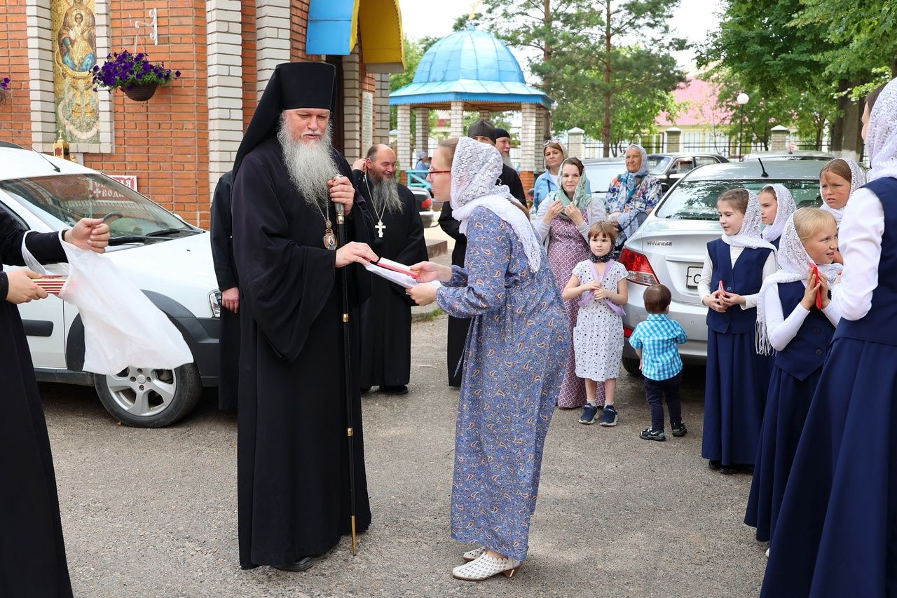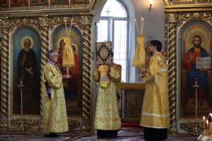 По заамвонной молитве было совершено славословие святителю Феофану. По окончании Литургии глава епархии обратился к собравшимся с архипастырским словом, напомнив празднуемое в этот день событие – перенесение в 2002 году мощей святителя Феофана Затворника Вышенского из приходского храма преподобного Сергия Радонежского с. Эммануиловка Рязанской области в Вышенский Успенский монастырь, где святитель нес подвиг затвора и молитвы за весь мир и написал множество духовных трудов.