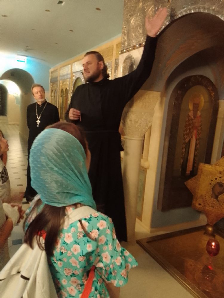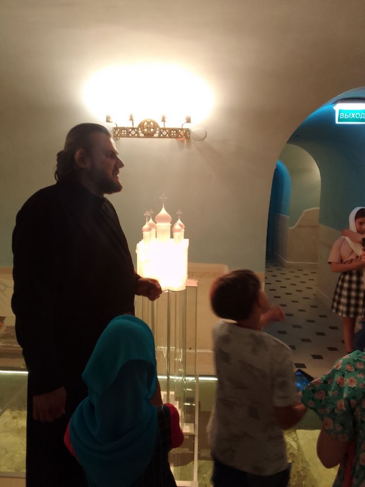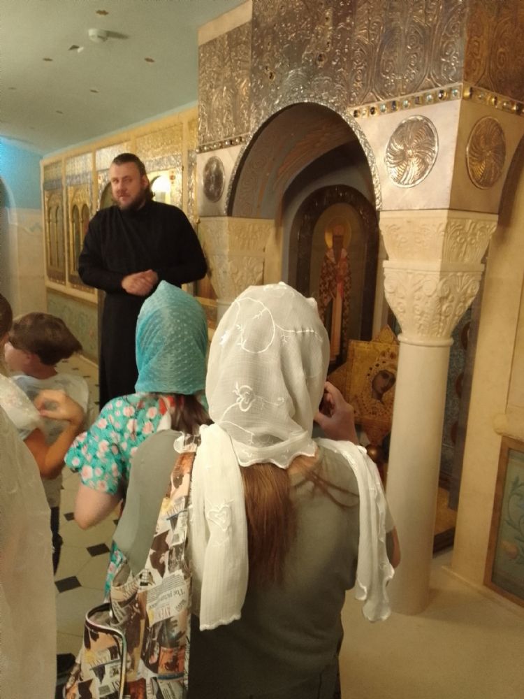 Далее мы неприметной дверцей в цоколе прошли в подземный Пещерный храм, посещение которого и было главной целью нашей паломнической поездки. Послушник Даниил порадовал нас интересным, захватывающим рассказом: почему эта часть собора получила название "Пещерный храм" и что послужило причиной его создания. На самом деле, никаких пещер в обычном значении слова здесь нет. Это вполне привычное для многих зданий подвальное помещение, очень просторное.