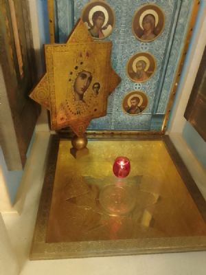 Мы увидели, что стены сохранили исторические фрагменты. Восстановлены иконостасы и большие иконы в арочных проёмах. А вот и святое место с сенью и иконостасом, где и была, по преданию, обретена чудотворная икона. Каждый из нас внимательно разглядывал это святое место. Далее мы увидели икону императорской семьи Романовых, которая оформлена в едином стиле. Царские врата, ведущие в алтарь, выполнены довольно миниатюрными и встроены в один из арочных проёмов.