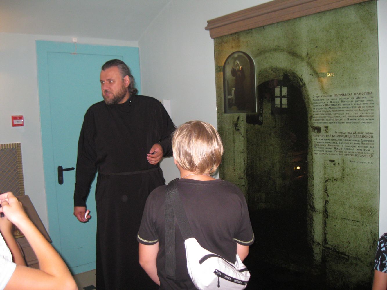 Батюшка кратко рассказал нам об истории монастыря. Монастырь стоит на месте, где, по преданию, в 1579 году была обретена Казанская икона Божией Матери – одна из наиболее чтимых икон Русской Православной Церкви. Совсем недавно на месте обретения святыни на старом историческом фундаменте был воссоздан величественный собор Казанской иконы Божией Матери.
