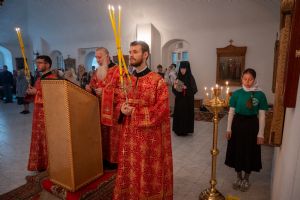 Владыке сослужили секретарь Йошкар-Олинского епархиального управления иеромонах Серафим (Пасанаев), клирик монастыря иерей Михаил Лежнин, настоятель Покровского храма с. Чкарино протоиерей Валентин Пылаев и протодиакон Михаил Козловский. Песнопения исполнял хор «Благовест» под управлением регента Надежды Поздеевой.