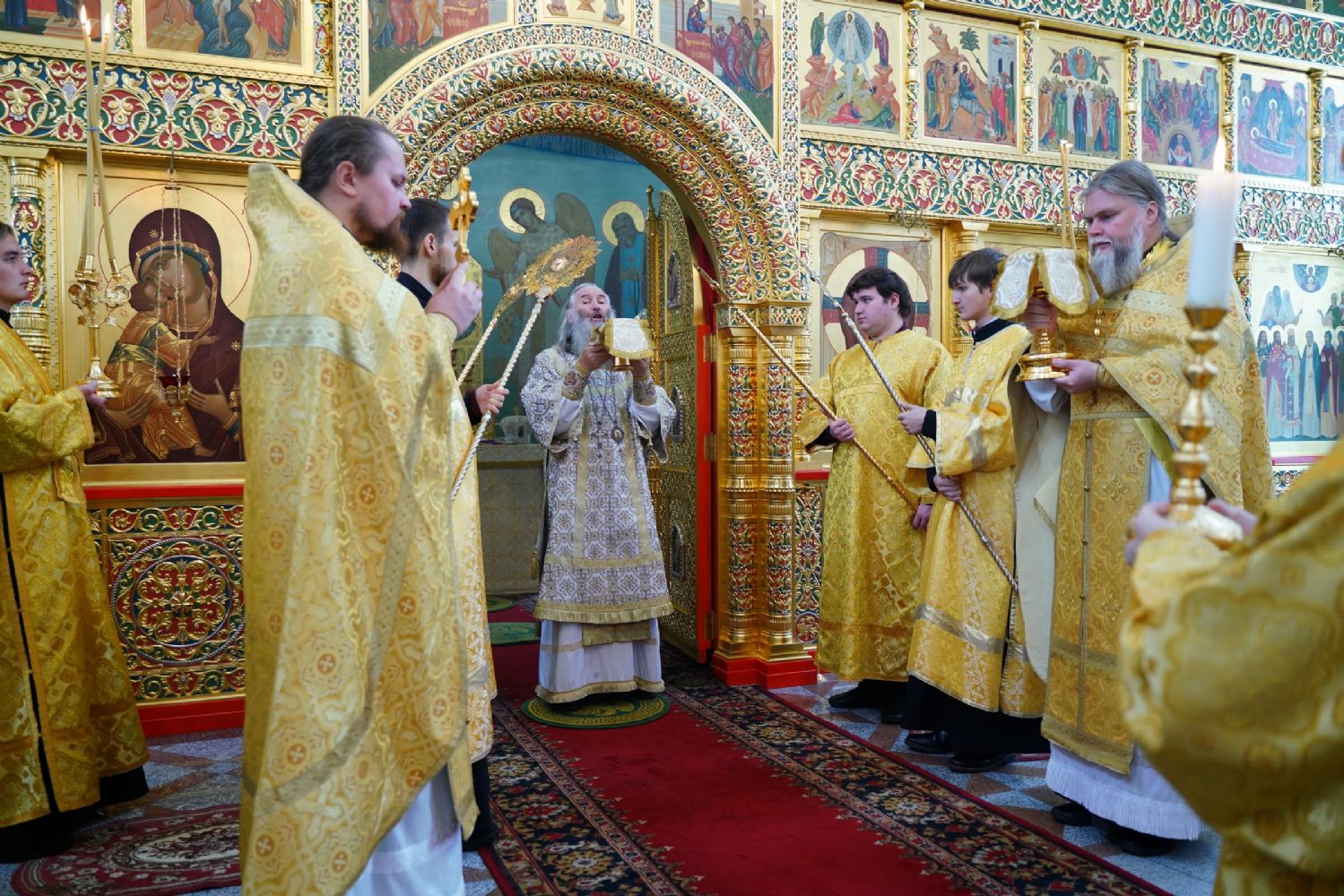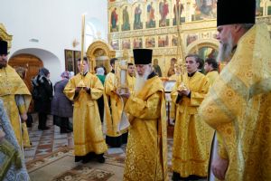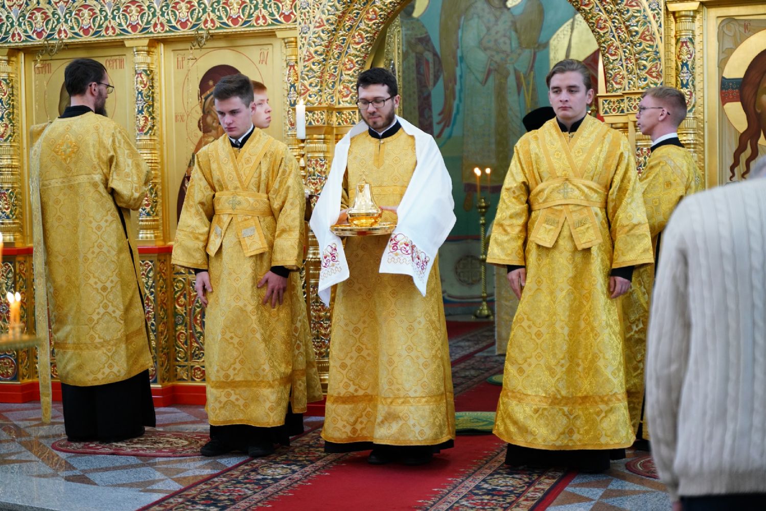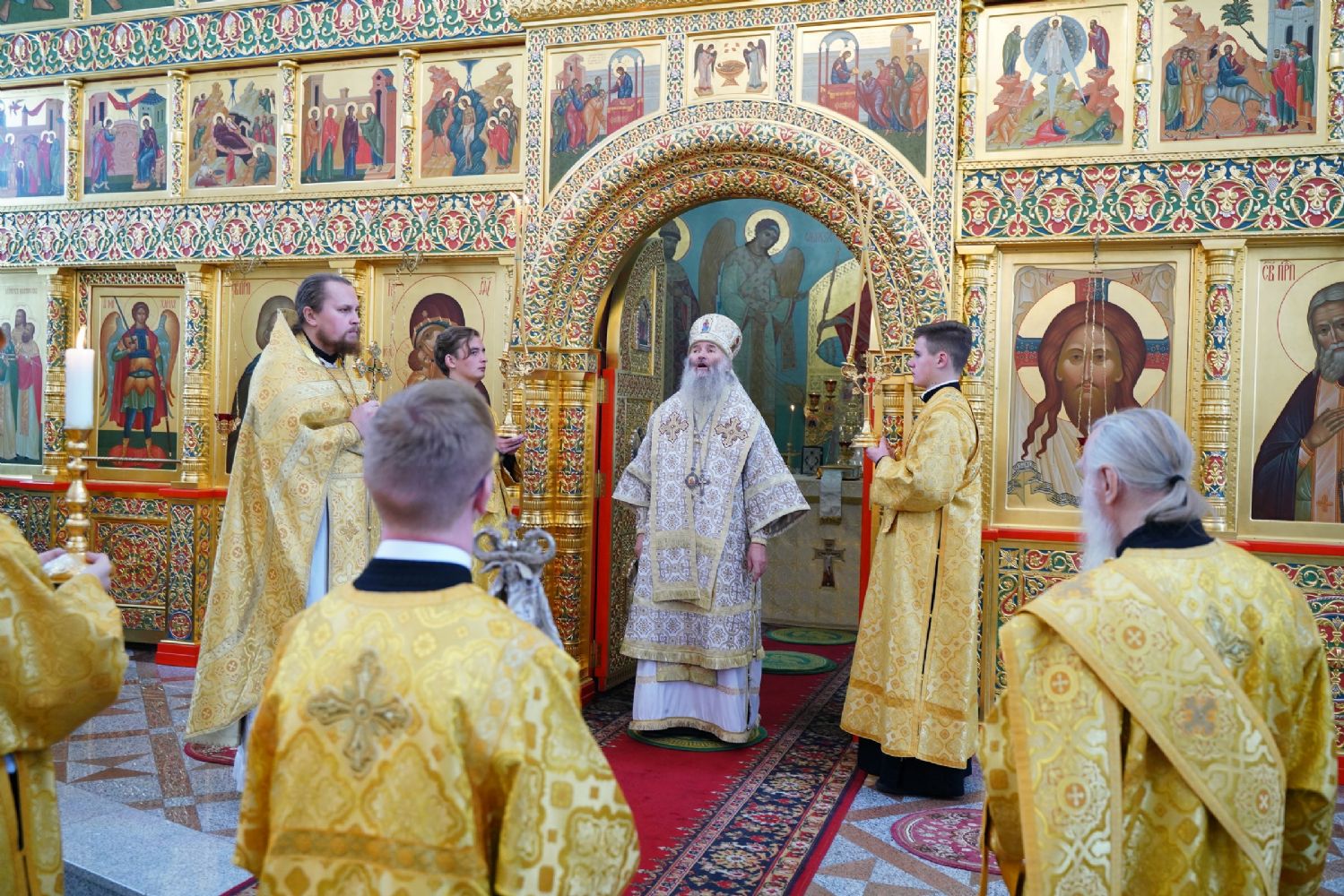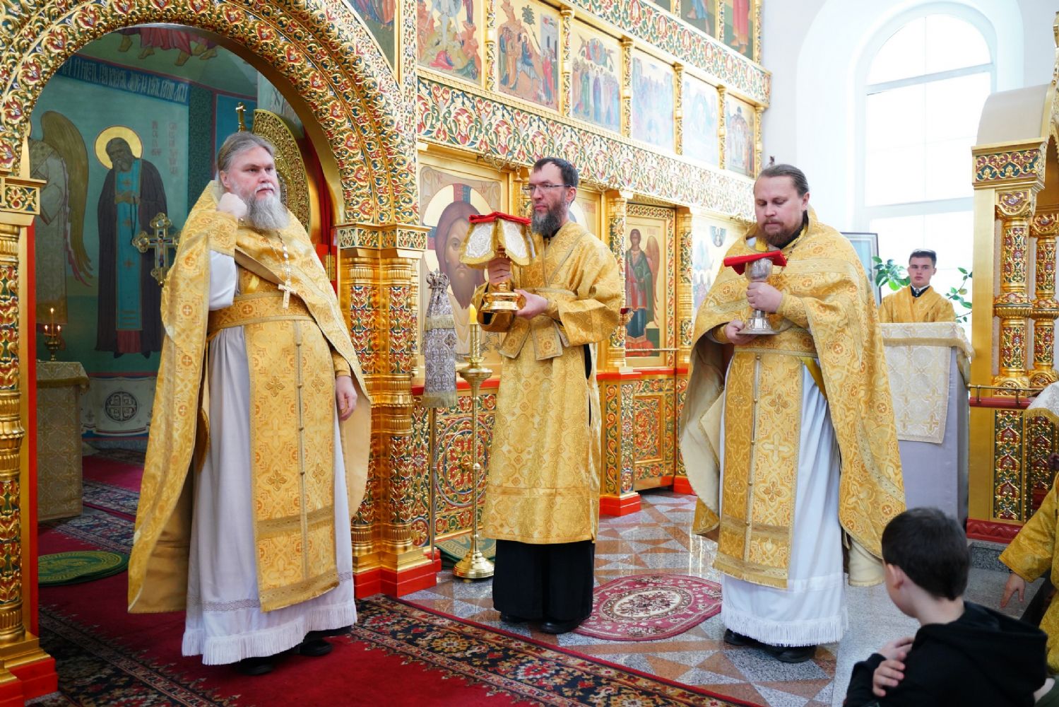 Его Высокопреосвященству сослужили настоятель храма протоиерей Александр Бачурин, клирики храма иерей Константин Домрачев и диакон Алексий Ершов, а также протодиакон Михаил Козловский. Пел хор храма под управлением регента Елены Умрихиной.