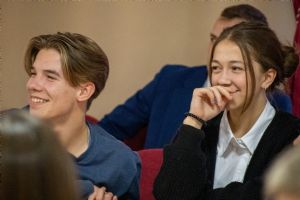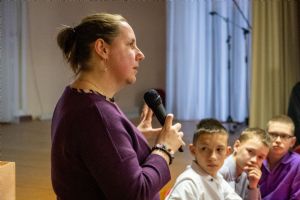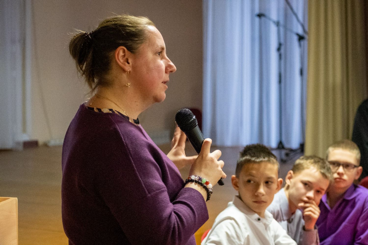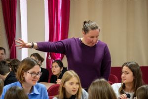 Затем ребятам была представлена постановка социального театра, основанная на реальной истории. Артисты изобразили сцену из жизни о том, как молодые люди поссорились. Анна Николаевна Ларкина - психолог, заместитель директора Республиканского центра «Доверие» - предложила присутствующим высказать причины размолвки пары. Также учащиеся могли выйти на сцену и повлиять на сценарий, проиграв, как бы они повели себя в подобной ситуации. Следует отметить, что для учащихся опыт игры в социальном театре был новым. Ребята смущались выйти на сцену, однако многие с места предлагали варианты исправления взаимоотношений влюбленных.