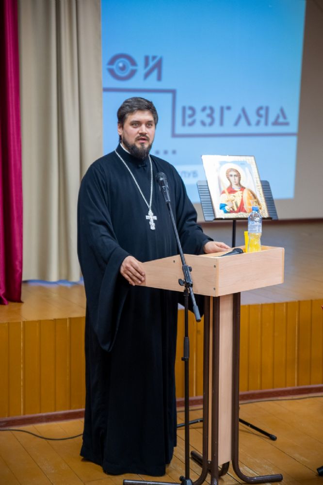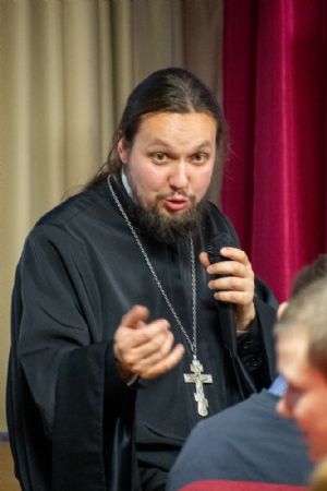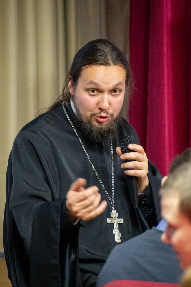 Затем к собравшимся обратился руководитель епархиального отдела по делам молодежи иерей Никита Иванов. Батюшка рассказал, что семья - это школа любви, главная еë цель - союз мужчины и женщины, а не деторождение. Двое должны научиться этой любви и затем дарить еë другим. Любовь бывает не только между мальчиком и девочкой, но и в обществе, в коллективе. Любовь - это искусство: надо научиться любить самому; видеть свои ошибки, а не ошибки другого; любить - это большой труд...