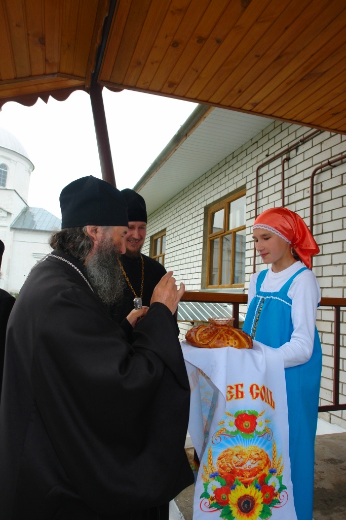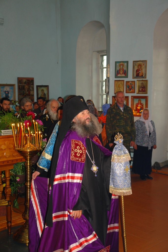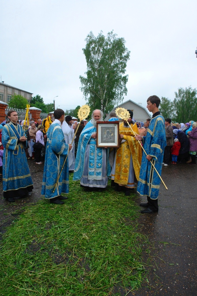 После крестного хода вокруг храма Владыка поздравил людей с прибытием в храм образа Матери Божией и что Она ниспослала нам обильные дожди на смену засушливой весне.