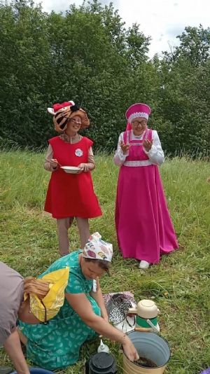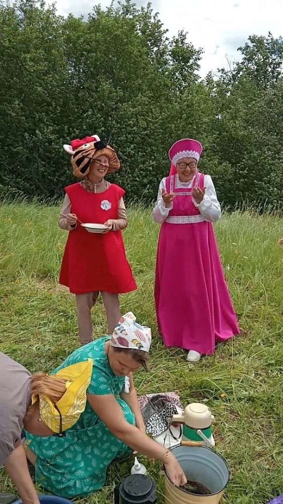 Карлыганский дом культуры провел развлекательную игровую программу с участием аниматоров – героев мультфильма «Три кота». А матушка Лидия с прихожанками Свято-Троицкого храма приготовили на костре для участников праздника вкуснейшую уху и компот.