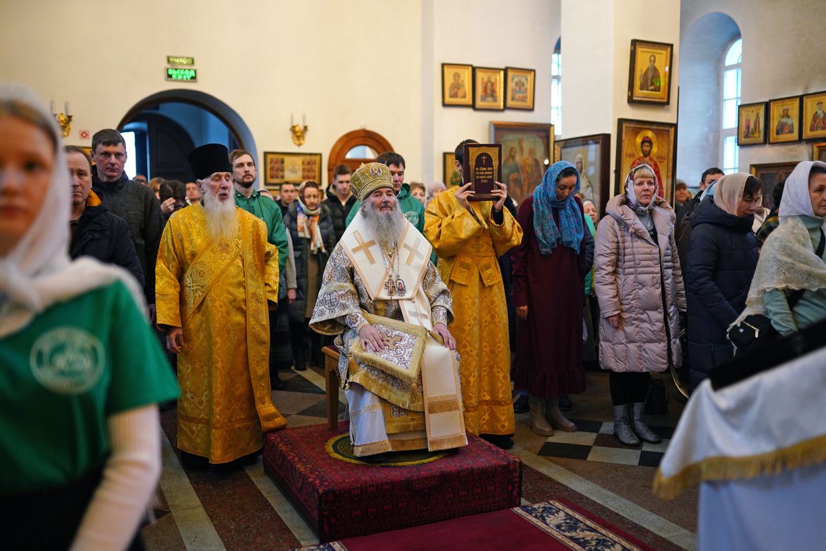 Его Преосвященству сослужили благочинный Волжского церковного округа иерей Алексей Скрябин, клирик Свято-Гурьевского храма иерей Димитрий Карпетченко и клирик Никольского кафедрального собора г. Волжска диакон Иоанн Захаров.
