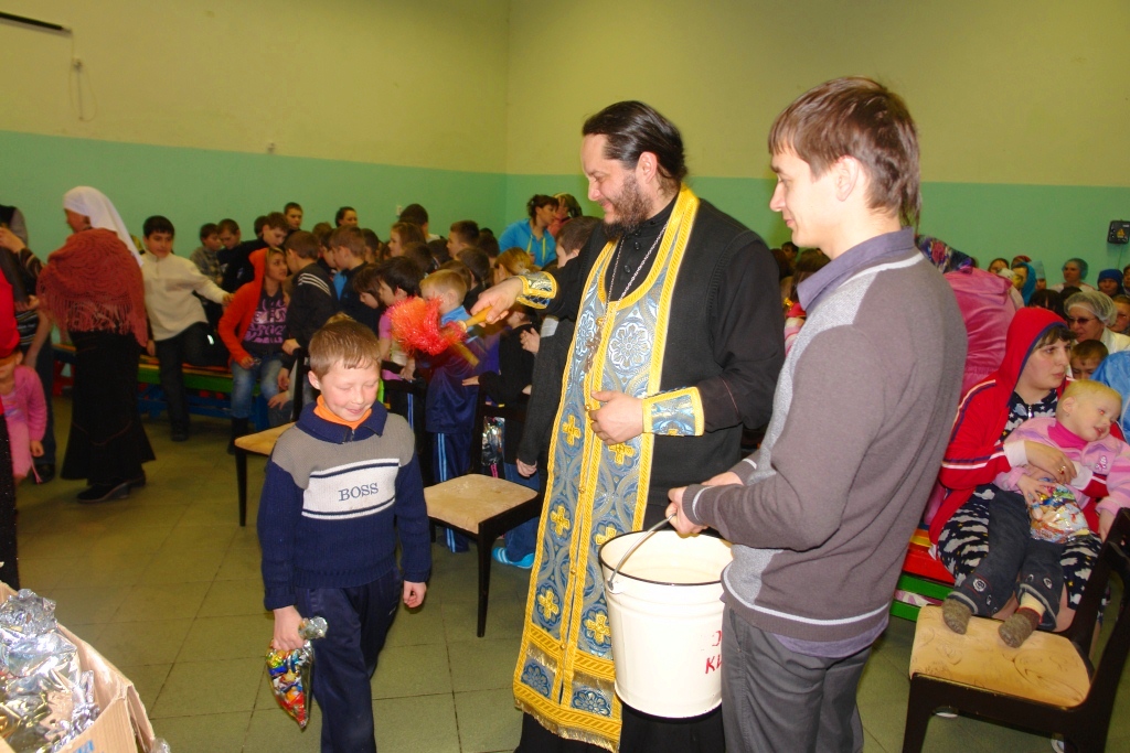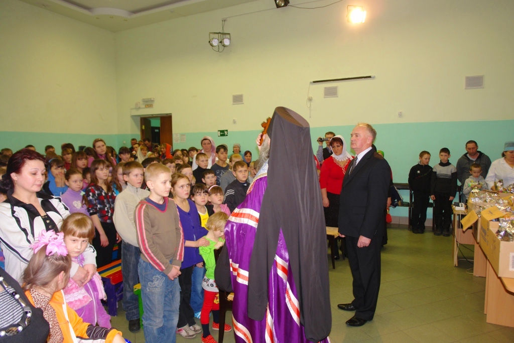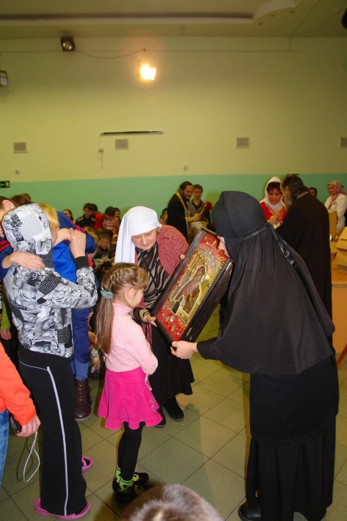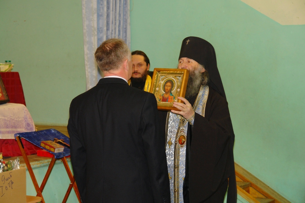 Перед Мироносицкой иконой Божией Матери был совершен молебен на начало доброго дела. Вместе с Владыкой и батюшкой Алексием Леоновым на молебне подпевали все детишки. После все собравшиеся приложились к иконе Матери Божией, Владыка вручал сладкие подарки, как детям, так и взрослым, а батюшка Алексий окроплял святой водой.