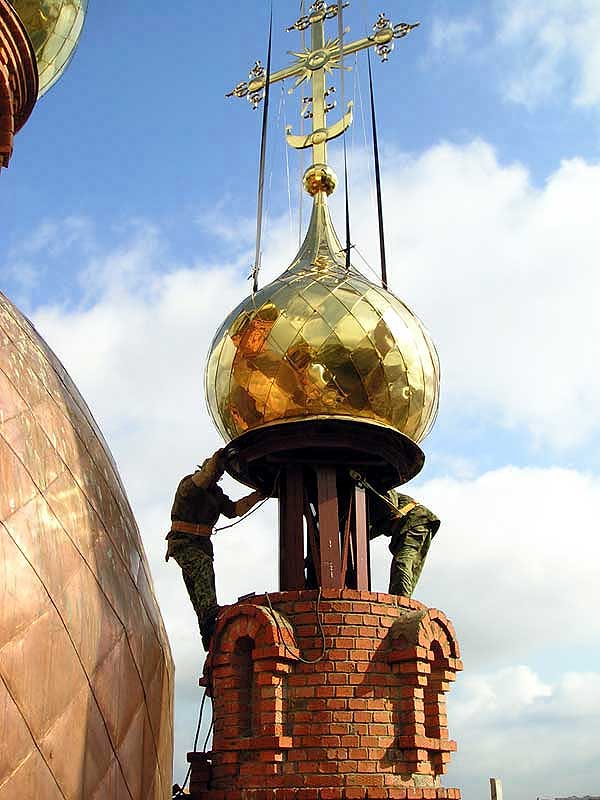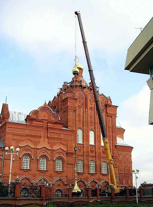 Это технически сложное мероприятие стало возможным благодаря руководству ОО «Волгатрансгаз» (Помарское ЛПО), предоставившему единственный в республике 60-тонный подъемный кран с 45-метровой стрелой. Утром, около 10 часов, первый из четырех малых куполов начал медленно подниматься ввысь. Благословить сие трудное и ответственное дело прибыл архиепископ Йошкар-Олинский и Марийский Иоанн.