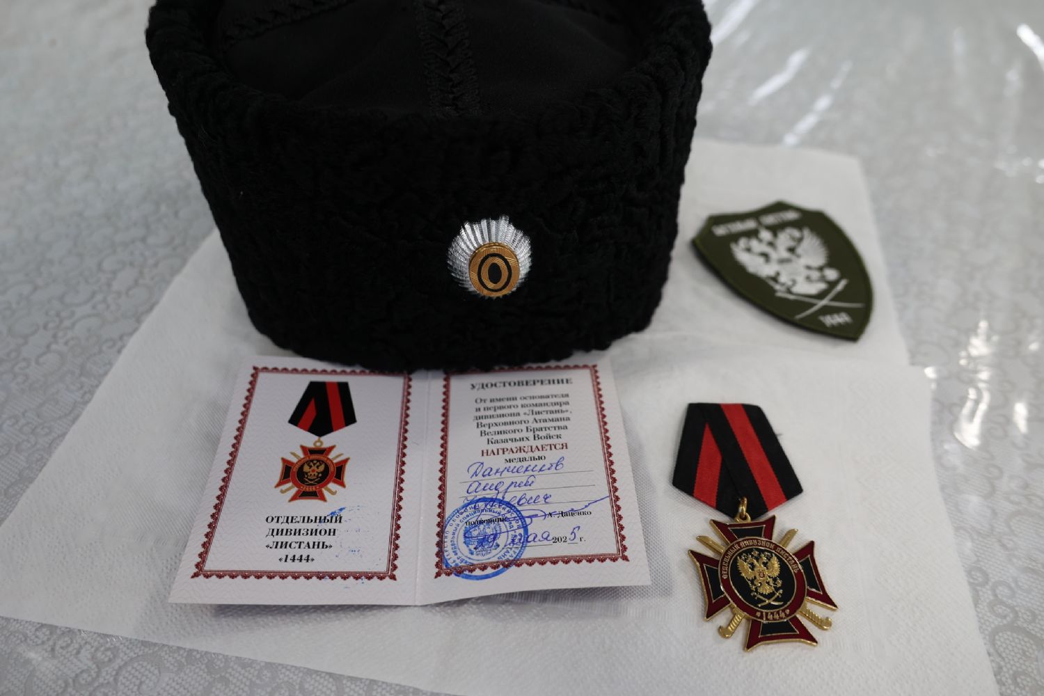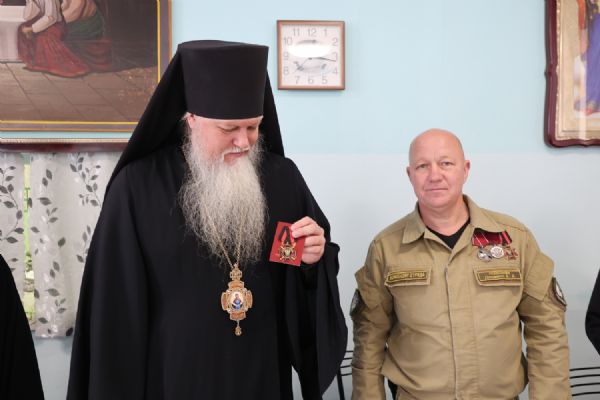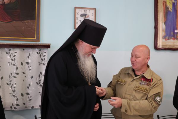 Во время встречи полковник Андрей Доценко вручил епископу Феофану медаль отдельного казачьего дивизиона «Листань» за духовное окормление казаков – участников СВО этого дивизиона.