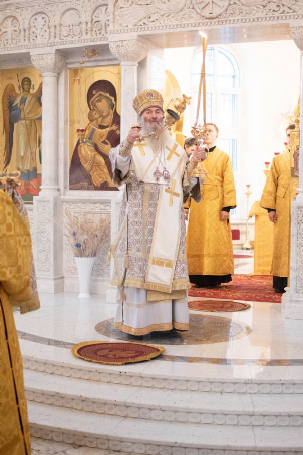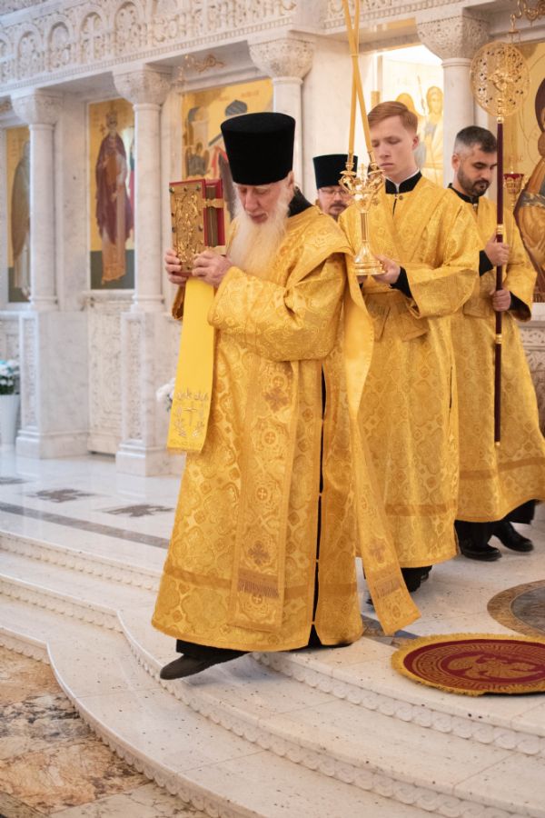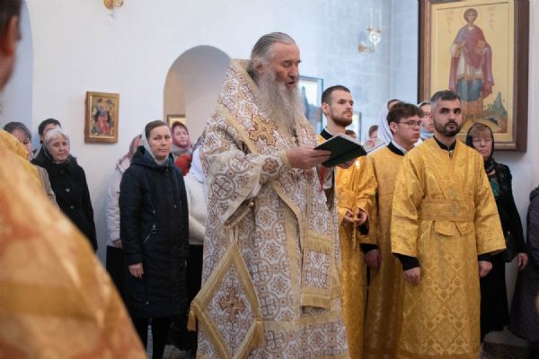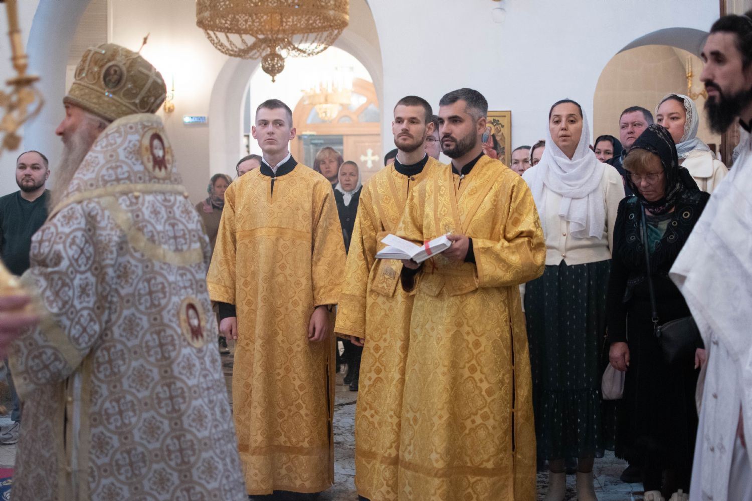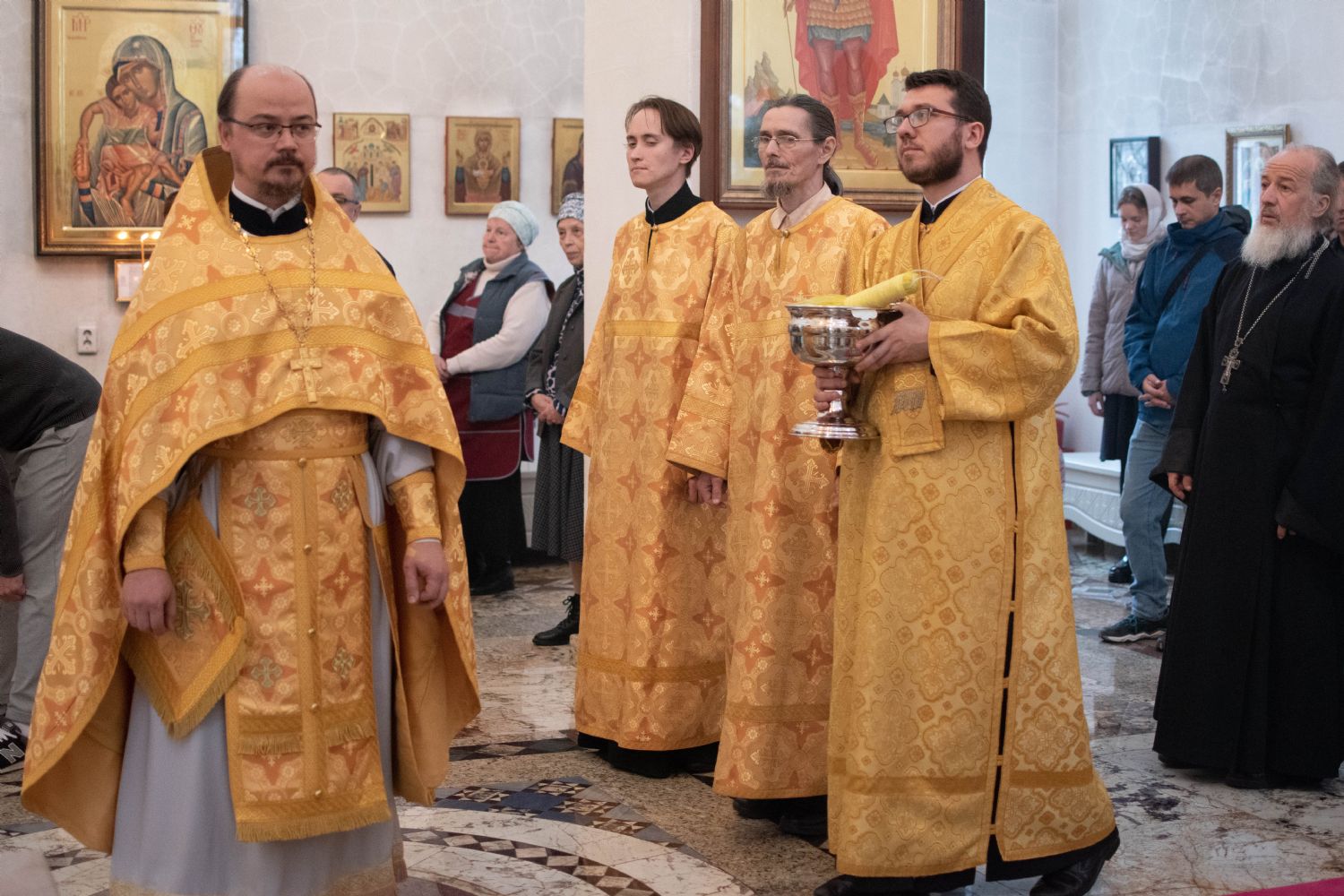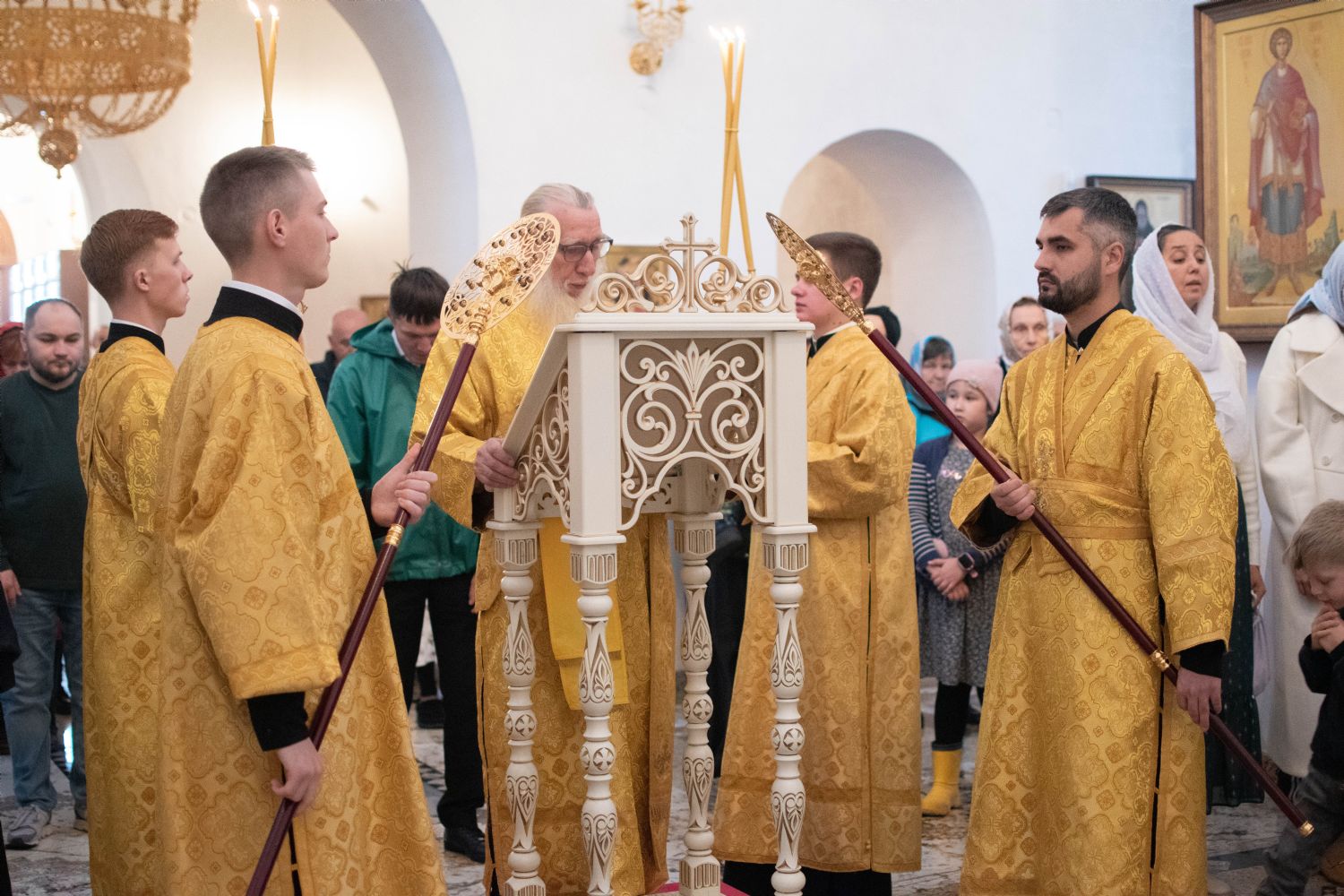 Его Высокопреосвященству сослужили настоятель храма иерей Алексий Михеев, клирик храма иерей Василий Пряморуков и протодиакон Михаил Козловский. Песнопения исполняли хор храма под управлением Александры Ивановой и детский хор воскресной школы под руководством Ольги Шевчук.
