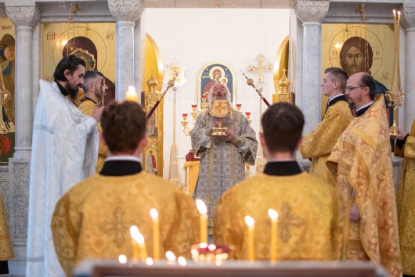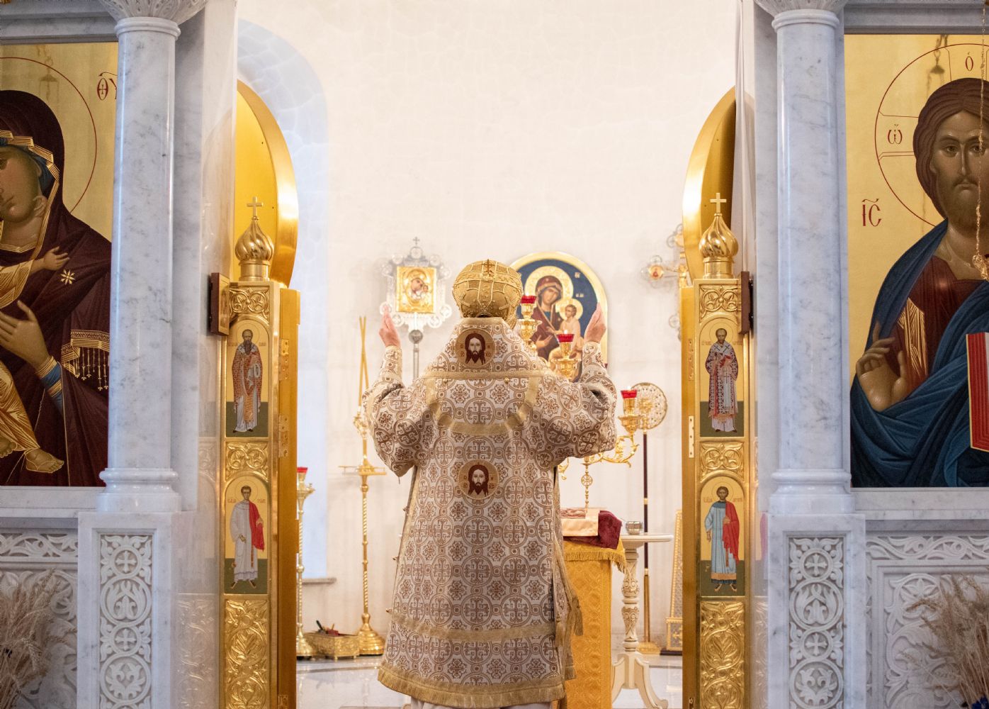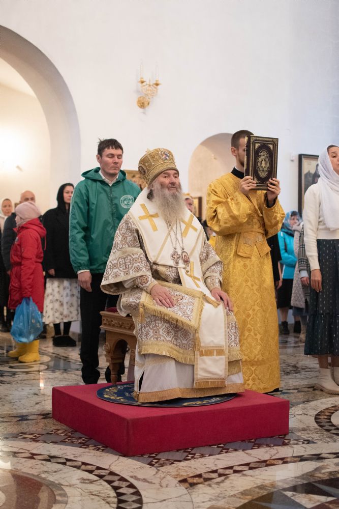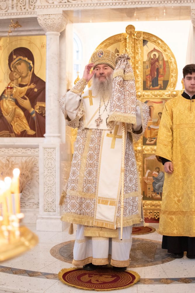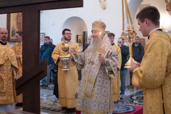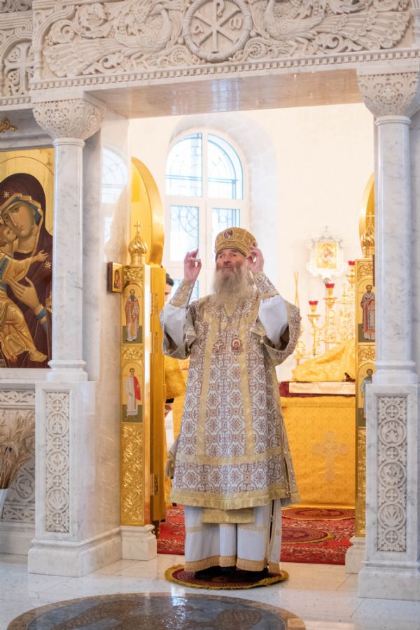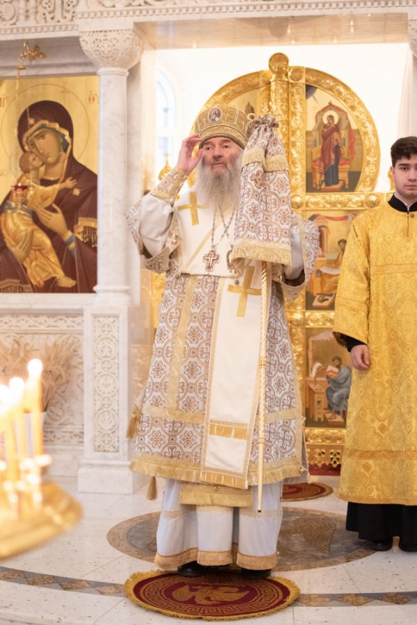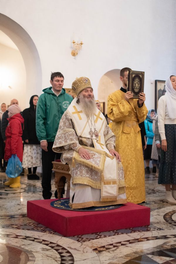 Его Высокопреосвященству сослужили настоятель храма иерей Алексий Михеев, клирик храма иерей Василий Пряморуков и протодиакон Михаил Козловский. Песнопения исполняли хор храма под управлением Александры Ивановой и детский хор воскресной школы под руководством Ольги Шевчук.