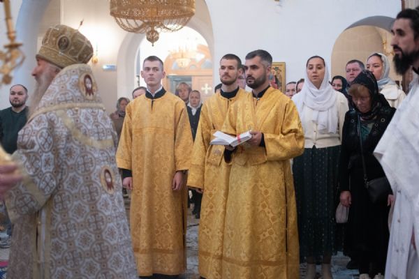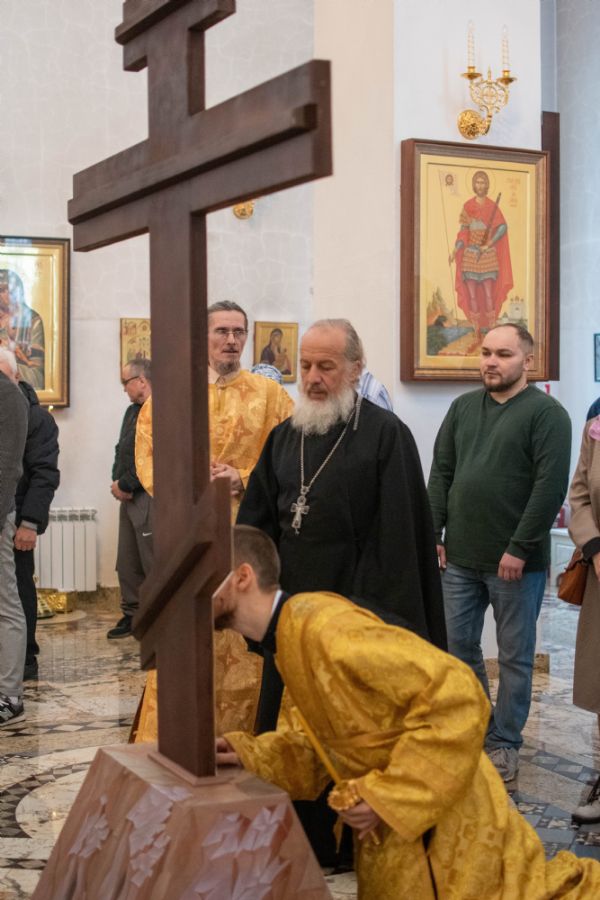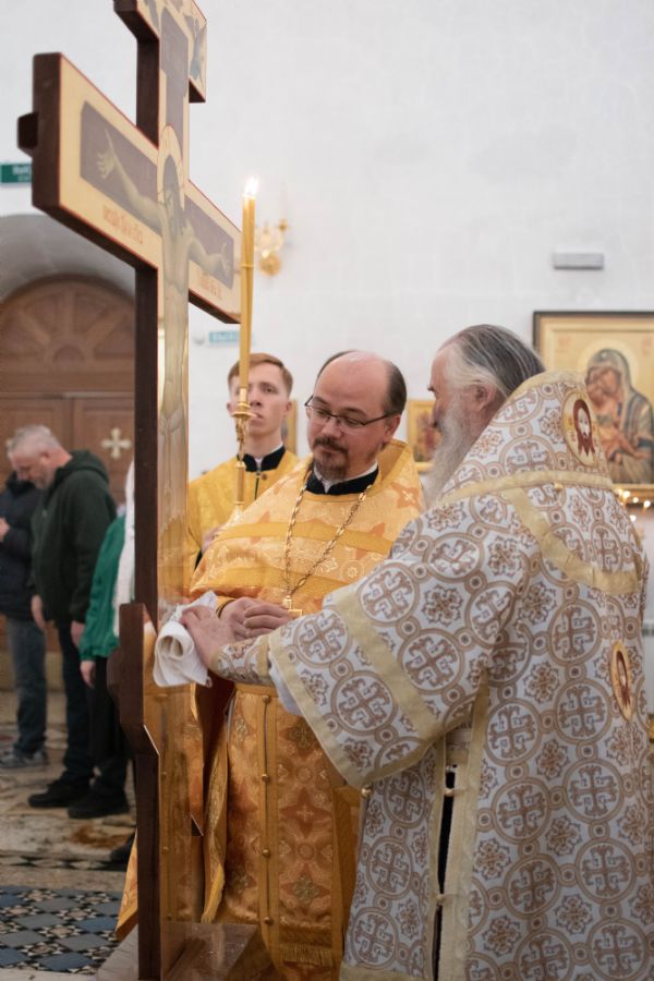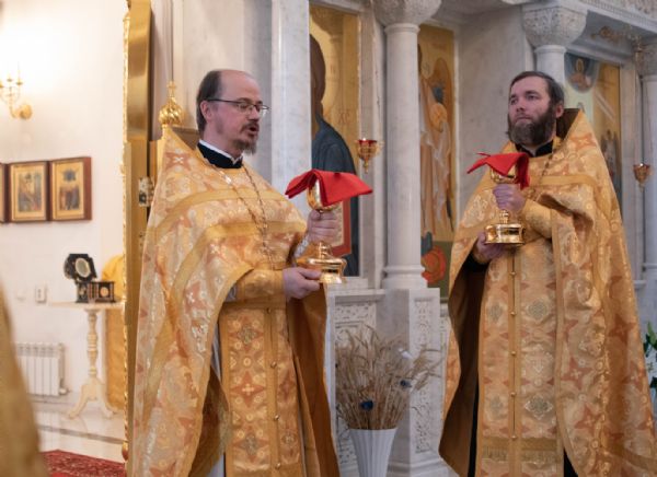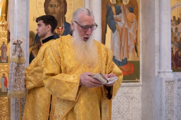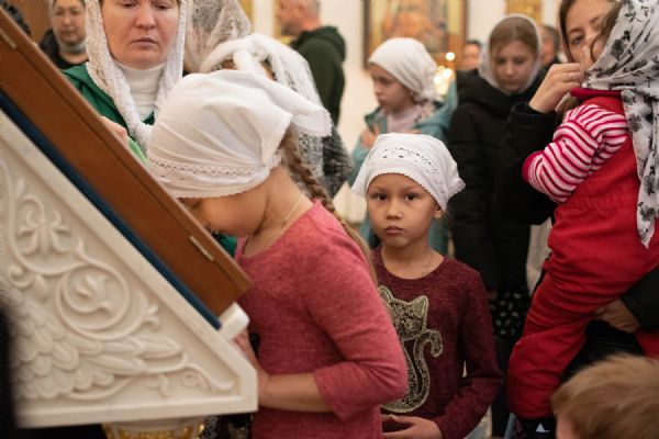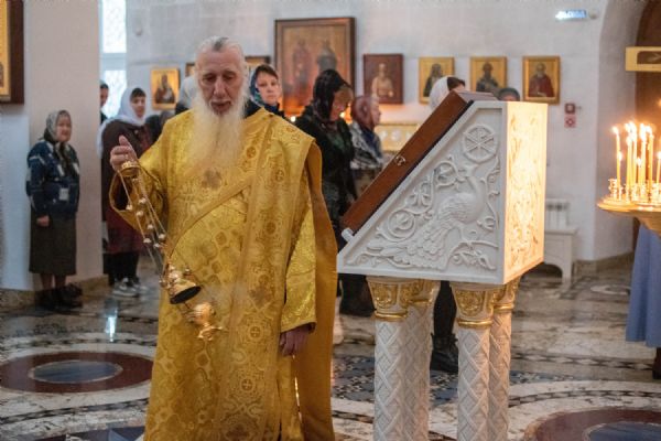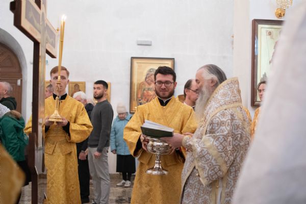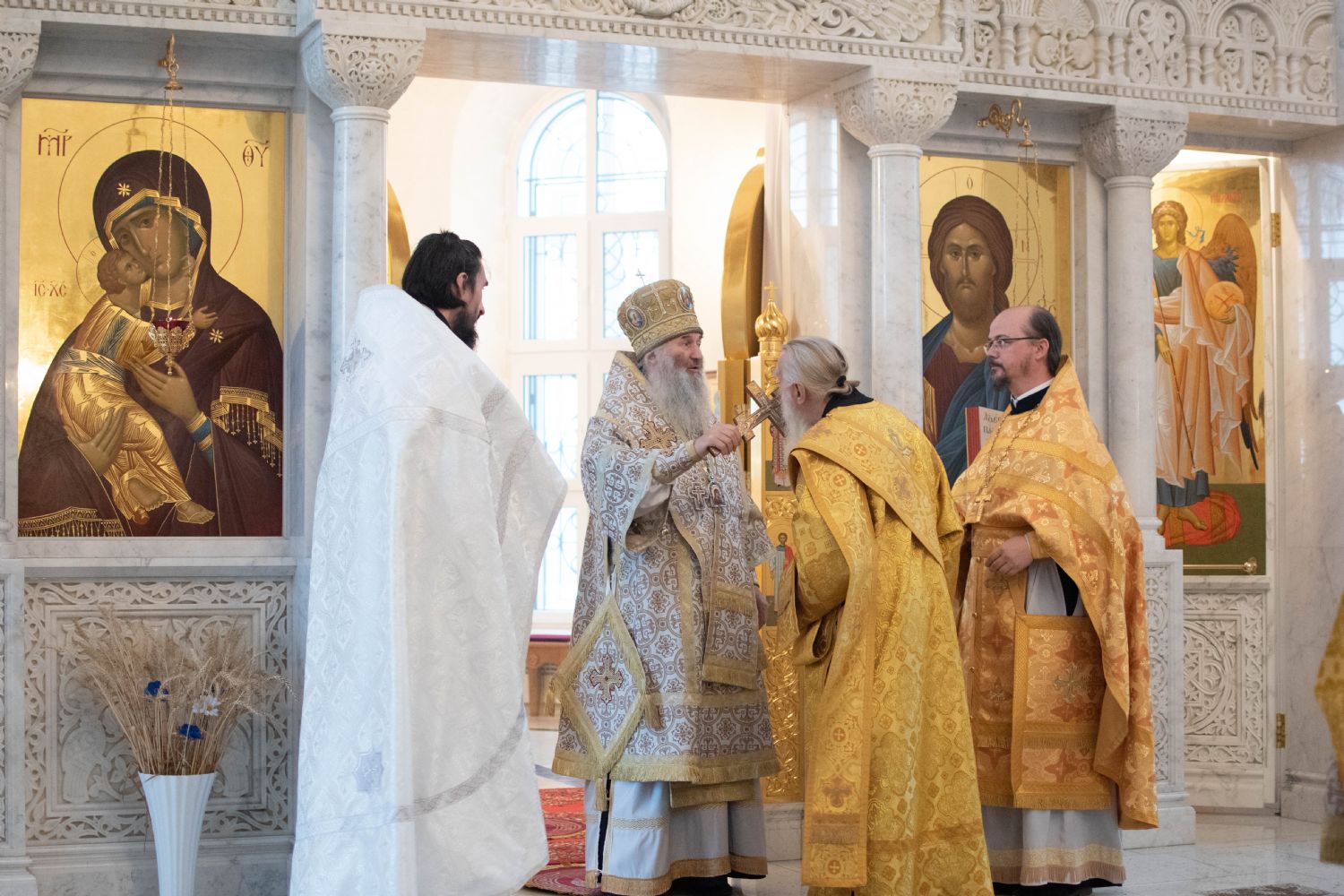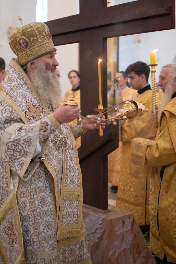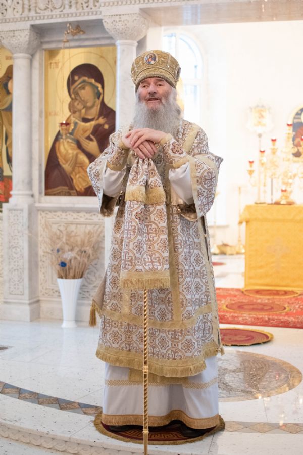 Его Высокопреосвященству сослужили настоятель храма иерей Алексий Михеев, клирик храма иерей Василий Пряморуков и протодиакон Михаил Козловский. Песнопения исполняли хор храма под управлением Александры Ивановой и детский хор воскресной школы под руководством Ольги Шевчук.