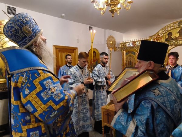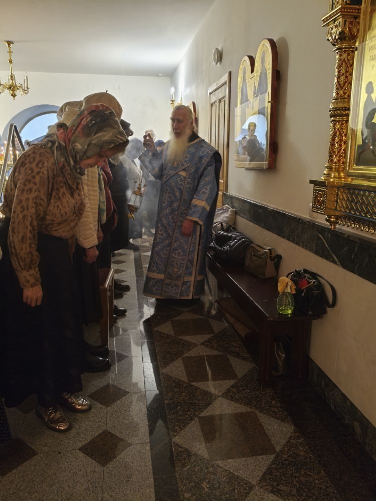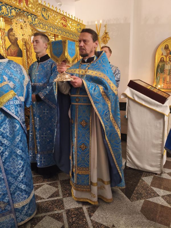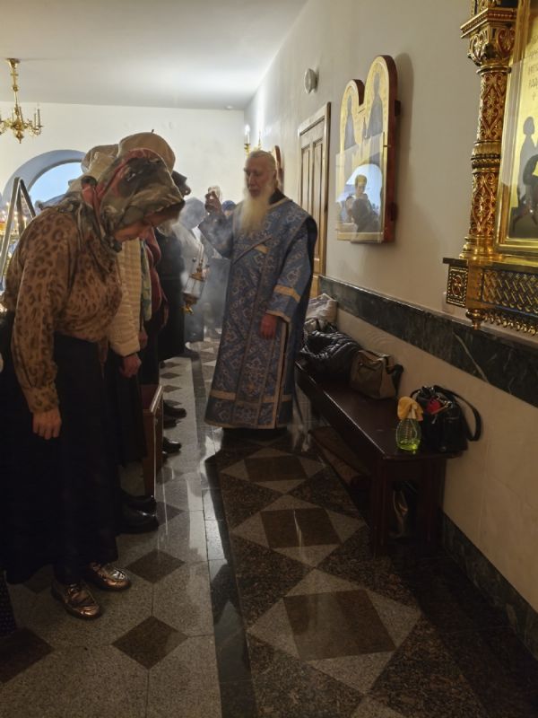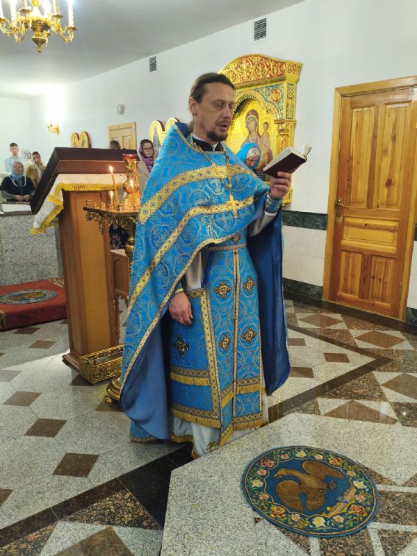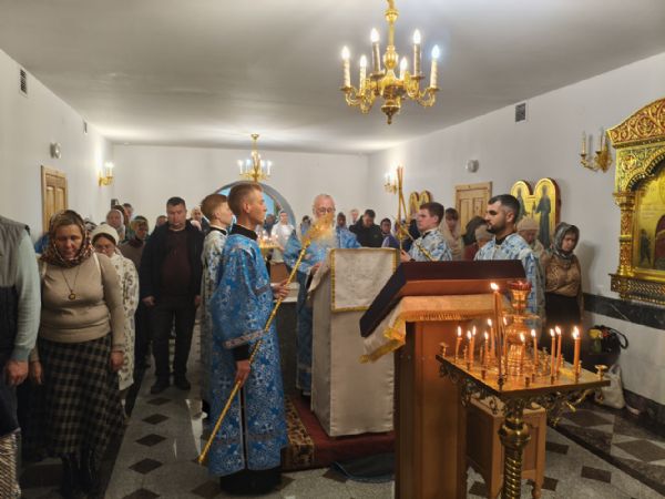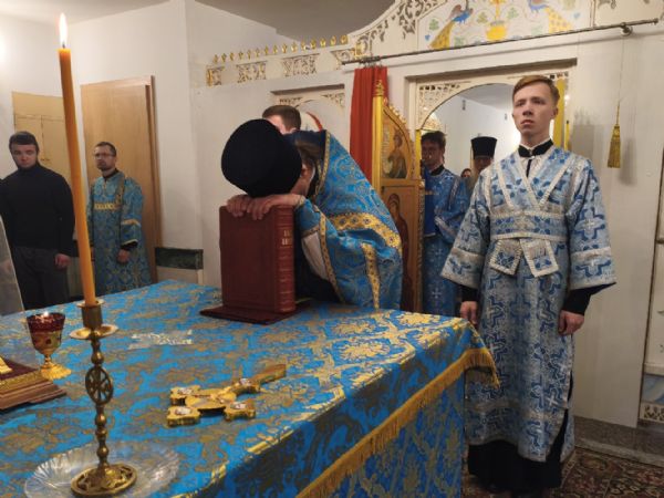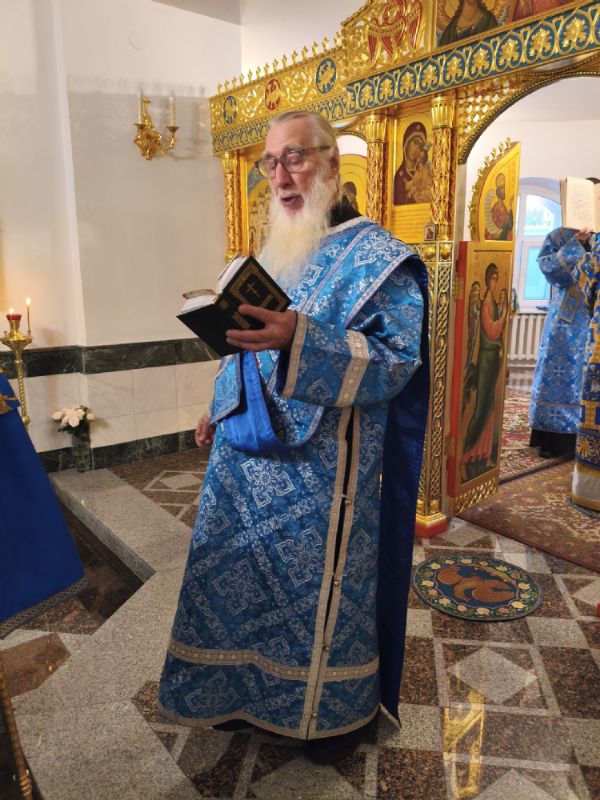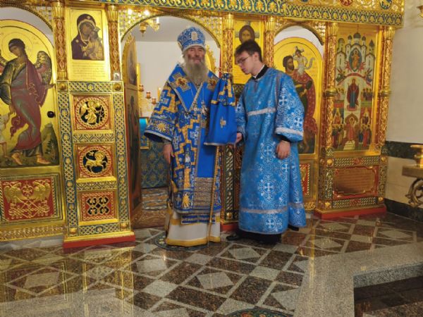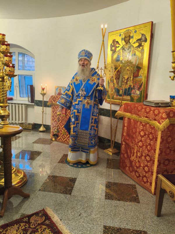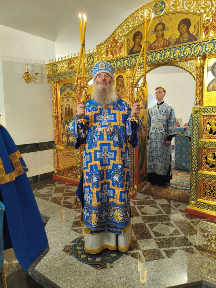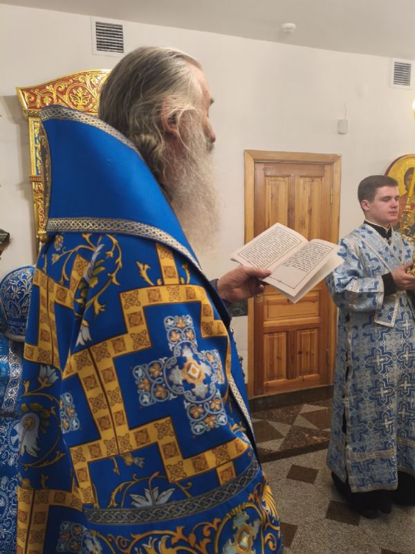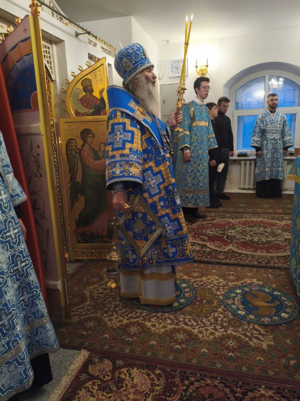 Владыке сослужили настоятель собора иерей Андрей Кочаков и протодиакон Михаил Козловский. Песнопения исполнял хор собора под управлением Алисы Вылегжаниной.
