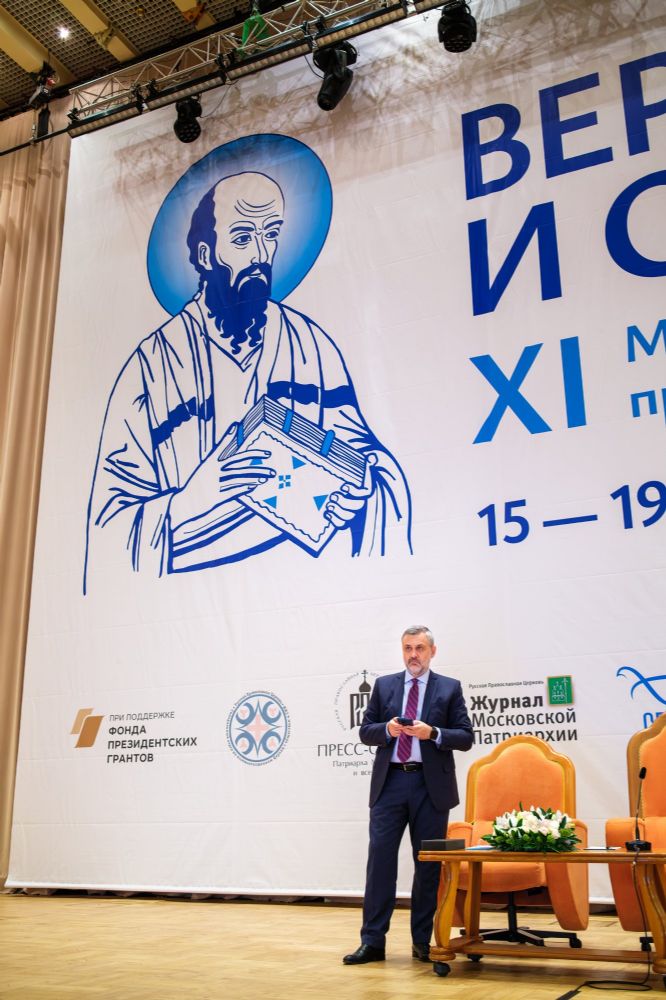 В Зале церковных соборов Святейшего Патриарха Кирилла от имени участников фестиваля приветствовал председатель Синодального отдела по взаимоотношениям Церкви с обществом и СМИ, временно исполняющий обязанности руководителя Пресс-службы Патриарха Московского и всея Руси В.Р. Легойда.