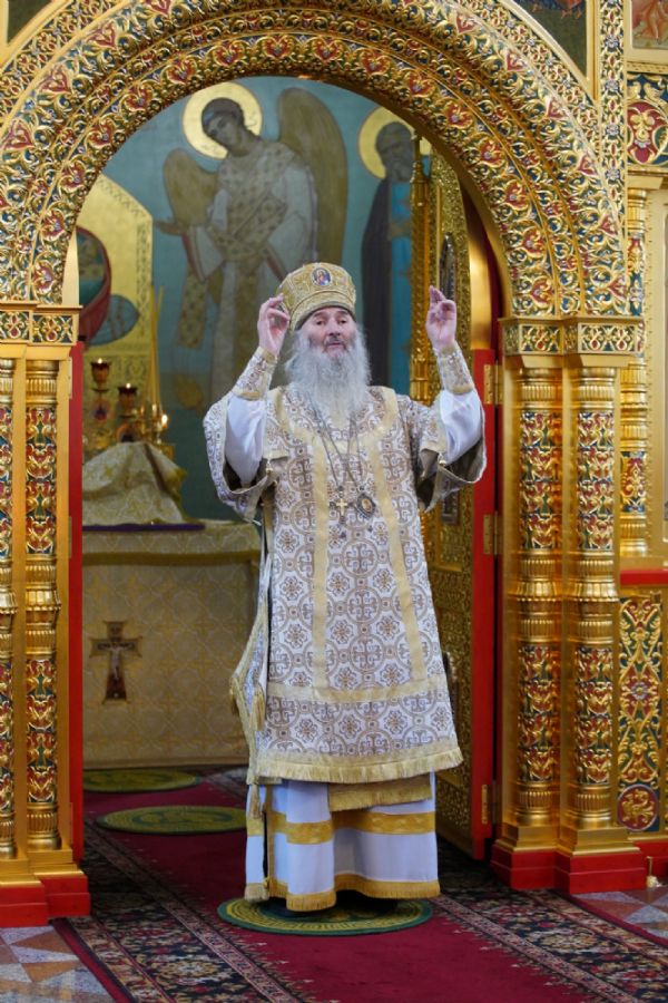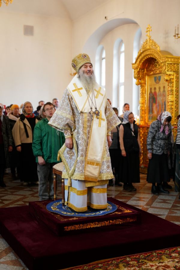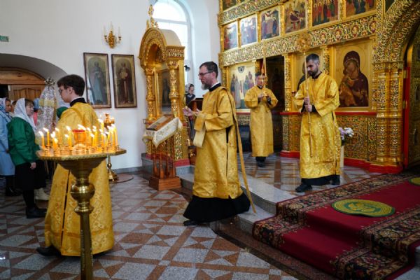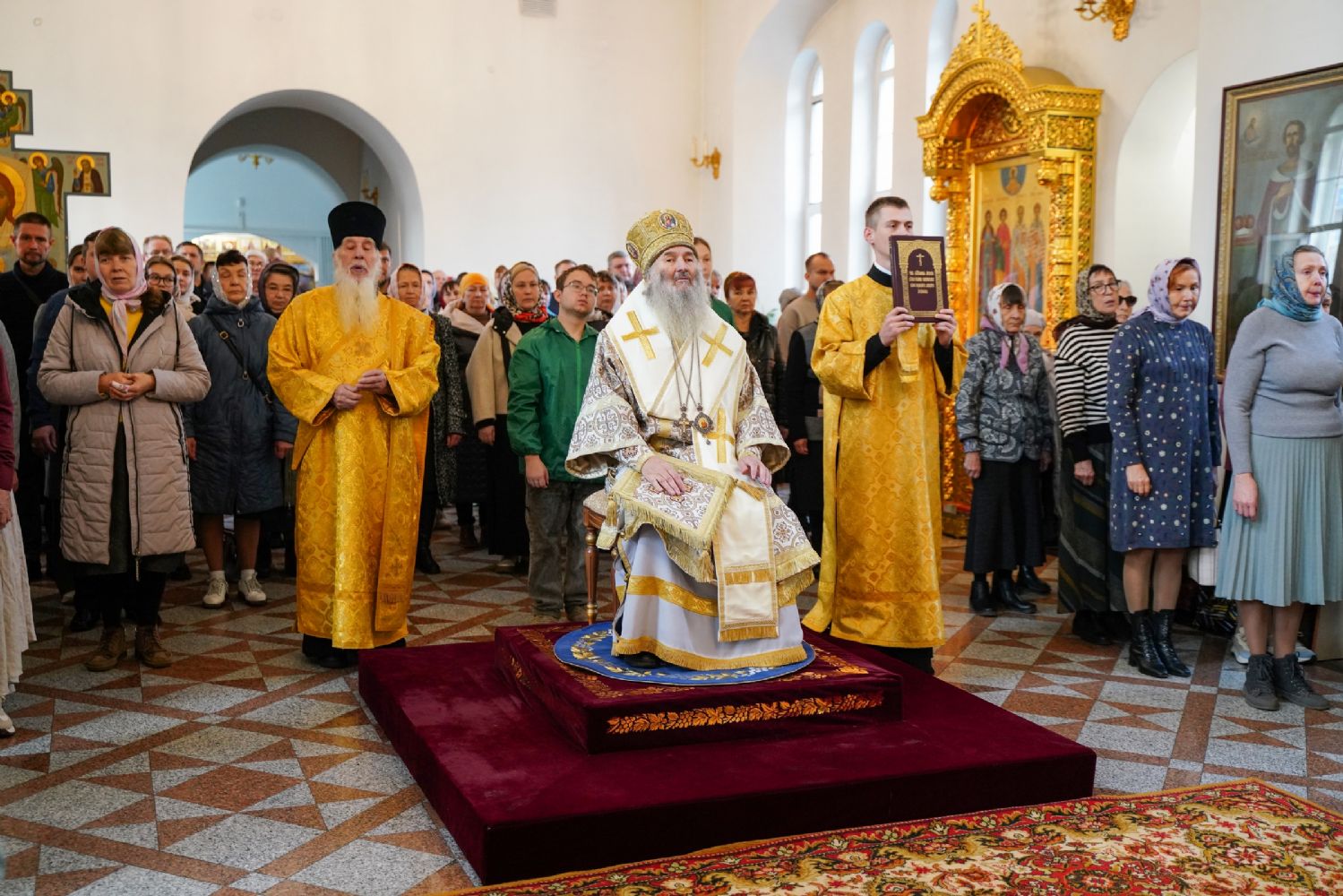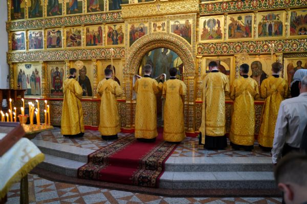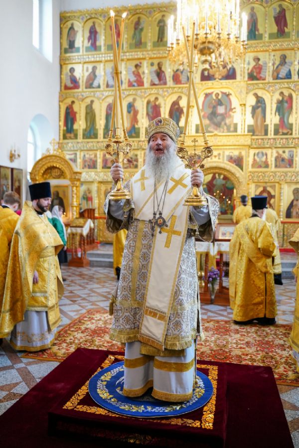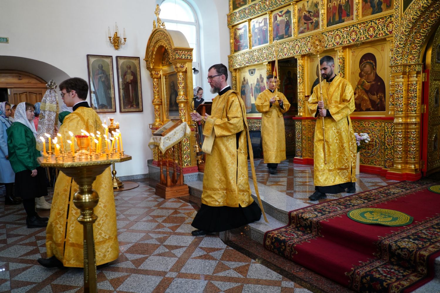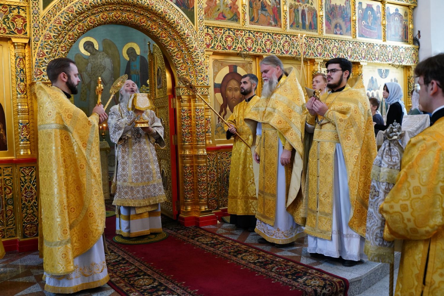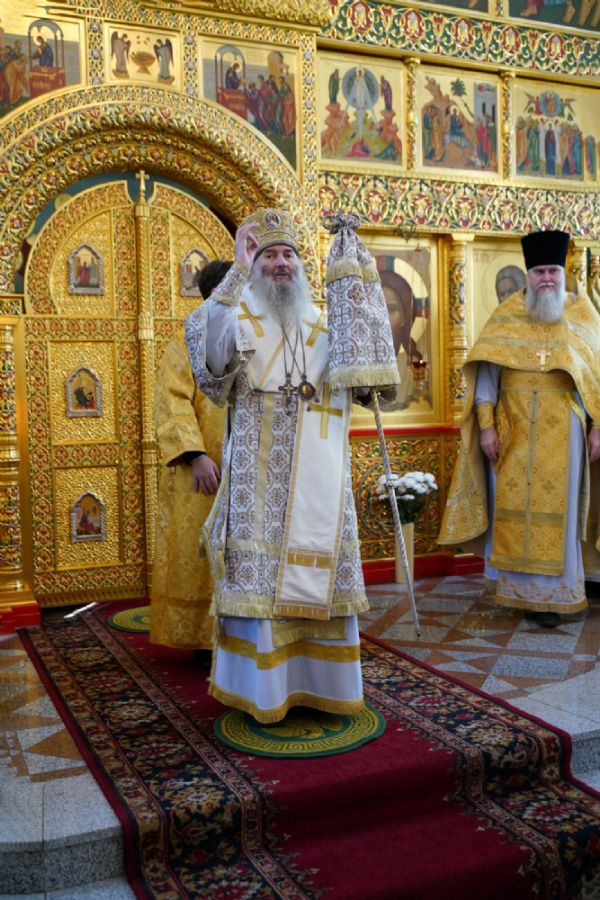 Его Высокопреосвященству сослужили настоятель храма протоиерей Александр Бачурин, клирики храма иерей Виктор Умрихин и диакон Алексий Ершов, а также протодиакон Михаил Козловский и клирик Минусинской епархии иерей Матфей Фокша. Песнопения исполняли хор храма под управлением регента Елены Умрихиной и детский хор воскресной школы под руководством Анны Михеевой.