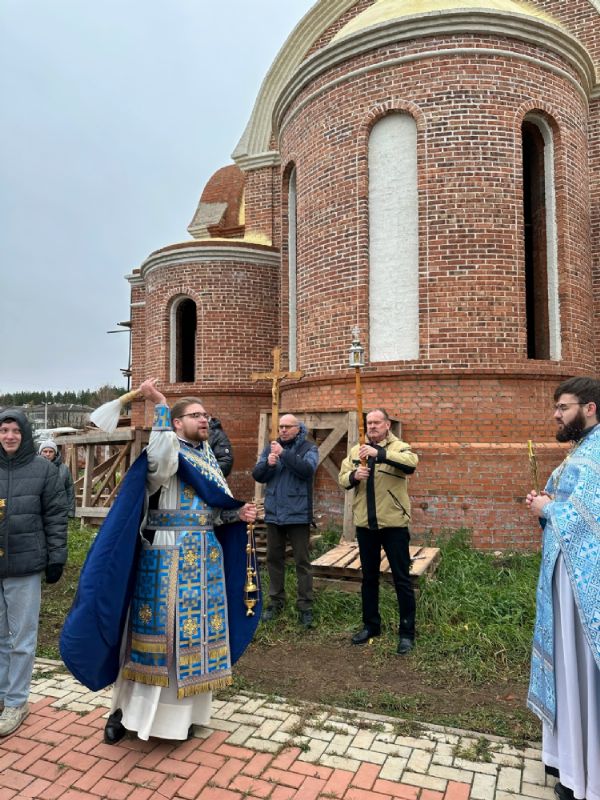 После Литургии вокруг храма прошел праздничный крестный ход со чтением Евангелия и кроплением святой водой. Отец Артемий поблагодарил всех за совместную молитву и труды по строительству храма.