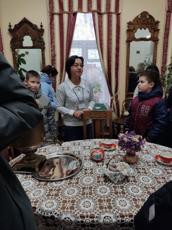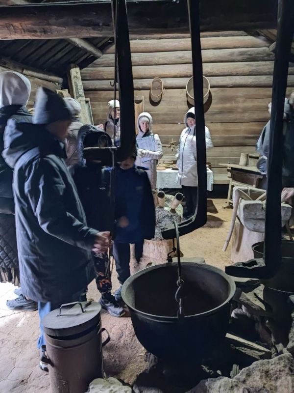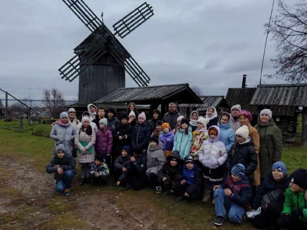 Следующим был этнографический музей под открытым небом имени В.И. Романова, откуда открывается живописный вид на Волгу. Здесь сохранён не только быт, но и дух коренного населения нашей республики – луговых, горных и восточных мари. Дом, ангар, весовая, лачуга, мельница, баня по-чёрному, кузница – настоящее поселение предков с их предметами быта, культуры, труда. Юные паломники могли увидеть изумительную вышивку на национальных костюмах, лапти охотника, свадебные украшения, детскую люльку, плетёную мебель из лозы… А экскурсовод поведал, как и для чего всё это использовалось в быту.