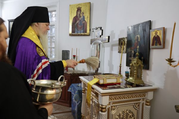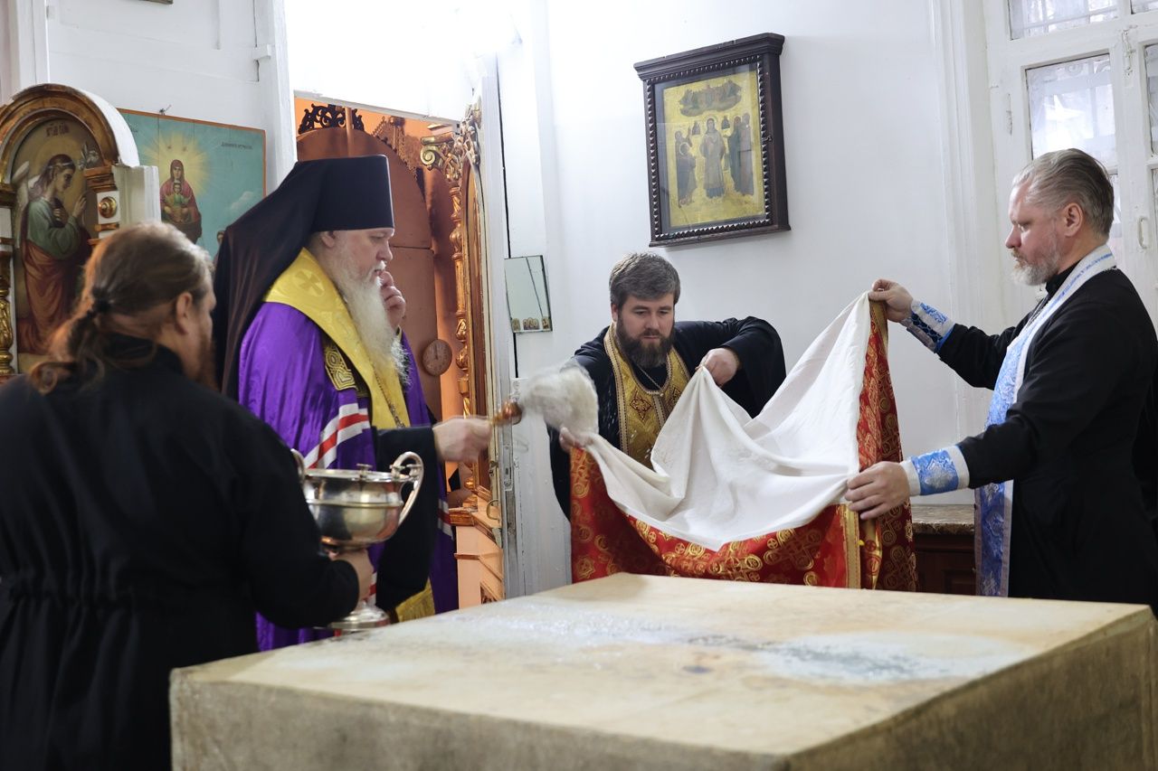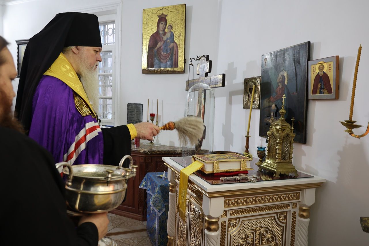 5 ноября епископ Волжский и Сернурский Феофан совершил освящение новых окладов на престол и жертвенник в храме святителя Гурия, архиепископа Казанского на Архиерейском подворье в Петъялах.