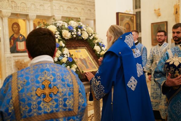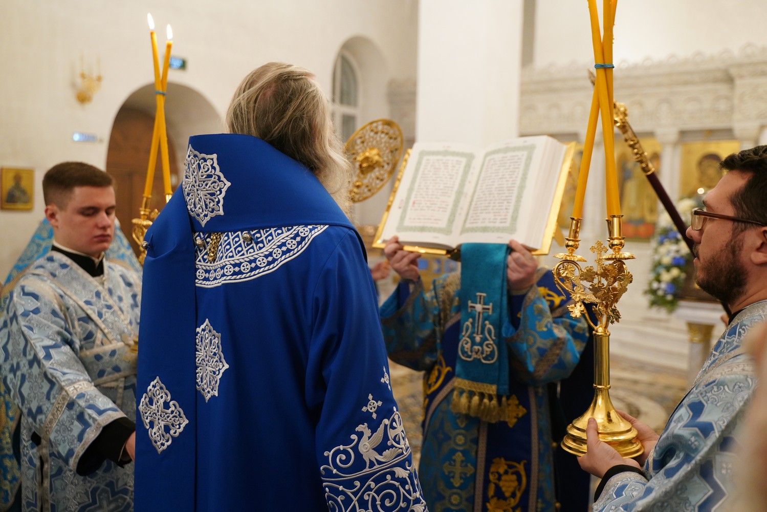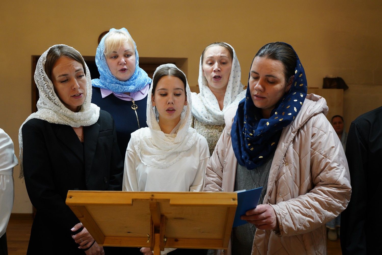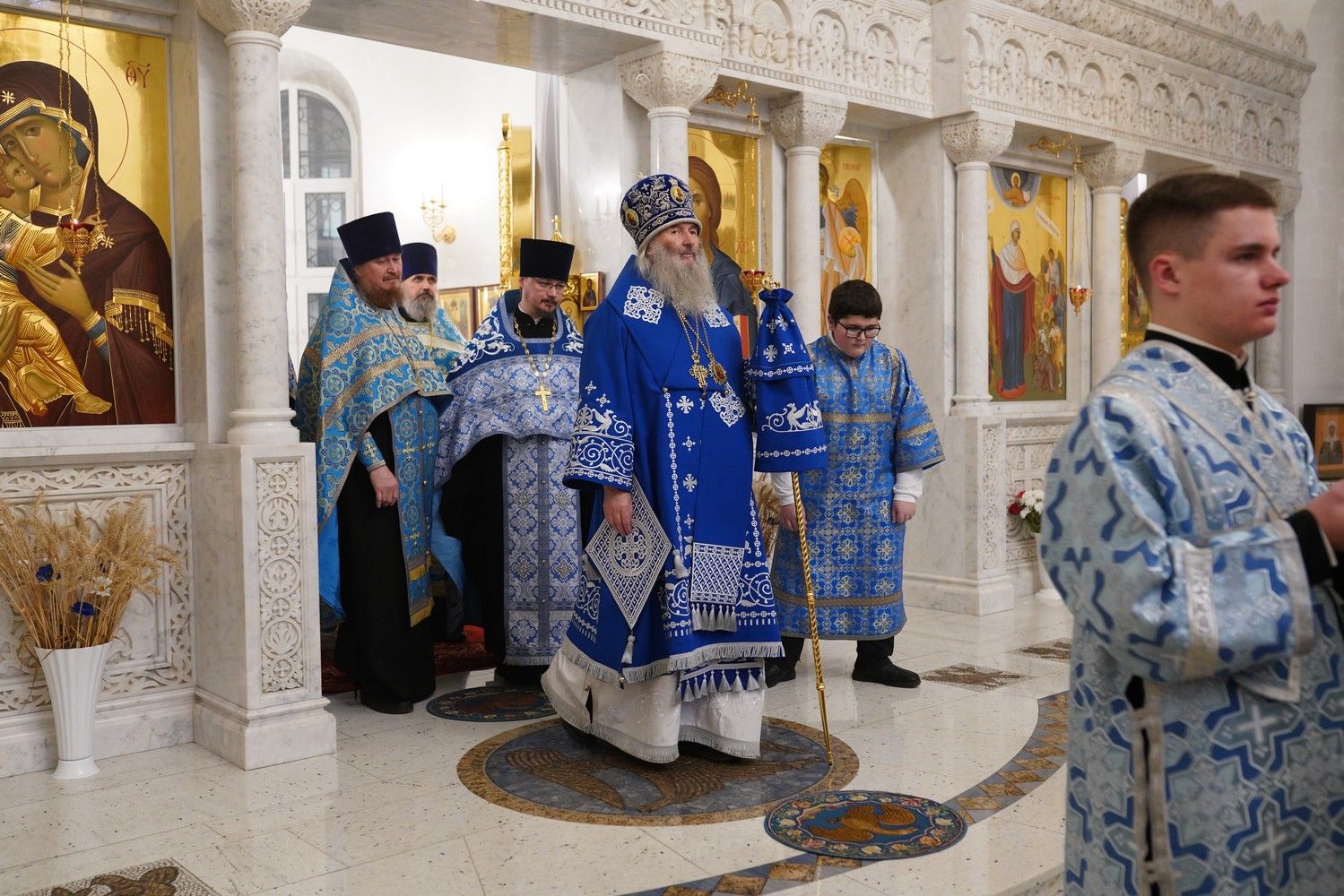 Архипастырю сослужили настоятель храма иерей Алексий Михеев, ключарь Благовещенского кафедрального собора протоиерей Сергий Поглазов, настоятель храма Казанской иконы Божией Матери с. Нурма иерей Александр Коваль, клирики храма иконы «Всех скорбящих Радость» иереи Алексий Кирюшкин, Игорь Коваль и Сергий Пуртов, протодиакон Михаил Козловский и клирик Благовещенского кафедрального собора диакон Андрей Дружинин. Песнопения исполнял хор храма под управлением Александры Ивановой.