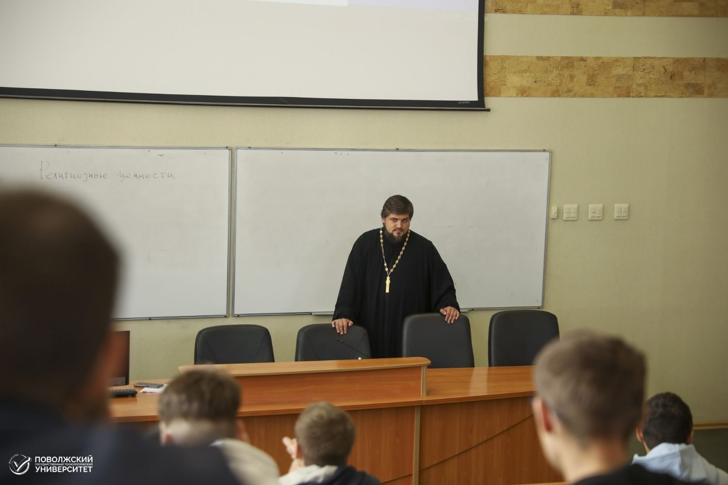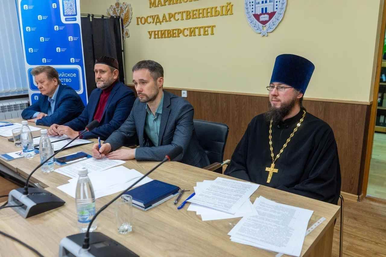 Состоялся живой диалог между советником министра культуры, печати и по делам национальностей Республики Марий Эл Игорем Садовиным, студентами юридического факультета, Института национальной культуры и межкультурной коммуникации и представителями религиозных организаций: духовником МарГУ иереем Димитрием Копыловым и имамом Волжского и Звениговского районов РМЭ Саидом хазрат Абхалиловым.