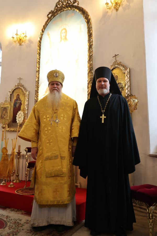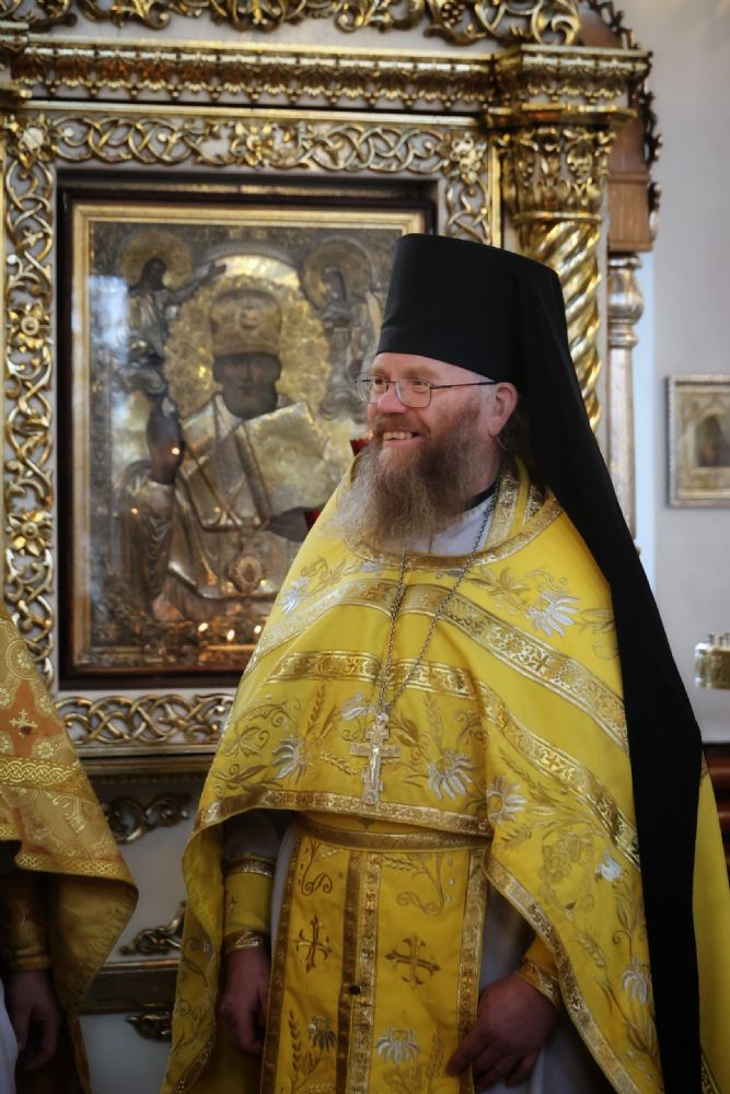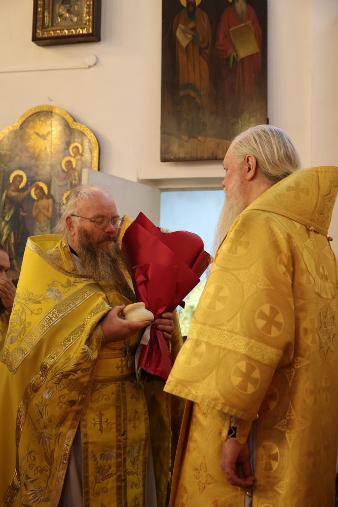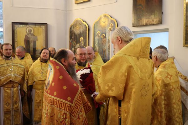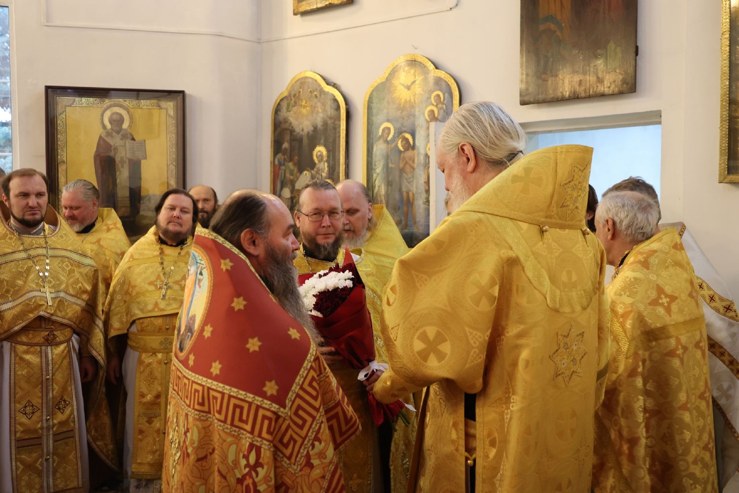 Епископ Феофан поздравил иеромонаха Тихона (Белавина) с годовщиной его священнической хиротонии, а также поблагодарил духовенство и всех верующих, пришедших почтить память святителя Тихона, за радость совместной молитвы.