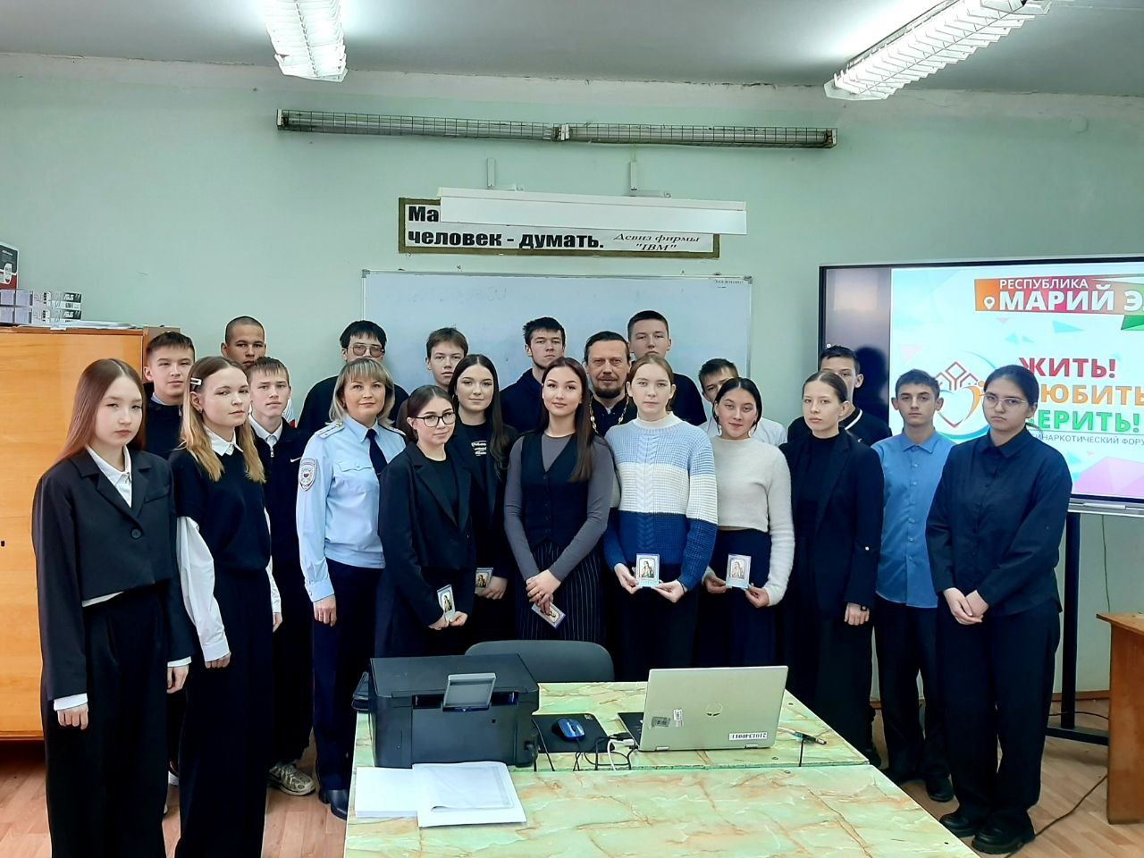 Отец Андрей поговорил со старшеклассниками о счастье, любви и преодолении жизненных трудностей. Ребята внимательно слушали гостя, смотрели тематические видеоролики и активно участвовали в беседе. В завершение встречи было сделано общее фото, и отец Андрей вручил школьникам памятные подарки.