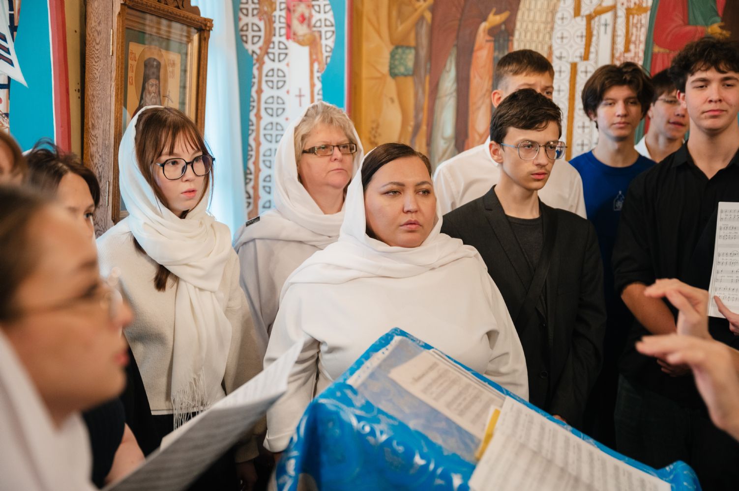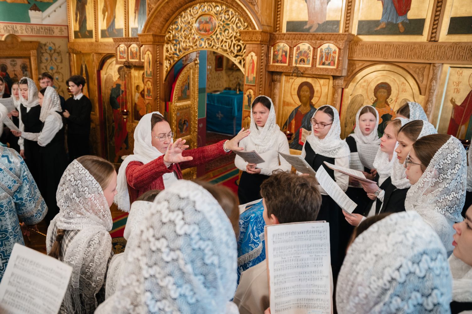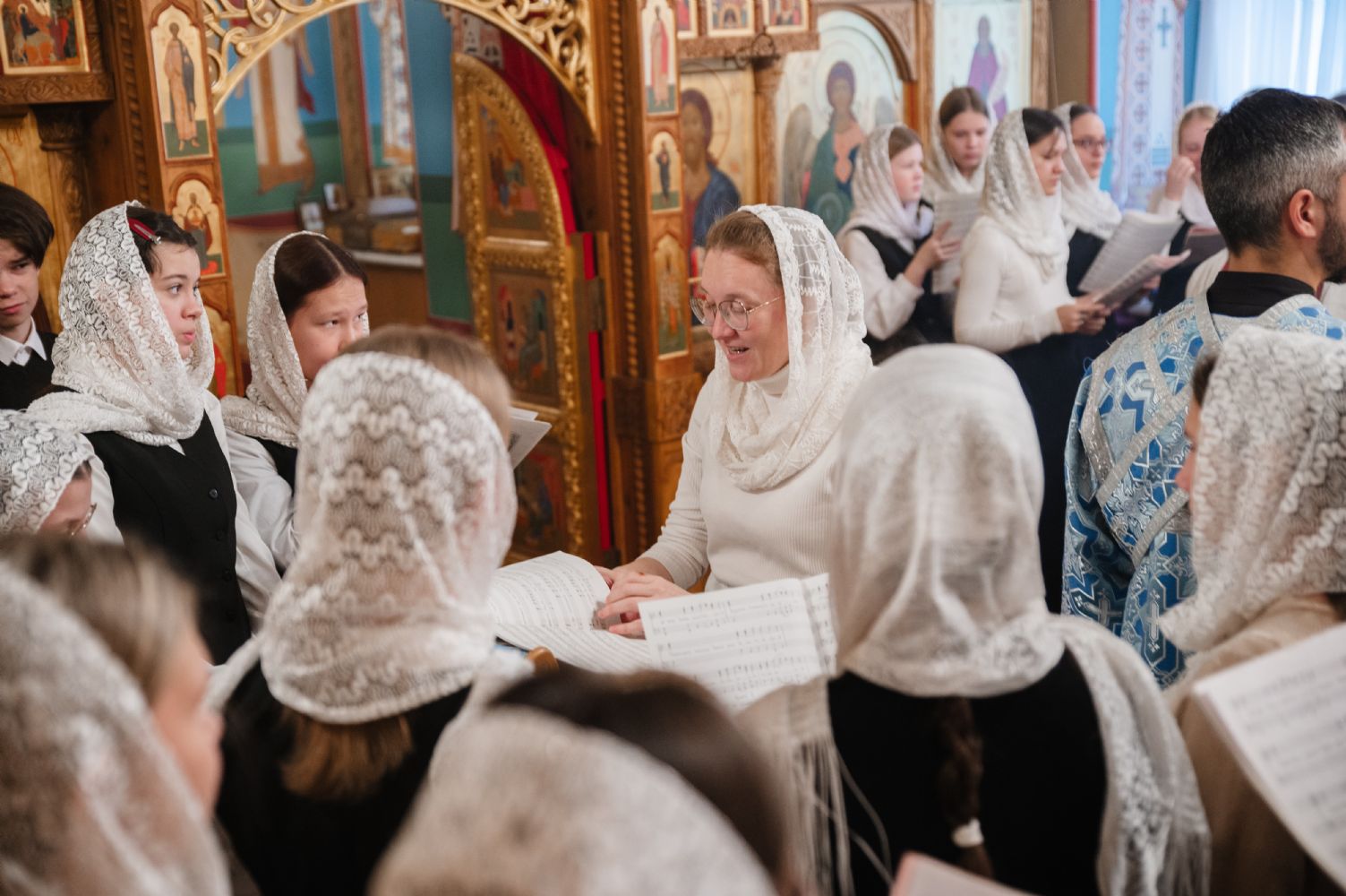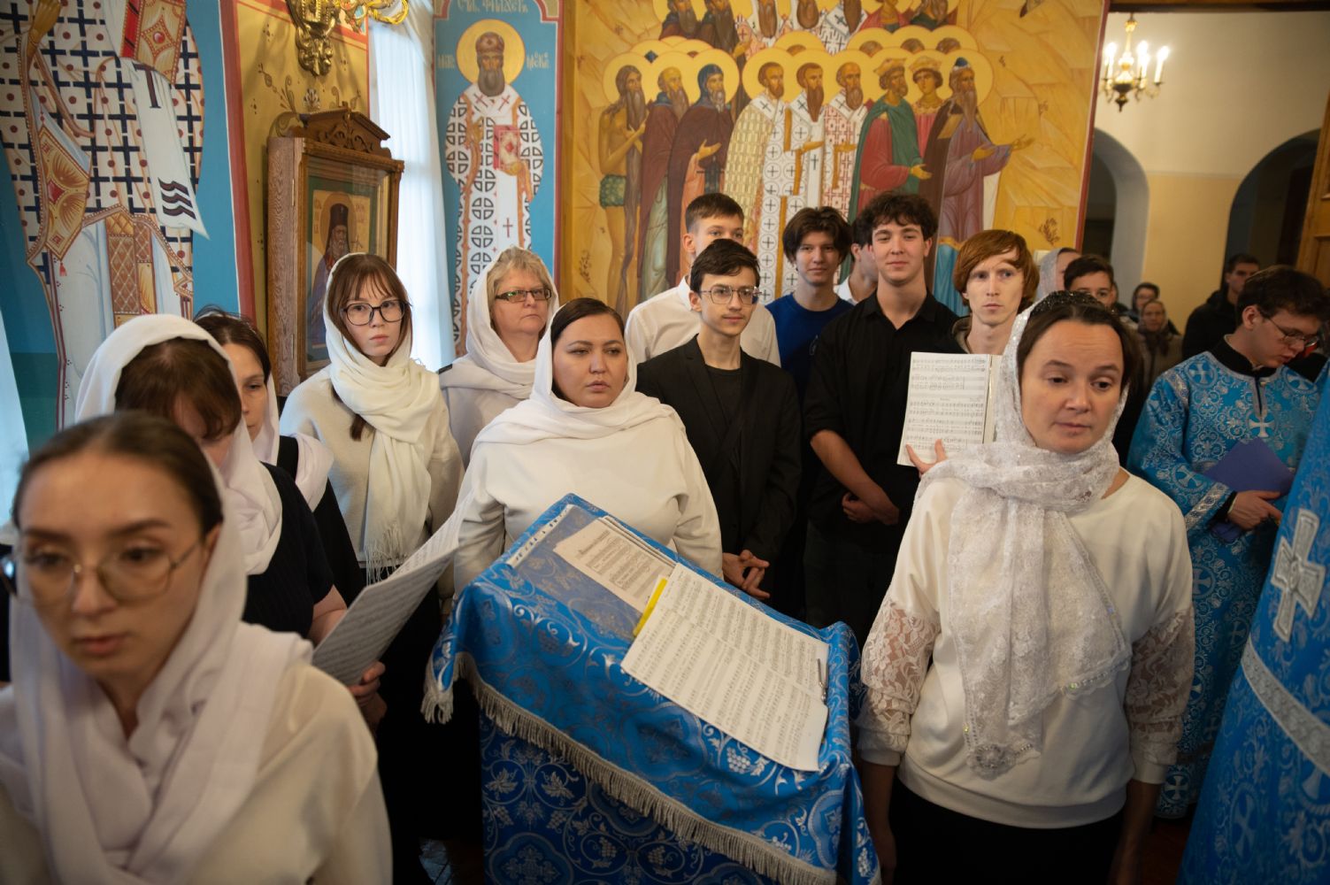 Владыке сослужили духовник старшего состава архиерейского детско-юношеского хора «Благовест», ключарь Благовещенского кафедрального собора протоиерей Сергий Поглазов, духовник младшего состава хора «Благовест», клирик Благовещенского собора иерей Евгений Самойлов и протодиакон Михаил Козловский.