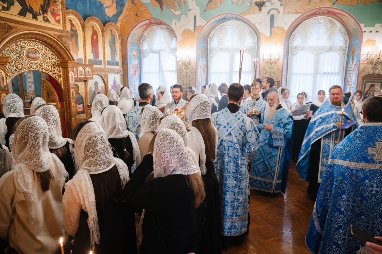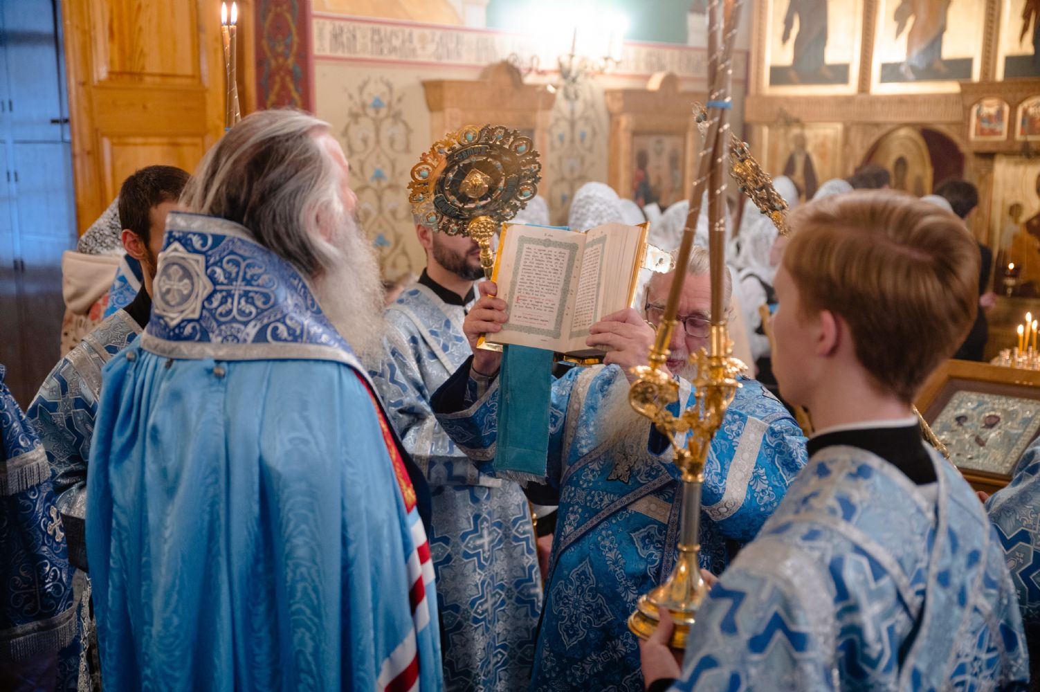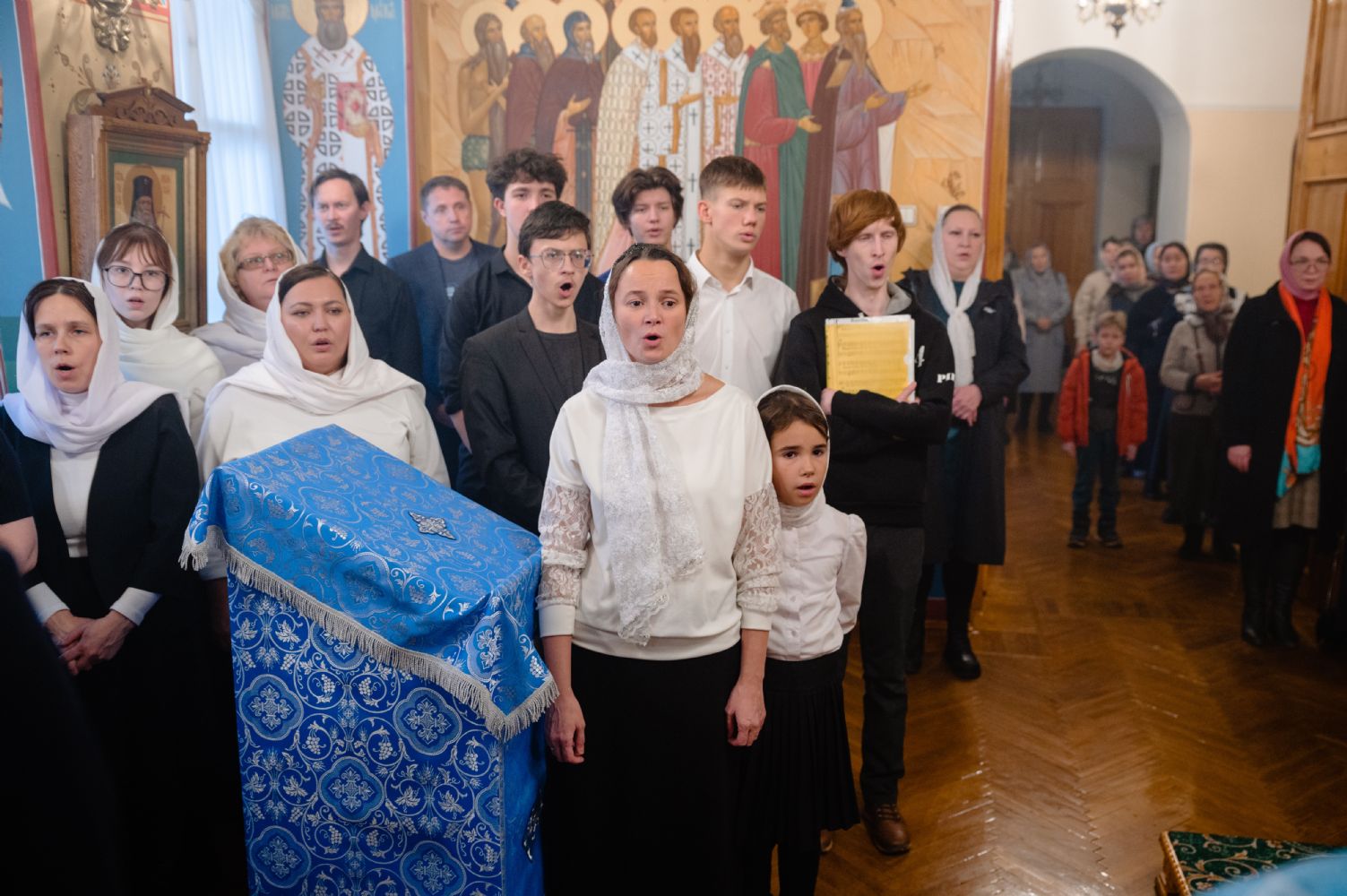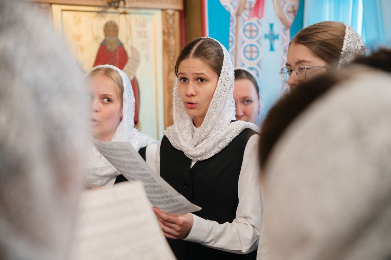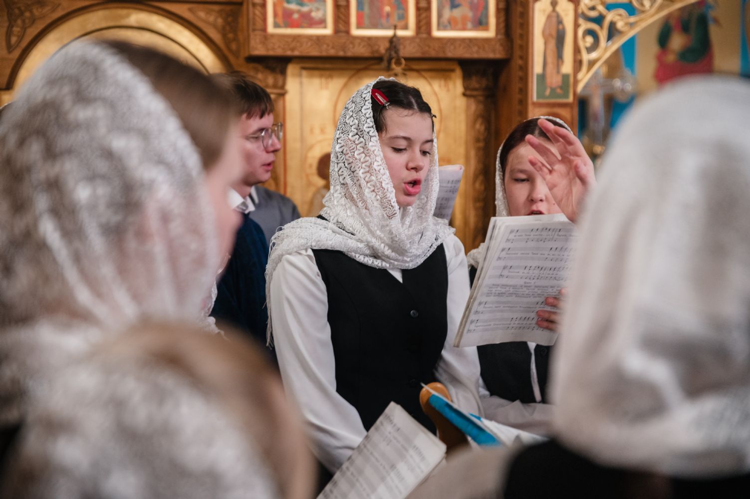 Владыке сослужили духовник старшего состава архиерейского детско-юношеского хора «Благовест», ключарь Благовещенского кафедрального собора протоиерей Сергий Поглазов, духовник младшего состава хора «Благовест», клирик Благовещенского собора иерей Евгений Самойлов и протодиакон Михаил Козловский.