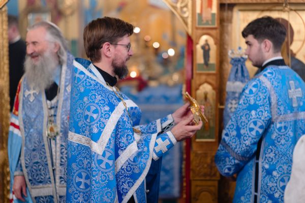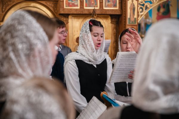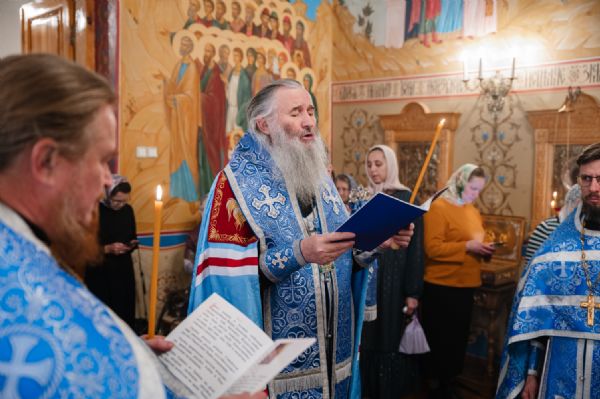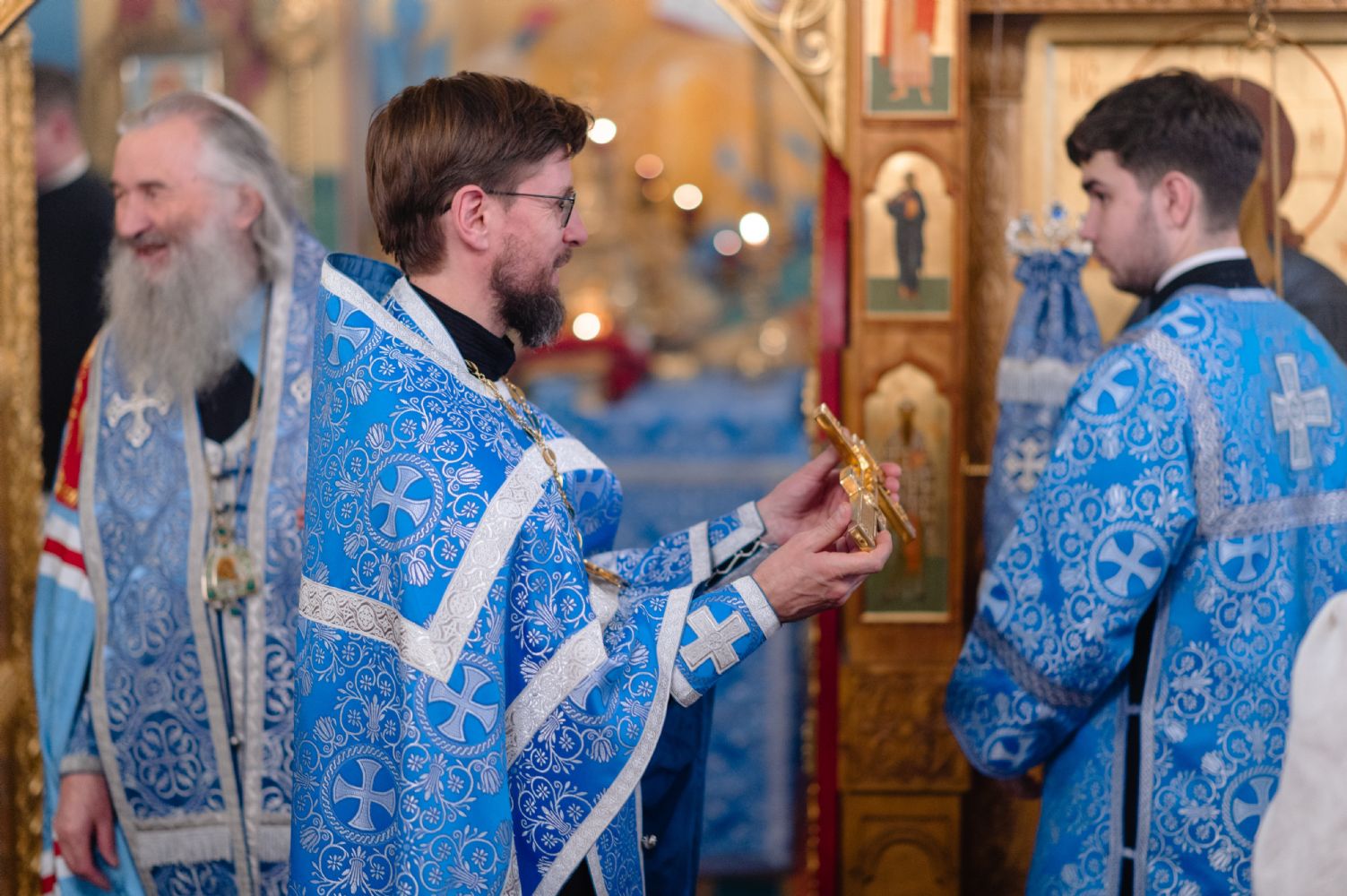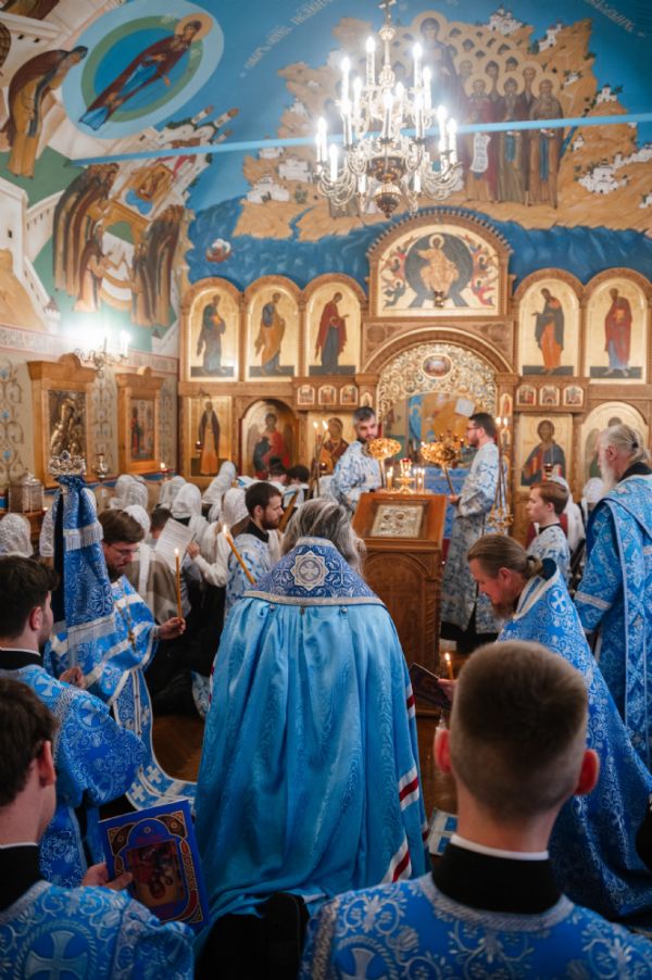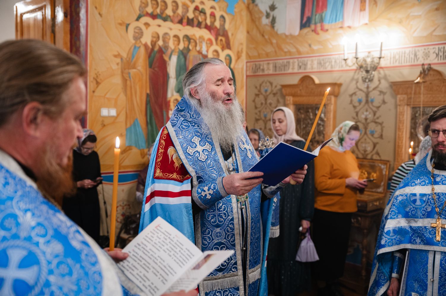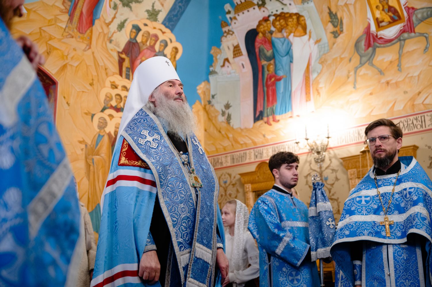 Владыке сослужили духовник старшего состава архиерейского детско-юношеского хора «Благовест», ключарь Благовещенского кафедрального собора протоиерей Сергий Поглазов, духовник младшего состава хора «Благовест», клирик Благовещенского собора иерей Евгений Самойлов и протодиакон Михаил Козловский.