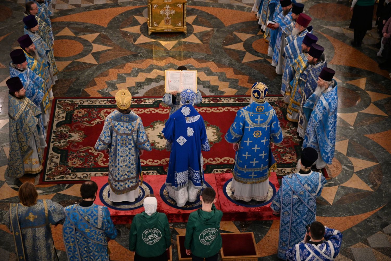 Архипастырям сослужили секретарь Йошкар-Олинского епархиального управления иерей Димитрий Дьяков и клирики Марийской митрополии, владеющие марийским языком. Литургические песнопения на марийском языке исполняли архиерейский хор «Благовест» и сводный хор приходов Горномарийского района.