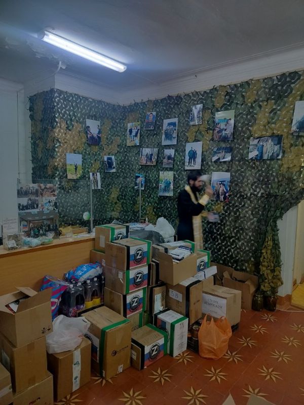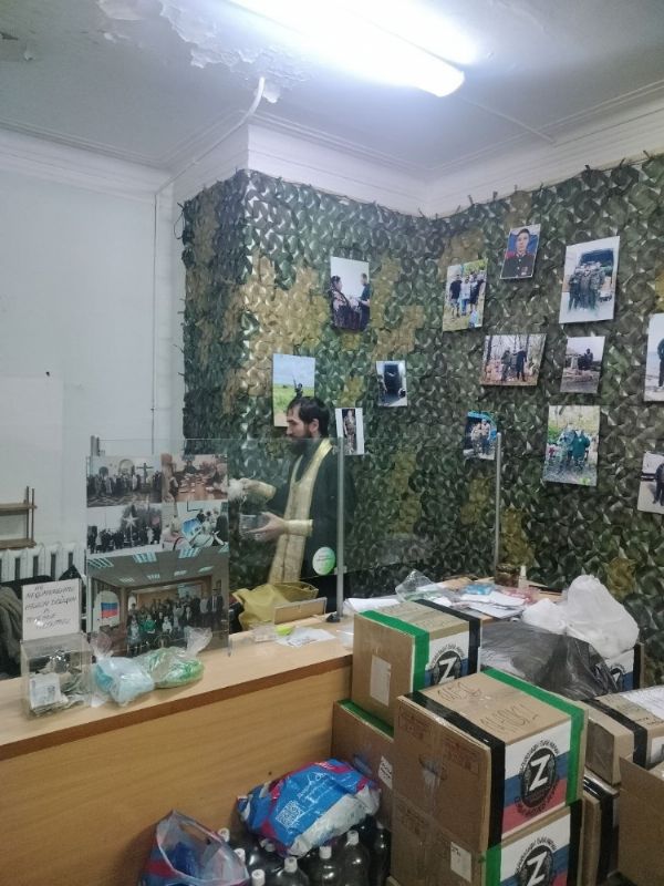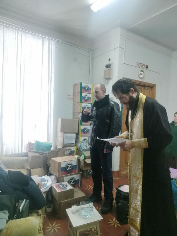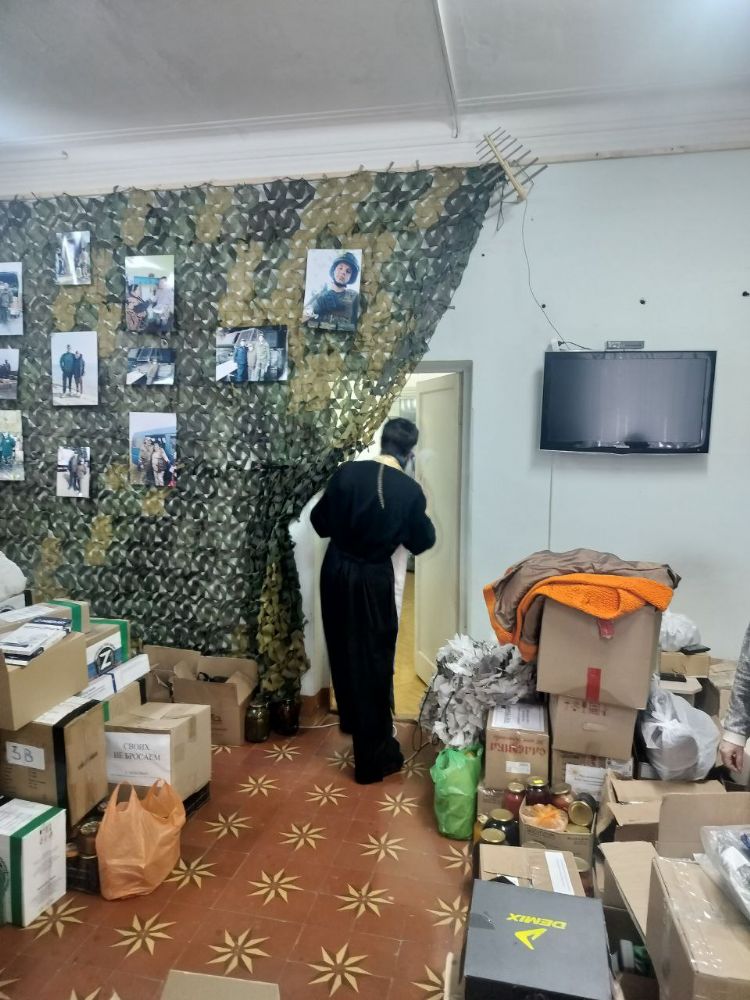 Отец Иоанн окропил святой водой стены помещения и сотрудников-волонтеров, а также коробки с гуманитарным грузом, который отправится к нашим воинам, находящимся на передовой.