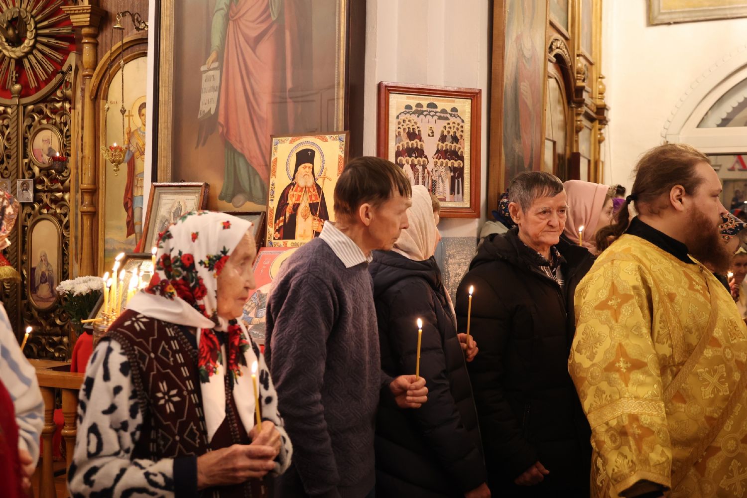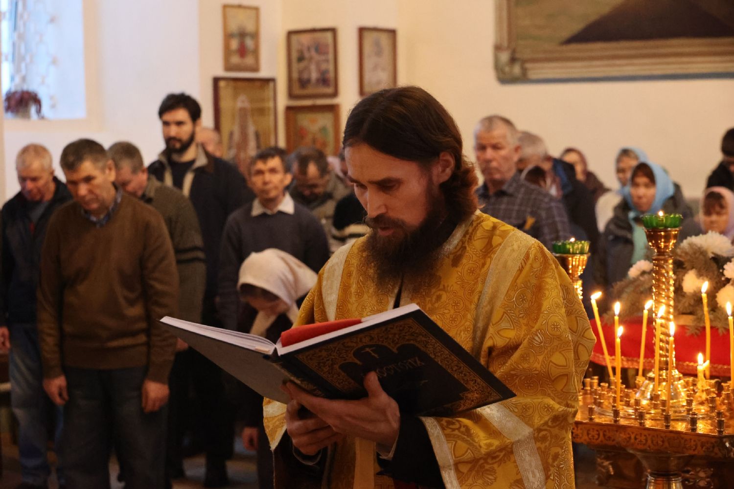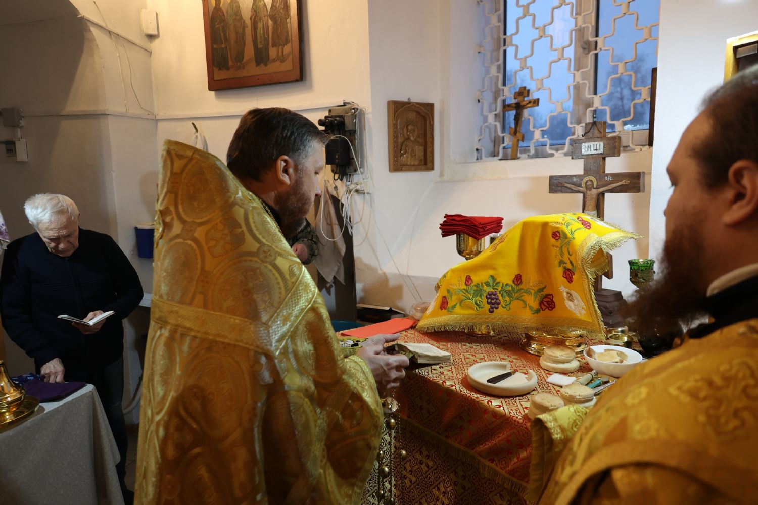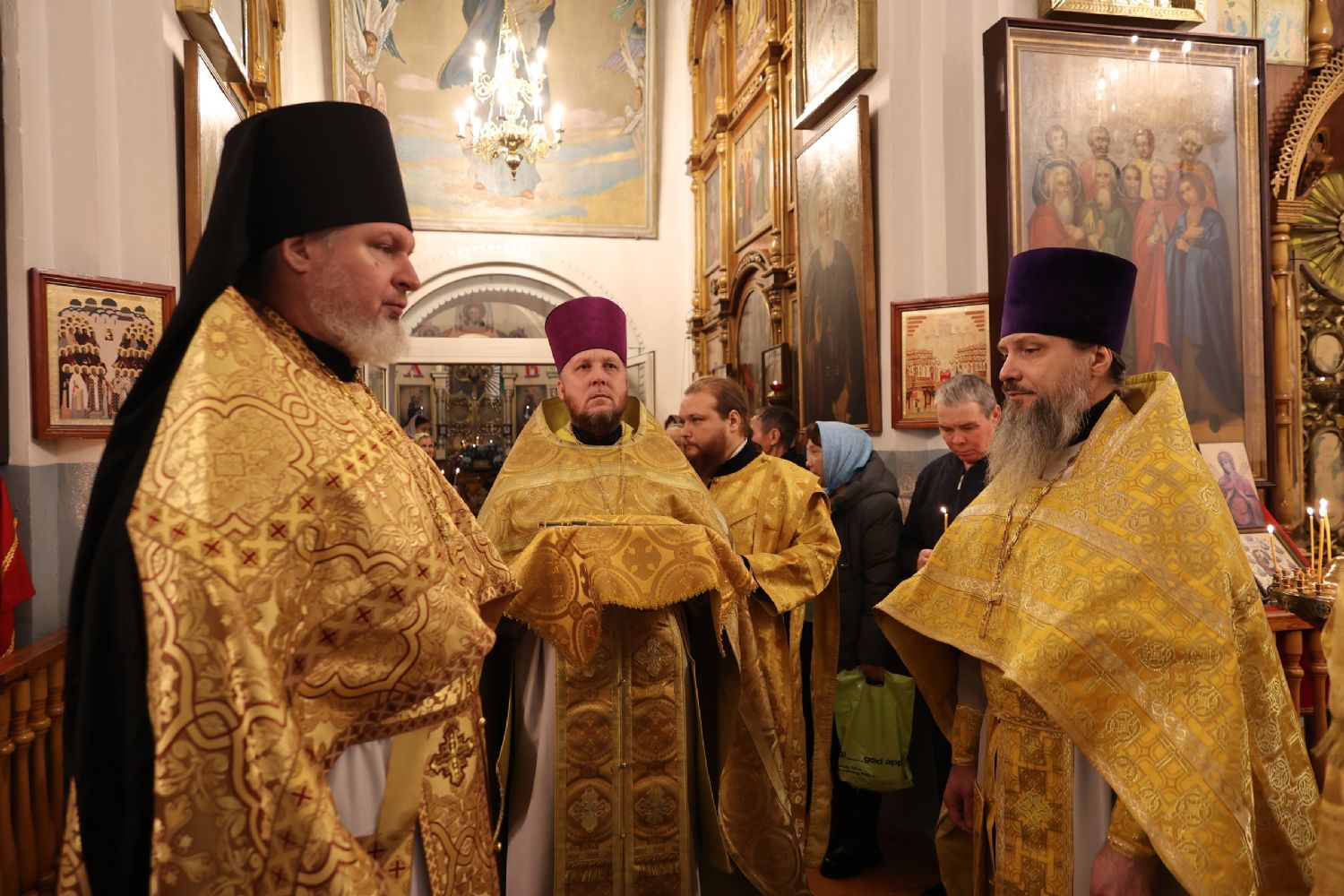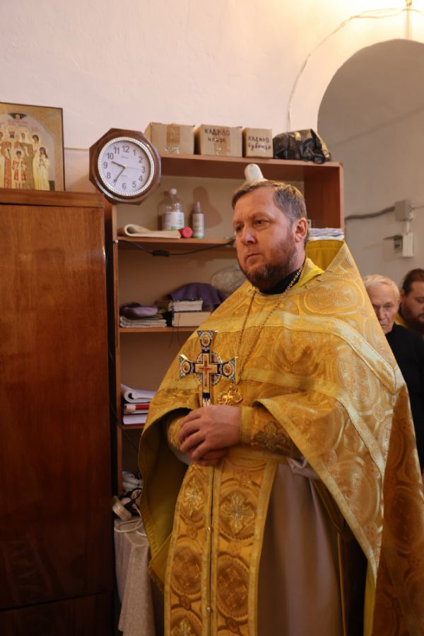 Его Преосвященству сослужили благочинный Волжского церковного округа, клирик храма Новомучеников и исповедников Российских г. Волжска иерей Алексий Скрябин, настоятель храма протоиерей Евгений Бакутов и клирики Никольского кафедрального собора г. Волжска иеромонах Александр (Чеборов) и диакон Иоанн Захаров. Песнопения исполнял хор храма Новомучеников и исповедников Российских г. Волжска под управлением регента Марии Захаровой.