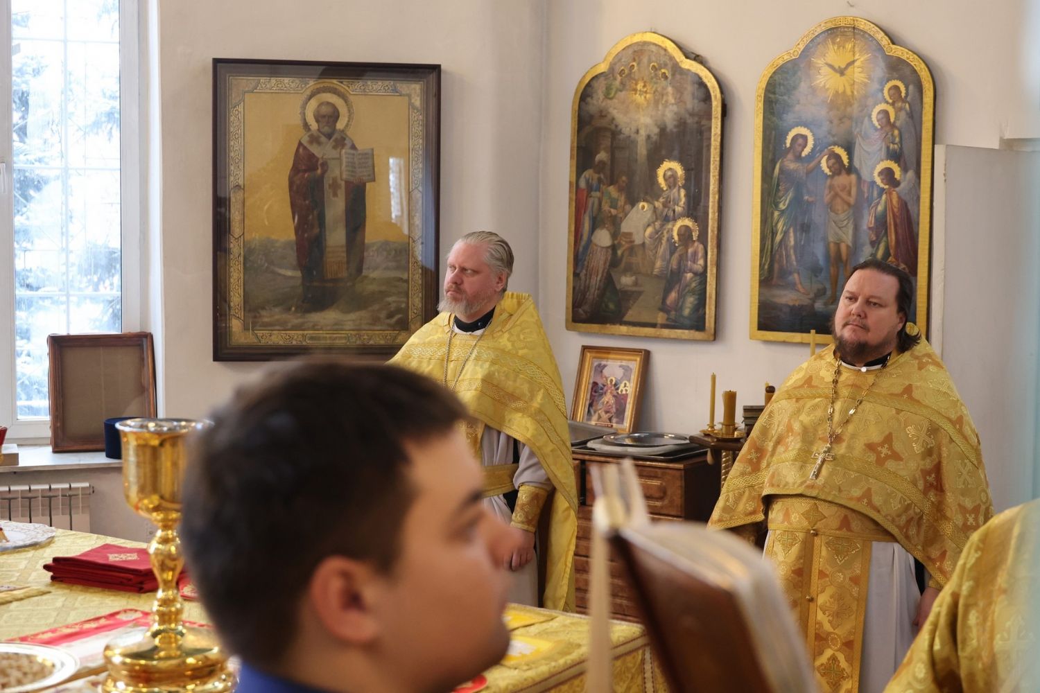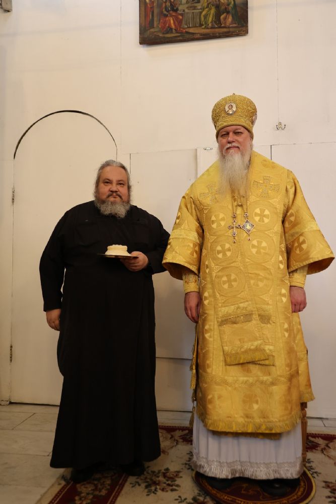 После Причащения священнослужителей Святых Христовых Таин в алтаре владыка Феофан поздравил иеродиакона Спиридона (Холмовского) с днем небесного покровителя.