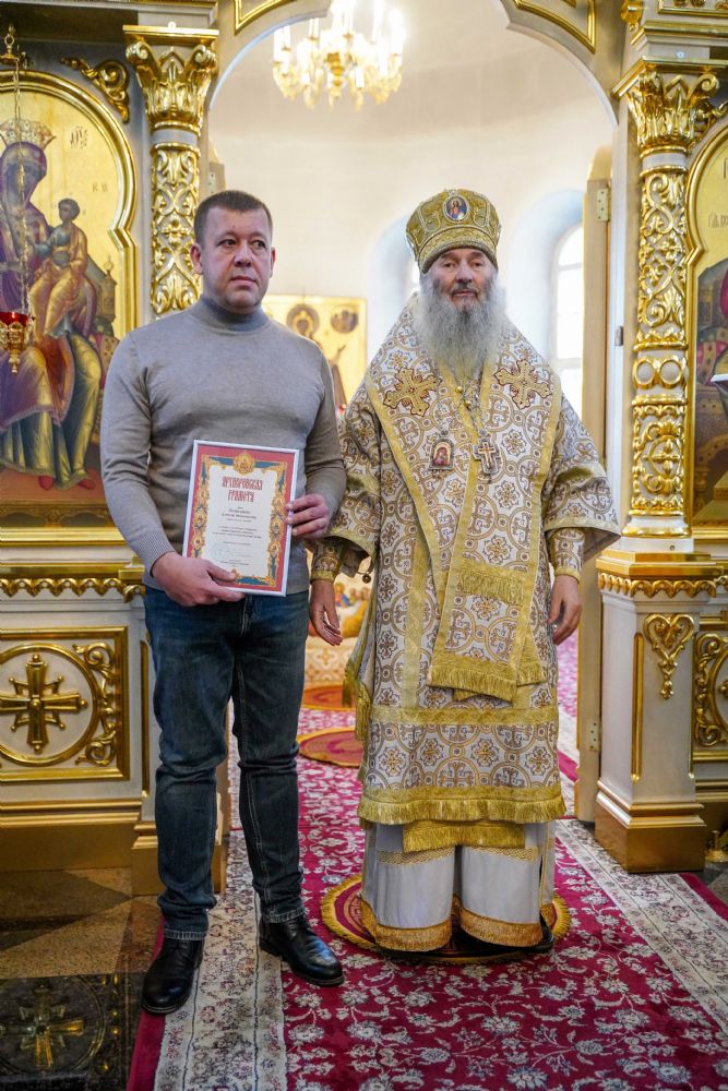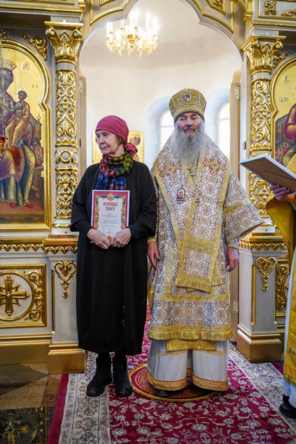 В завершение богослужения митрополит Иоанн вручил награды в связи с 10-летием освящения храма Рождества Христова. Архиерейских грамот за активное участие в приходской жизни удостоены директор воскресной школы храма Шареева Светлана Александровна и директор фирмы «Эридиан» Полевщиков Алексей Николаевич. Благодарственные письма за подписью правящего архиерея за многолетний добросовестный труд получили повар трапезной храма Мельникова Елена Анатольевна и помощник настоятеля храма Ягодаров Андрей Витальевич.