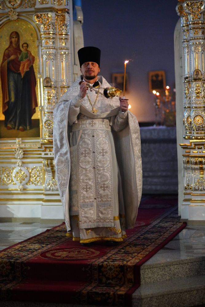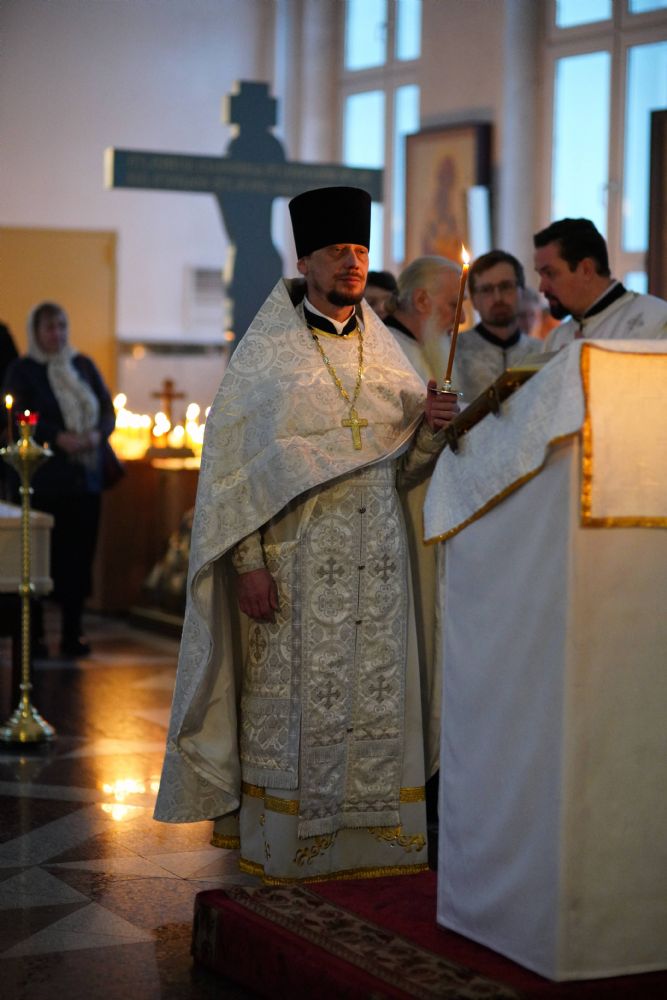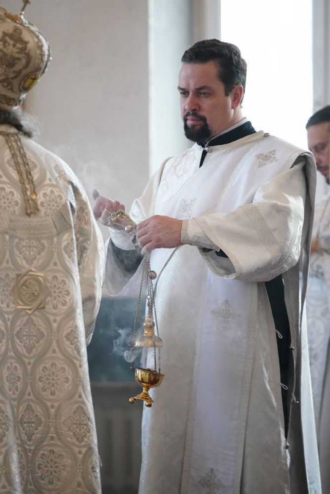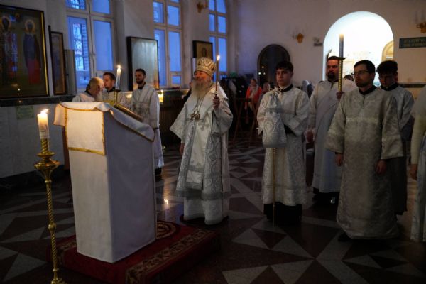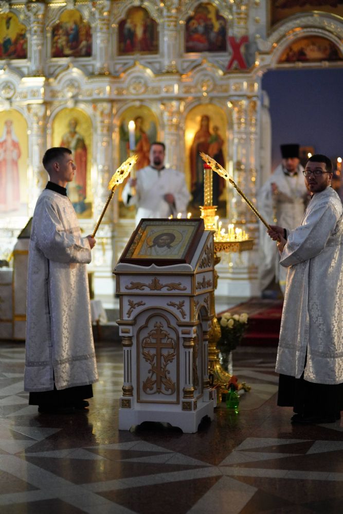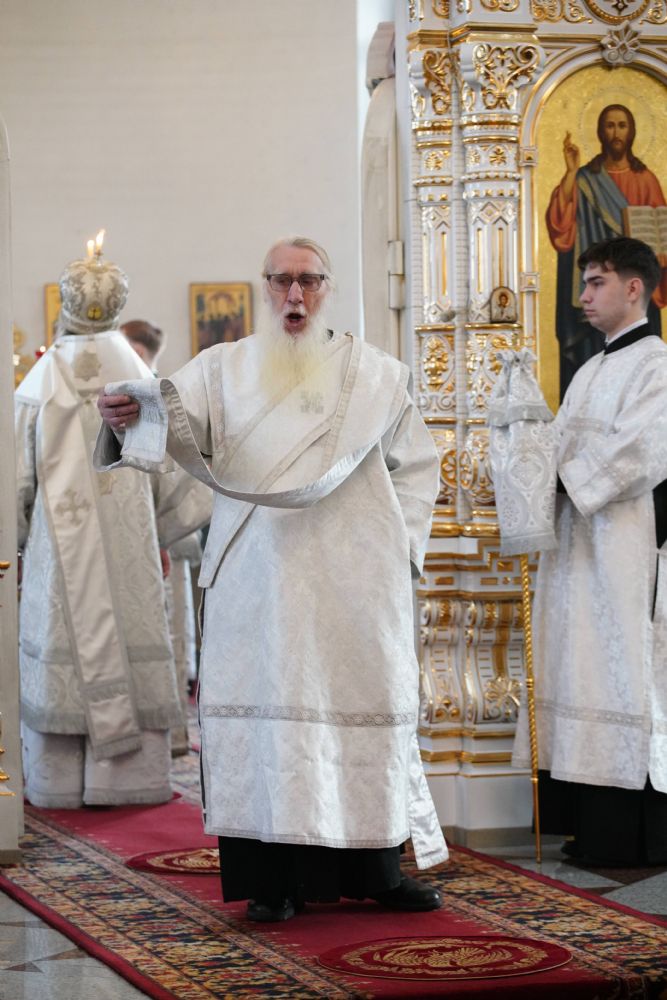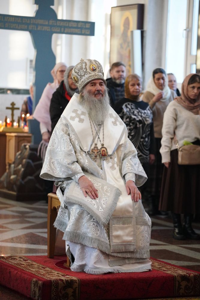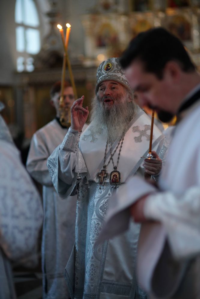 Владыке сослужили настоятель собора иерей Андрей Кочаков, клирики собора иерей Димитрий Лукьянов и диакон Алексий Кузнецов, а также протодиакон Михаил Козловский. Песнопения исполнял хор собора под управлением Алисы Вылегжаниной.