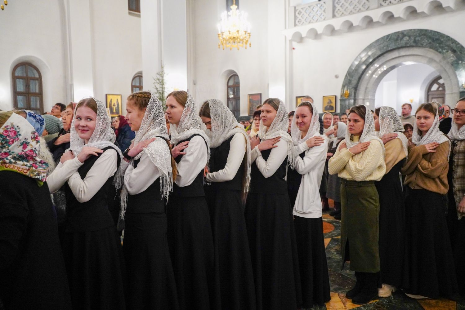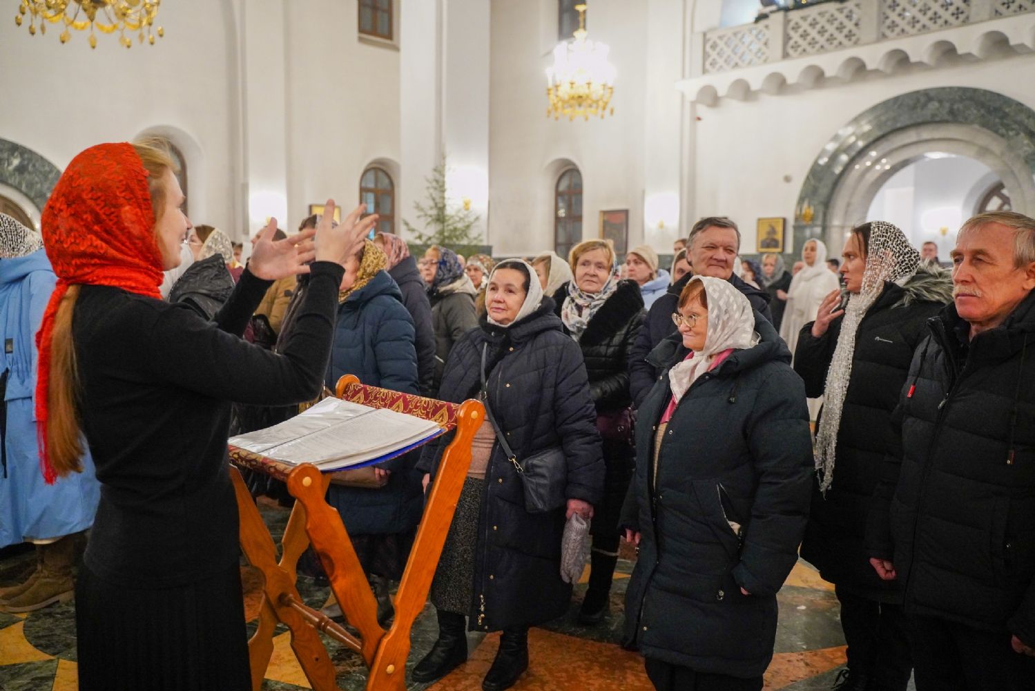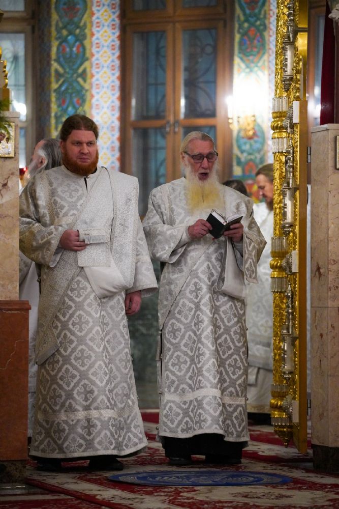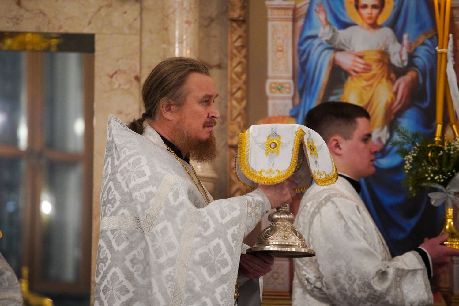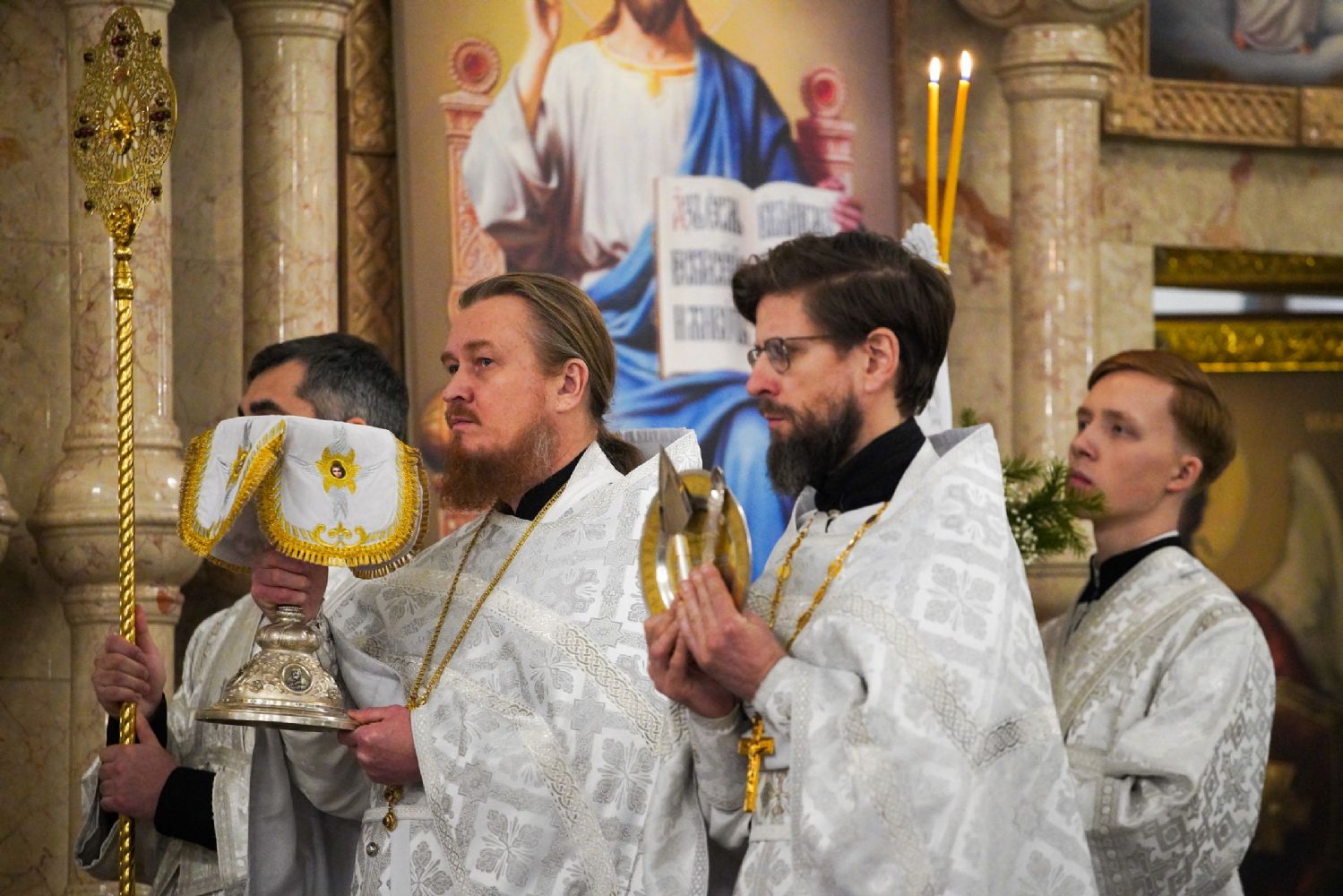 Владыке сослужили ключарь собора протоиерей Сергий Поглазов, клирики собора иереи Никифор Захаров, Евгений Самойлов, диаконы Андрей Дружинин и Артемий Бобоч, а также протодиакон Михаил Козловский. Песнопения исполняли старший и младший составы детско-юношеского хора «Благовест» под управлением регентов Татьяны Черновой и Надежды Поздеевой.