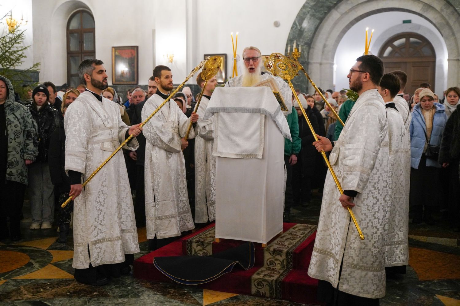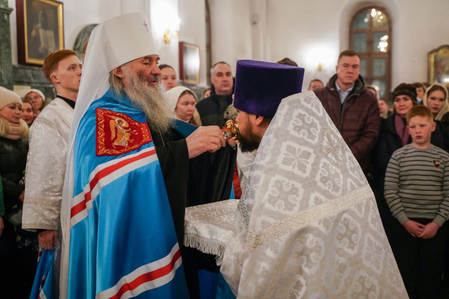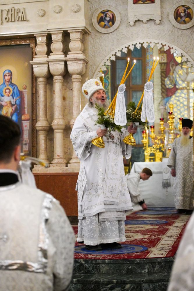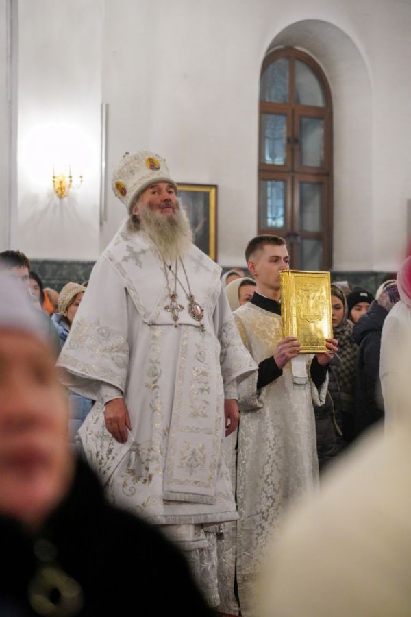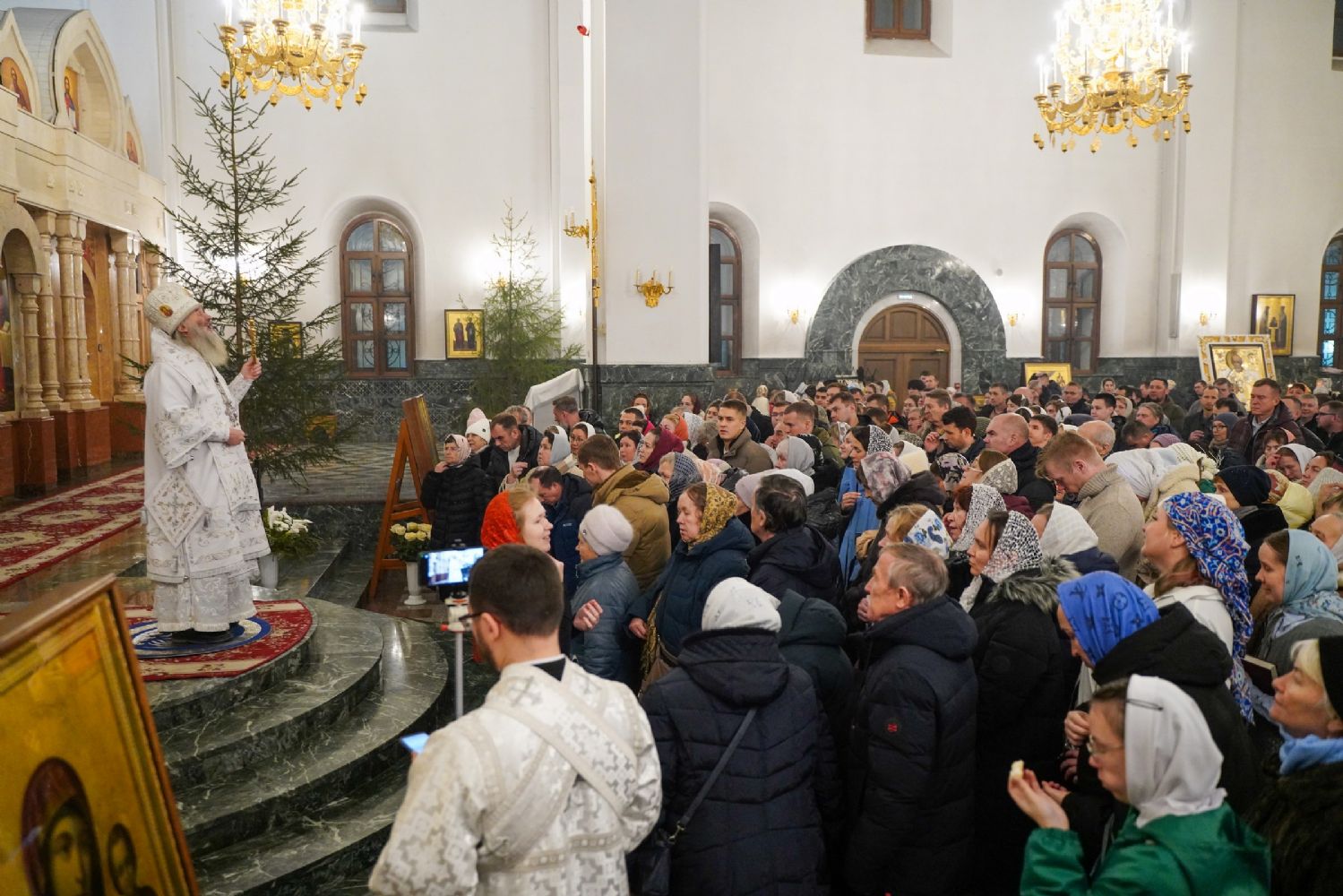 Владыке сослужили ключарь собора протоиерей Сергий Поглазов, клирики собора иереи Никифор Захаров, Евгений Самойлов, диаконы Андрей Дружинин и Артемий Бобоч, а также протодиакон Михаил Козловский. Песнопения исполняли старший и младший составы детско-юношеского хора «Благовест» под управлением регентов Татьяны Черновой и Надежды Поздеевой.