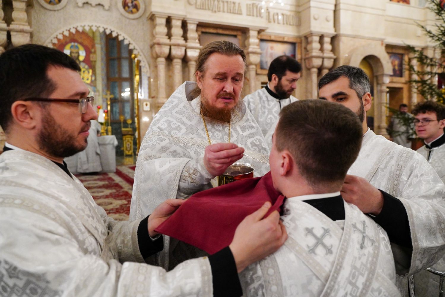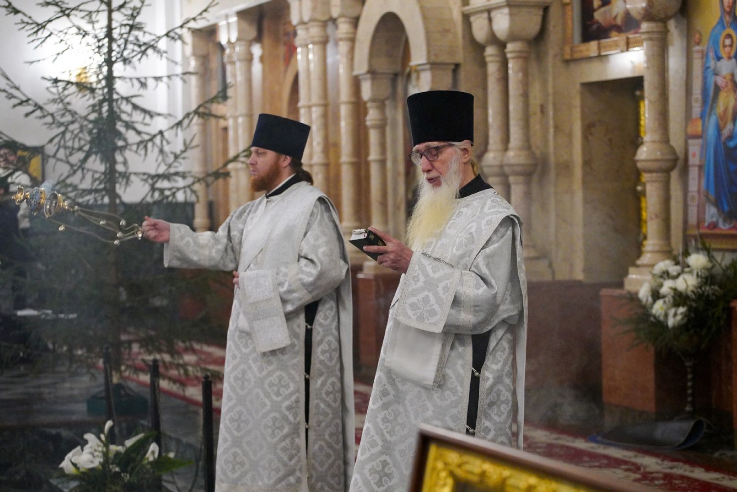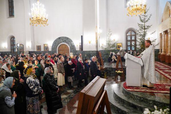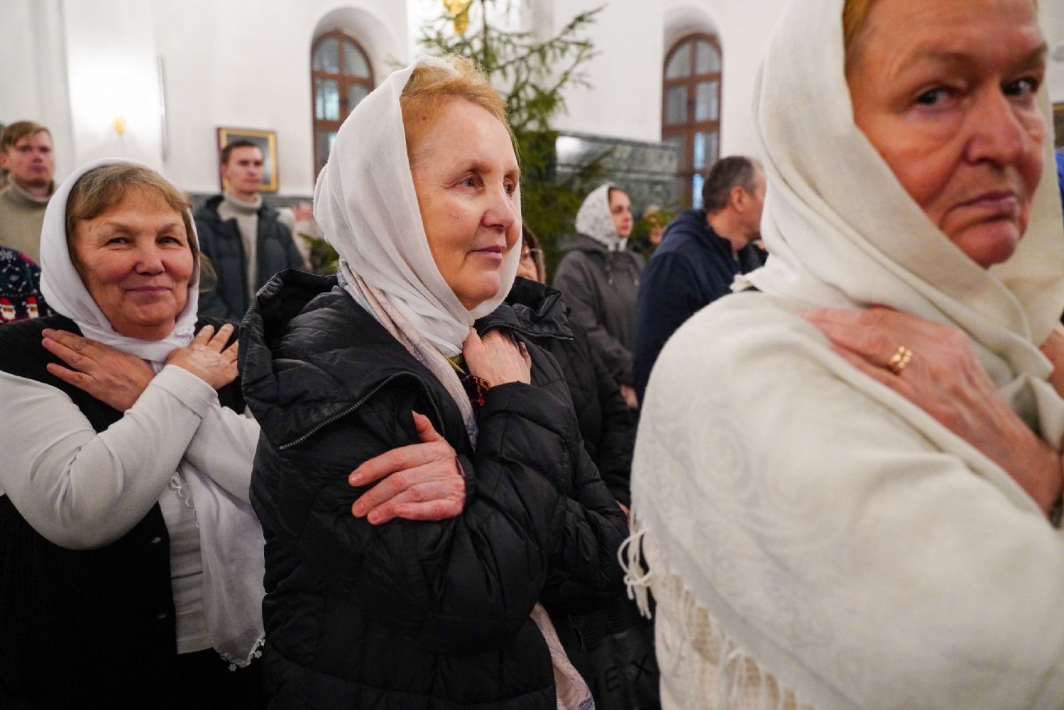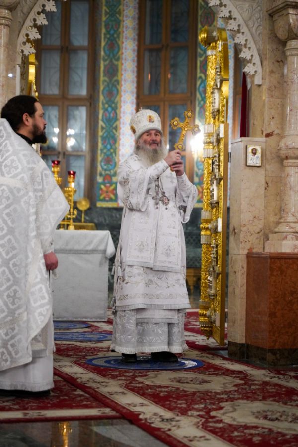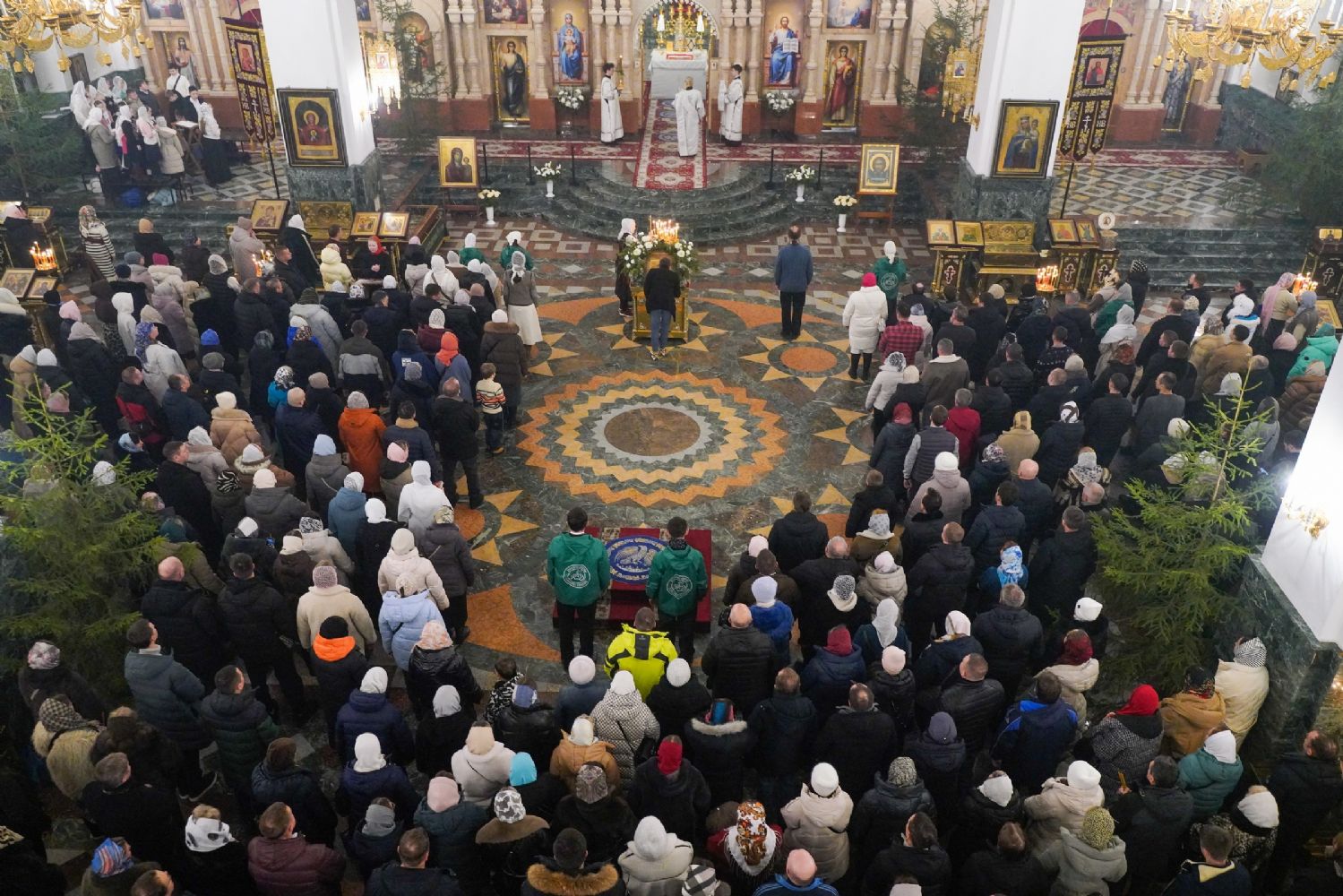 Владыке сослужили ключарь собора протоиерей Сергий Поглазов, клирики собора иереи Никифор Захаров, Евгений Самойлов, диаконы Андрей Дружинин и Артемий Бобоч, а также протодиакон Михаил Козловский. Песнопения исполняли старший и младший составы детско-юношеского хора «Благовест» под управлением регентов Татьяны Черновой и Надежды Поздеевой.