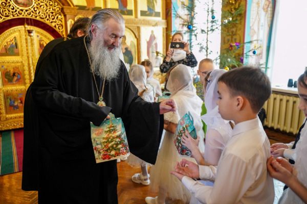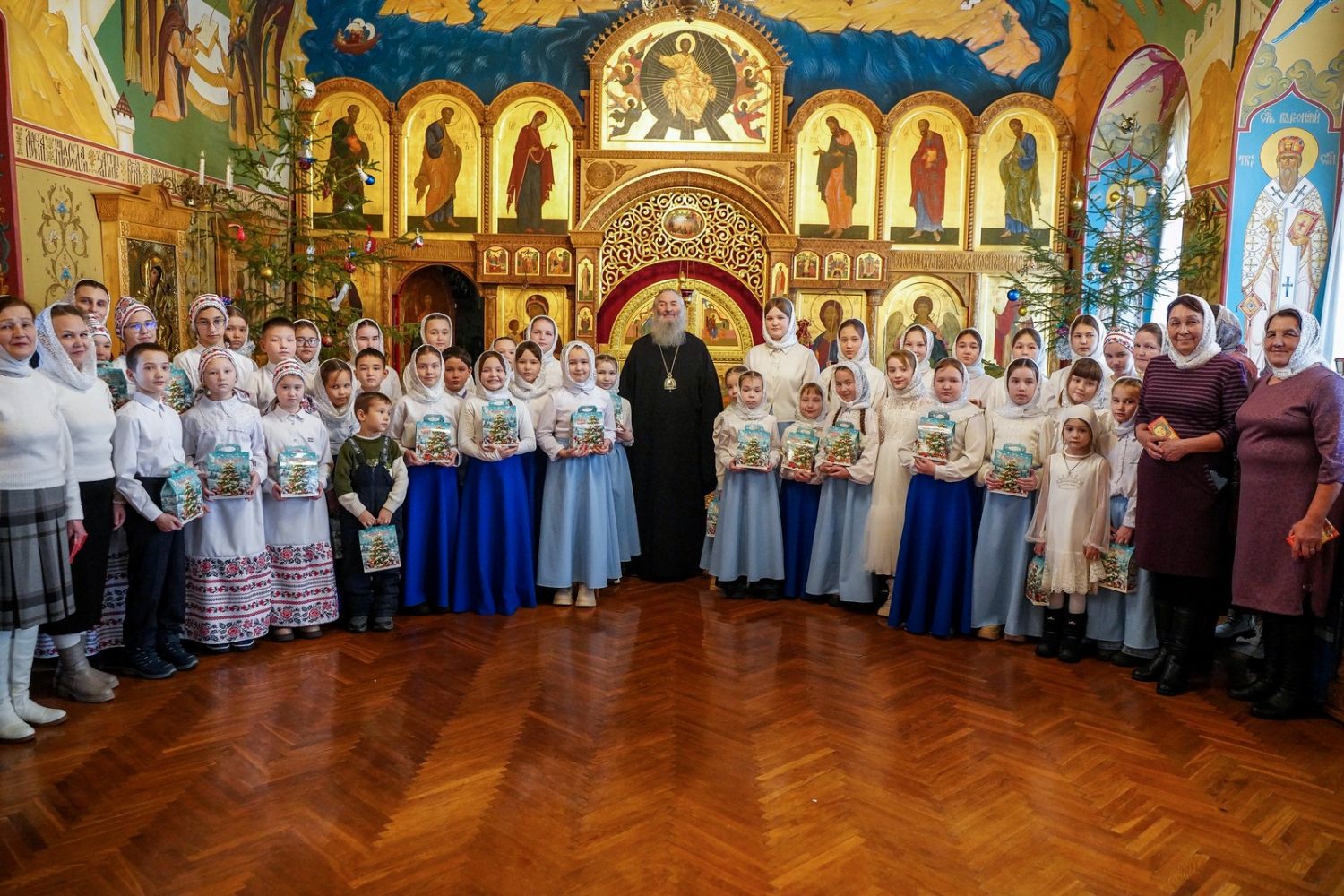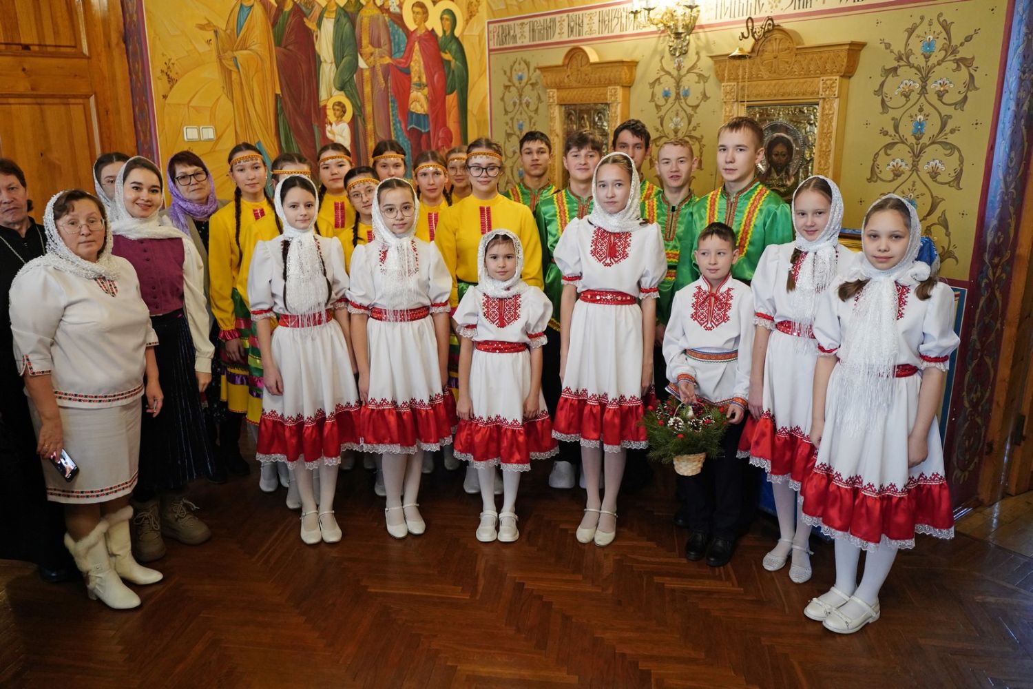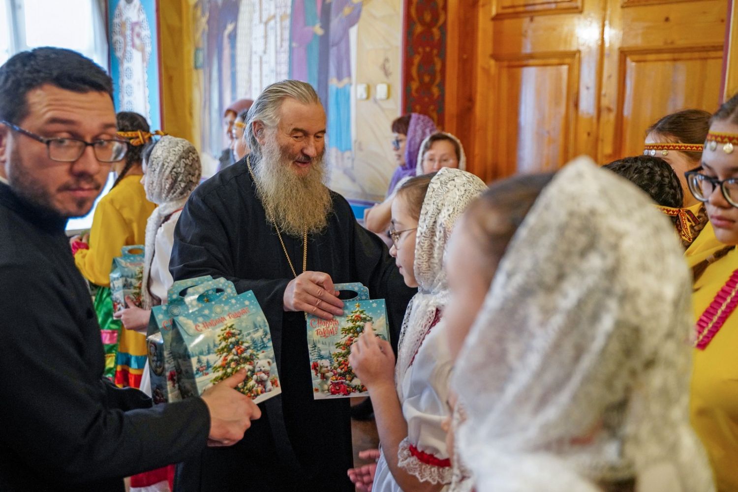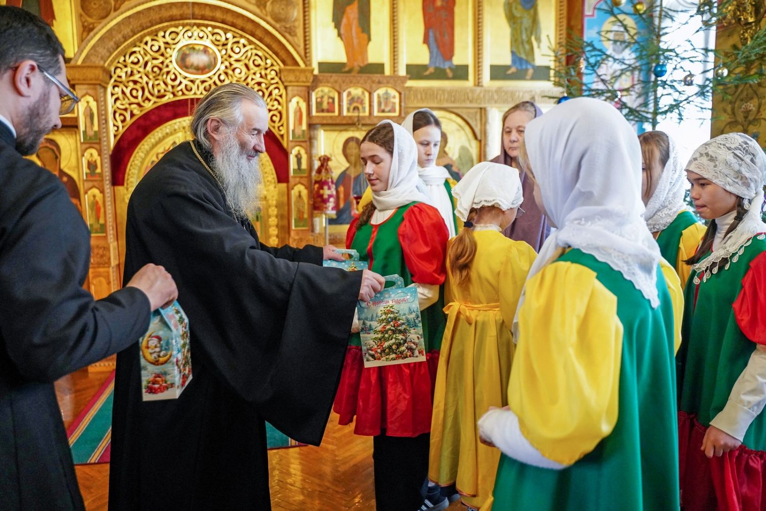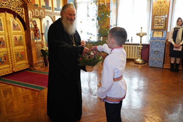 А после обеда детские коллективы с руководителями и священниками сельских храмов отправились в Йошкар-Олинское епархиальное управление поздравлять митрополита Иоанна со светлым праздником. Делясь радостью о Рождшемся Богомладенце, ребята исполнили колядки, рождественские песни и стихи, а владыка вручил детям сладкие подарки.
