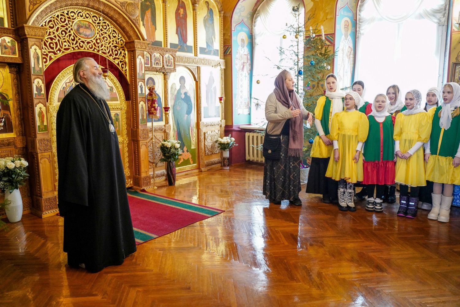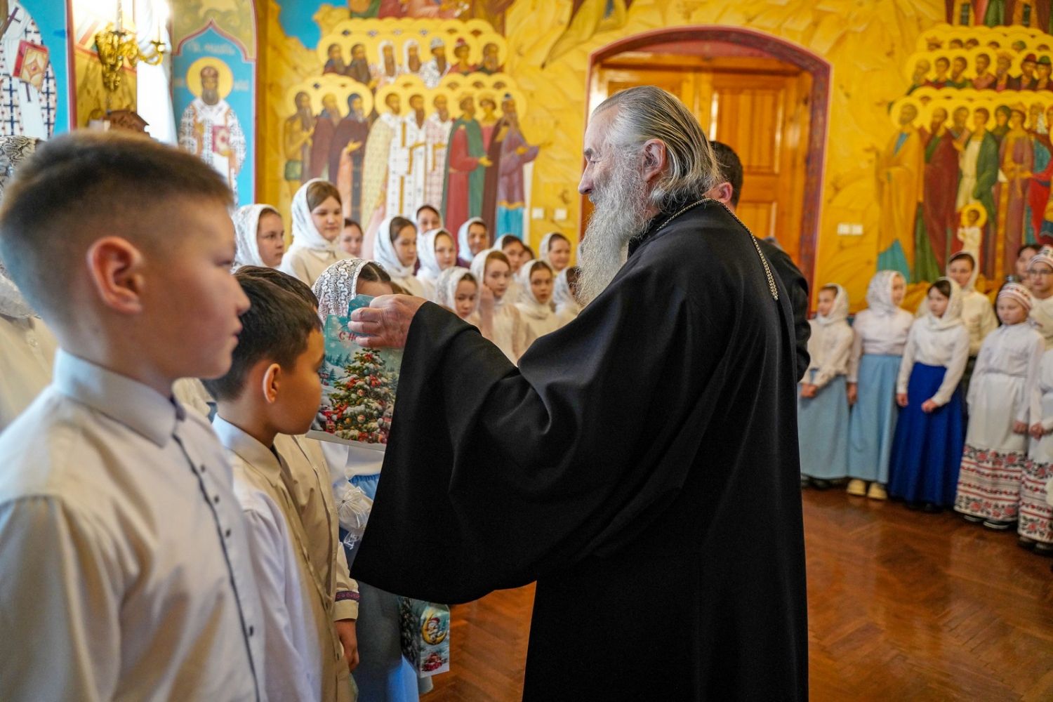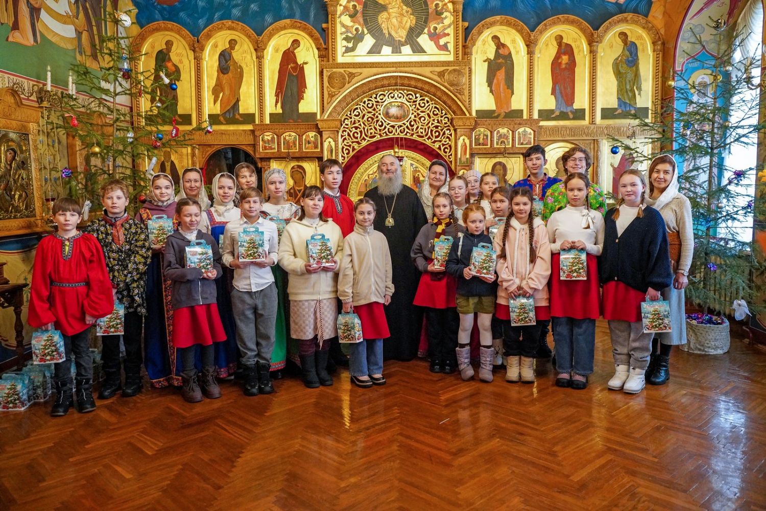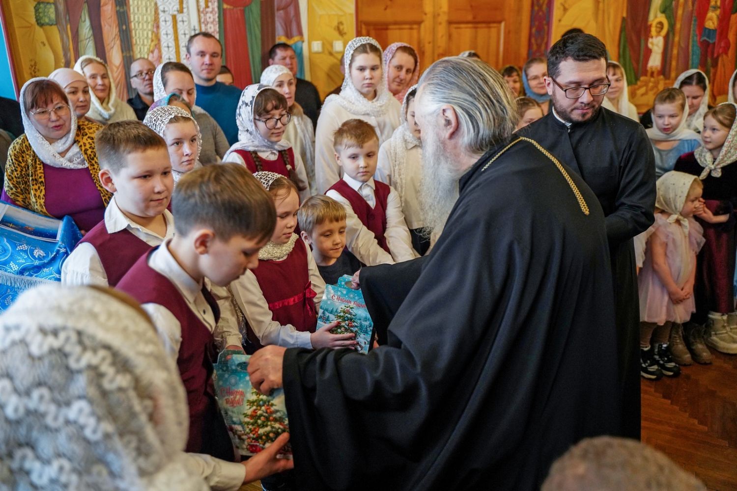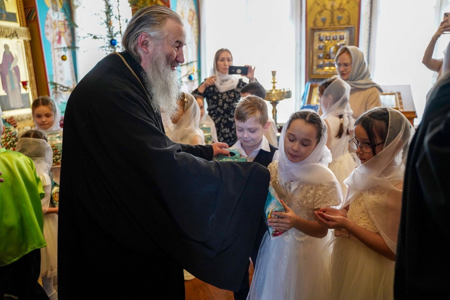 А после обеда детские коллективы с руководителями и священниками сельских храмов отправились в Йошкар-Олинское епархиальное управление поздравлять митрополита Иоанна со светлым праздником. Делясь радостью о Рождшемся Богомладенце, ребята исполнили колядки, рождественские песни и стихи, а владыка вручил детям сладкие подарки.